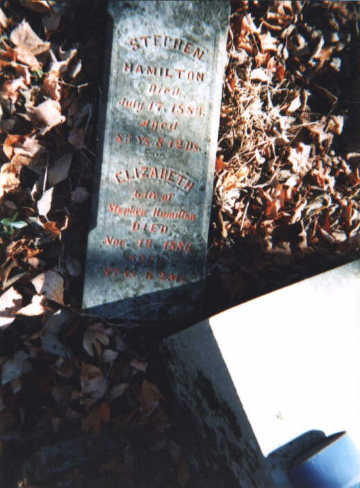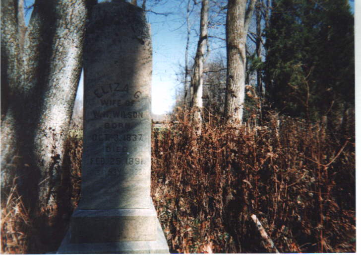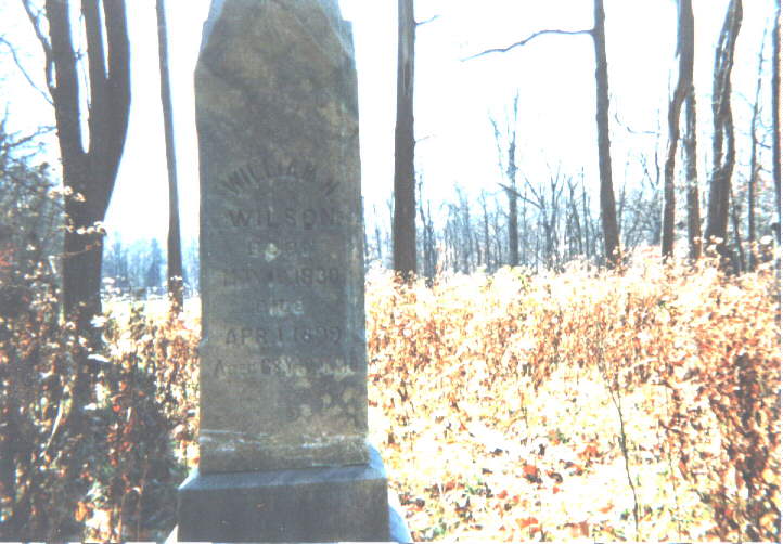 | BULY , Sevannah | | [Savannah Wilson Bailey] w/o John Headstone | DICKEY, Thomas H. | s/o J. & N.A. | HAMILTON, Stephen | aged 85 yr 12 days Headstone | HAMILTON, Elizabeth | w/o Stephen, aged 87 yr 2 mon Headstone | HAMILTON, Jesse | aged 22 yr 5 mon 8 days | SMITH, Edward | SMITH, Mary | d/o Edward & Amanda, aged 9 yr Headstone | TATE, Barnabas | Headstone | WILLIS, Thomas E. | s/o B.F. & N.A., aged 9 mon 5 days | WILSON, Oscar | Headstone | WILSON, Elizabeth | w/o Oscar, Headstone | WILSON, William | s/o Oscar & Elizabeth, Additional marker with "H.W." | WILSON, Nancy | w/o James, Headstone | WILSON, James | WILSON, Agnes H. | d/o W.H. & Eliza, aged 1 yr 10 mon | WILSON, Eliza Ann | Headstone | WILSON, Ephriam | aged 93 yr 8 mon 4 days | Headstone Read his Rev War Pension WILSON, Catherine | w/o Ephriam, aged 58 yr 8 mon 26 days, Headstone | WILSON, William H. | Headstone | WILSON, Eliza G. Flanagan | w/o Wm. H. Headstone | WILSON, Drusilla | w/o Ephriam Wilson, aged 69 yr 8 mon 17 days Headstone | |
