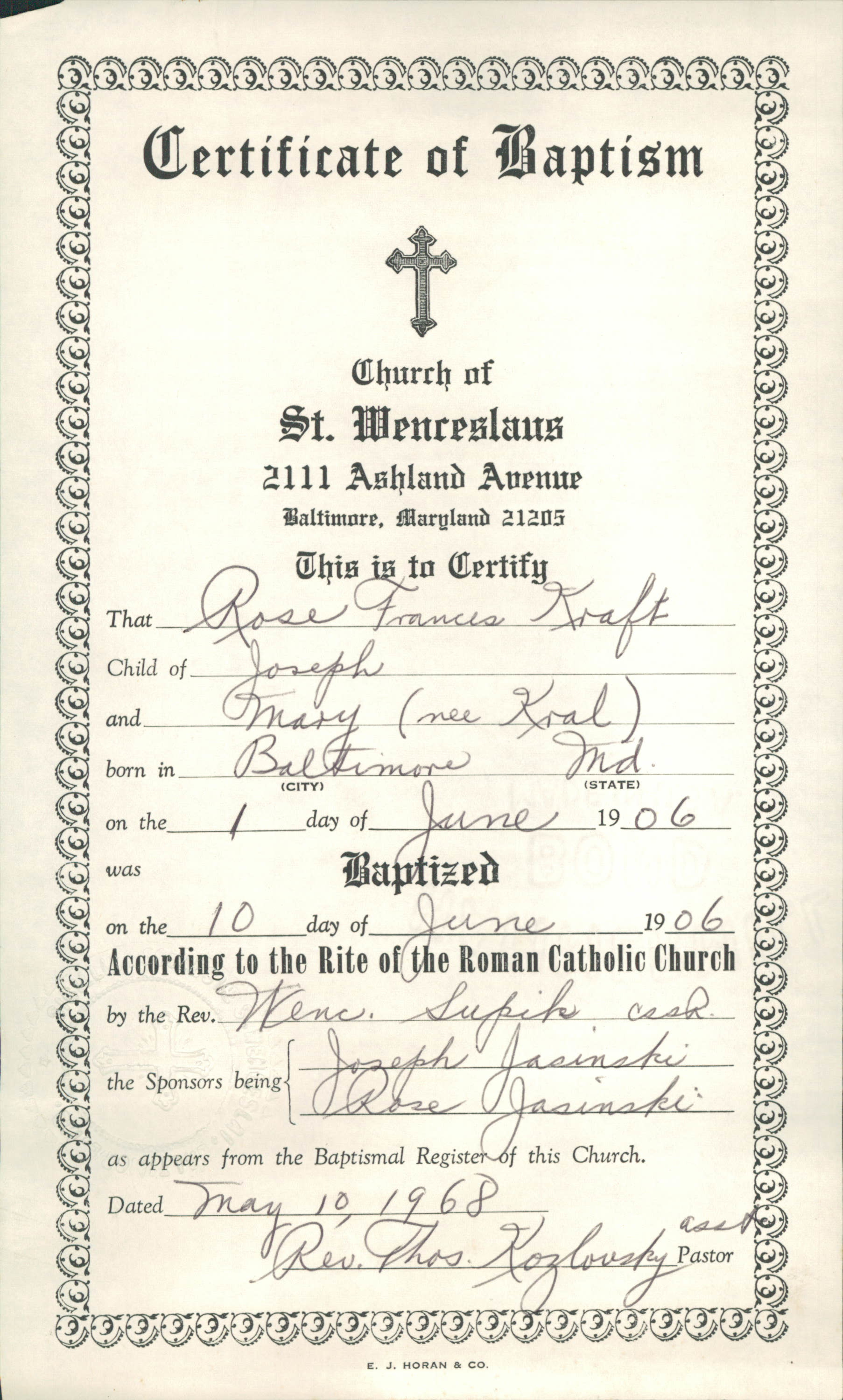 Rose Frances Kraft Baptism Certificate