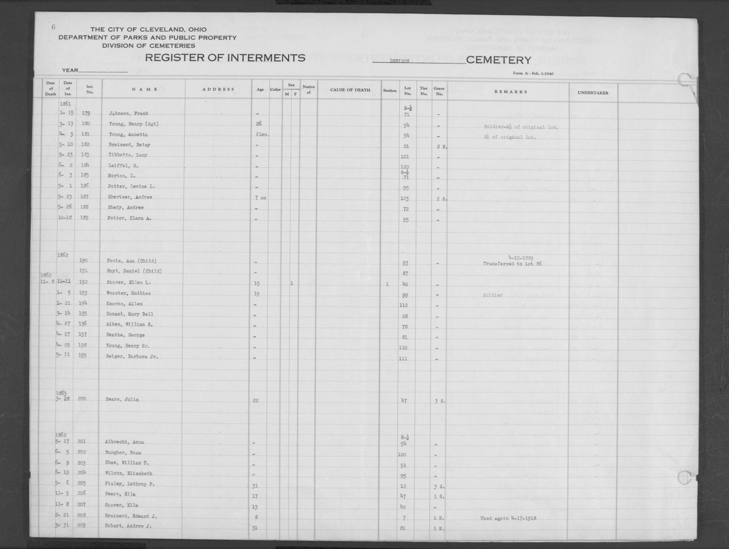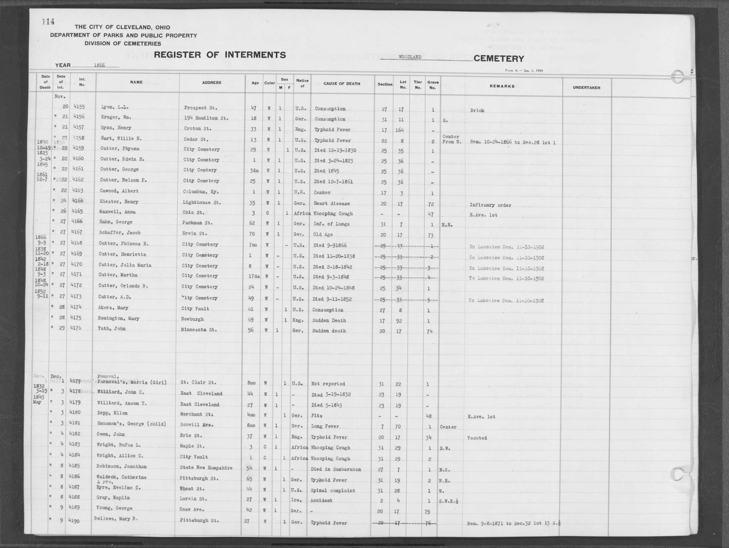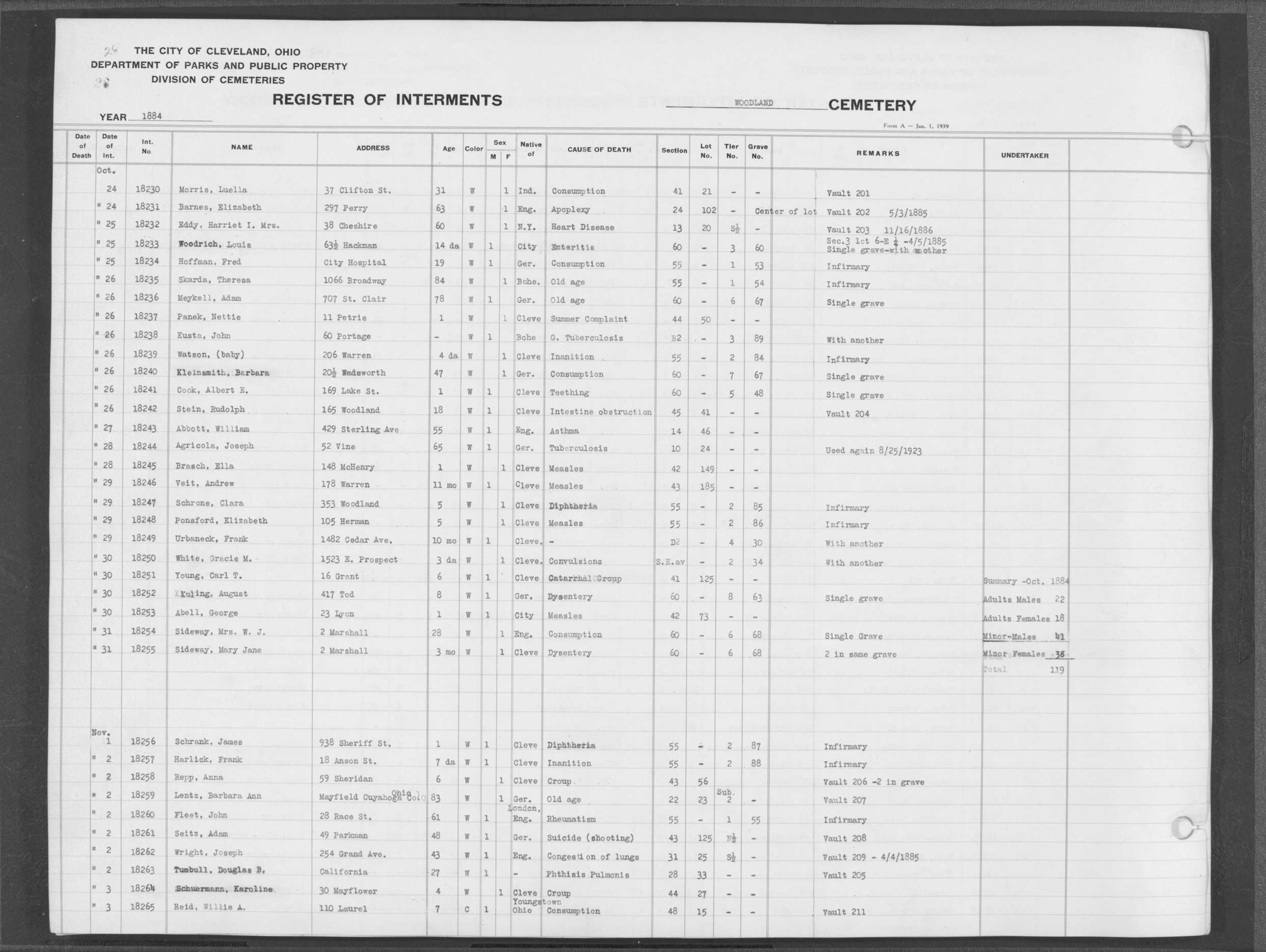| Scranton Road | 1 | 51 | Aug | 3 | 1886 | Albert, | 29d | W | M | |||||