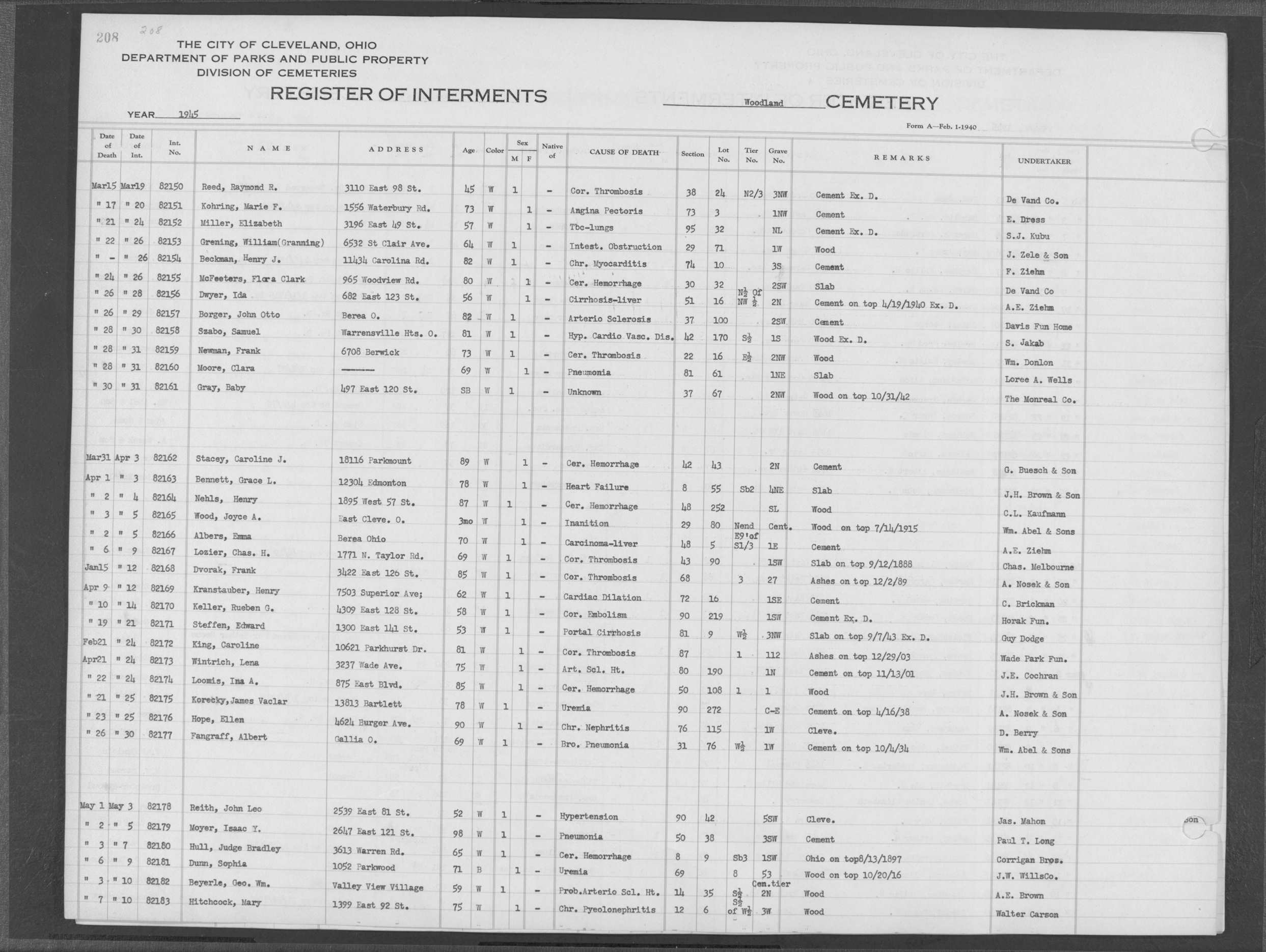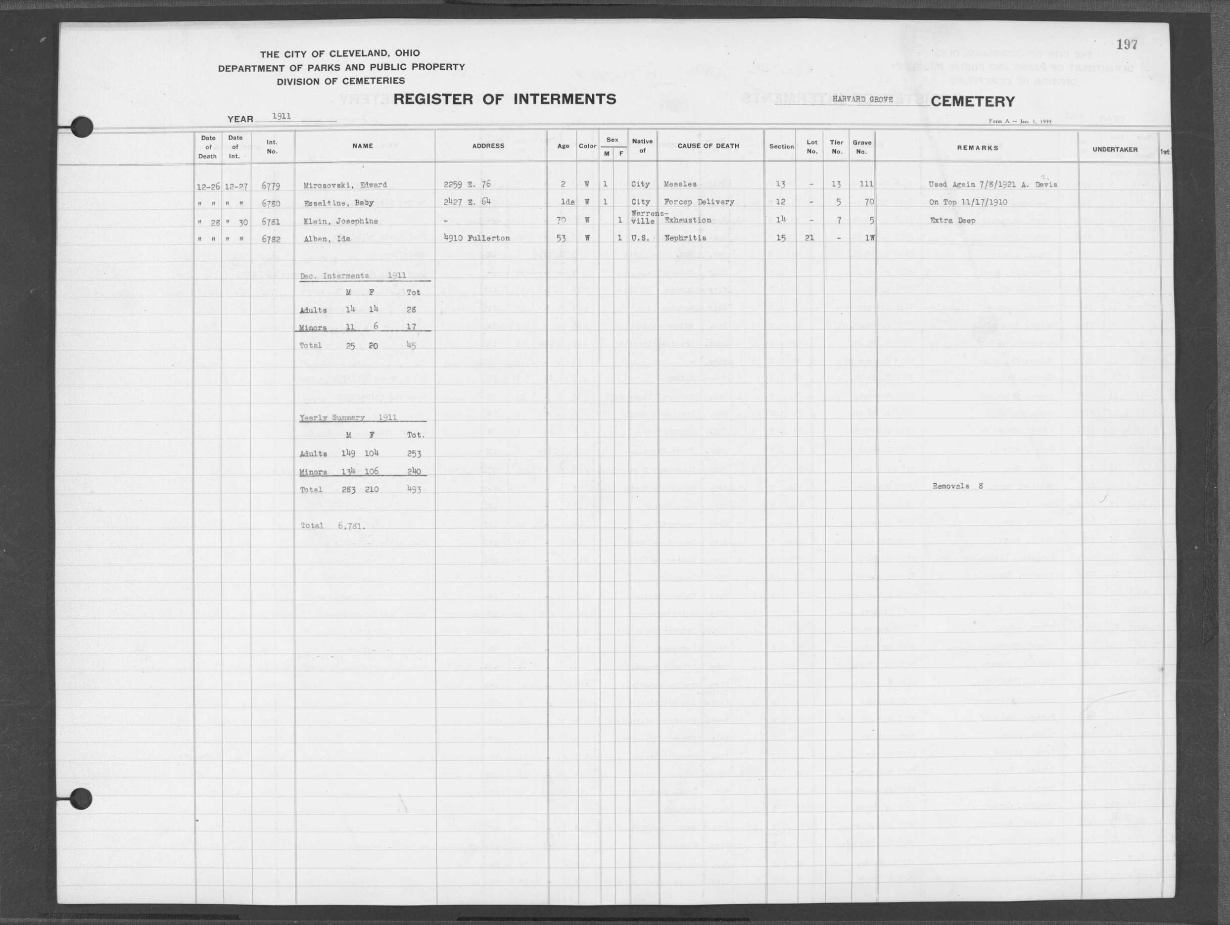 | Harvard Grove | 2 | 152 | Aug | 5 | 1921 | Aug | 8 | 1921 | 12566 | Albert, Bessie F | 41y | C | F | |
