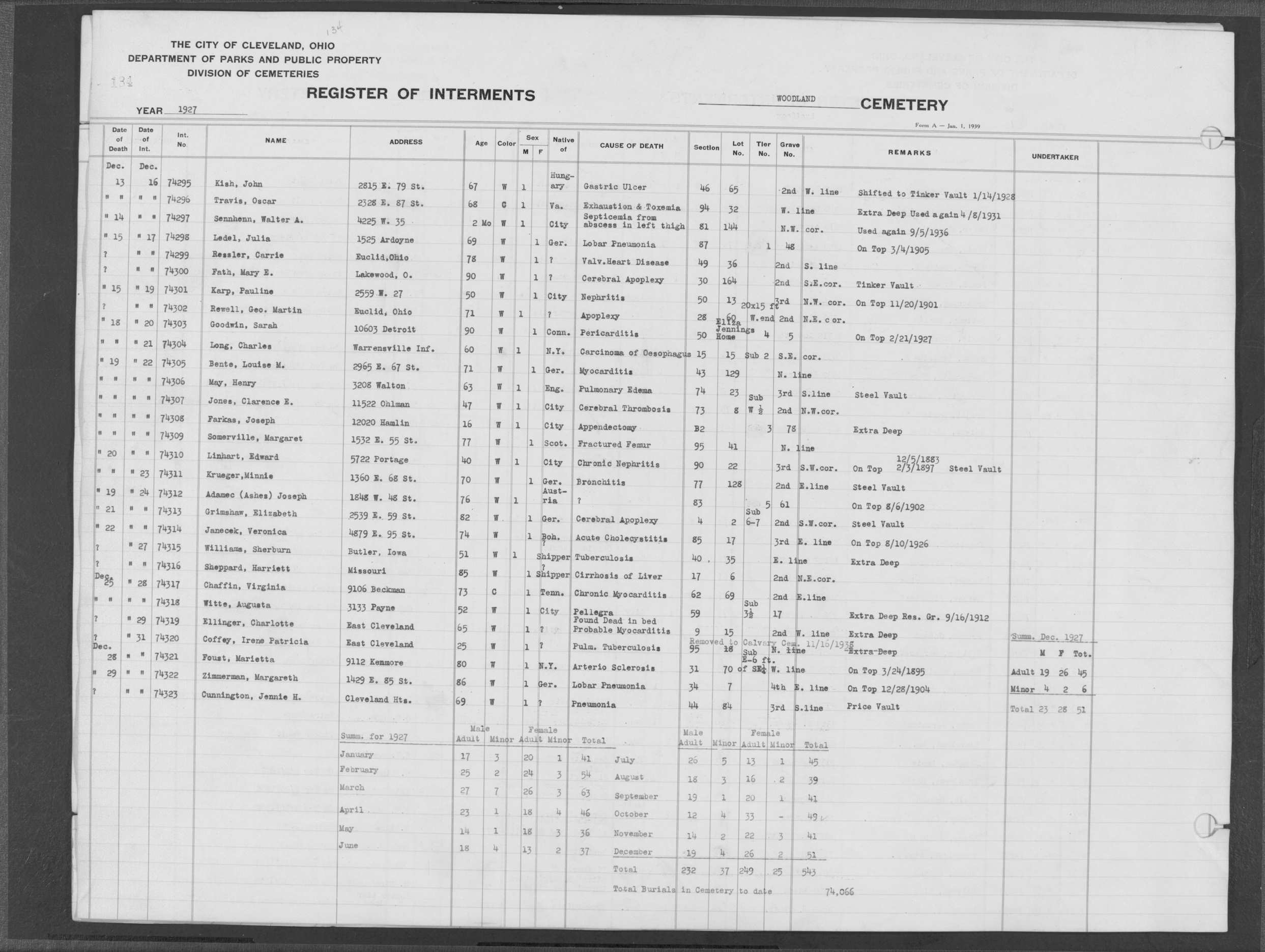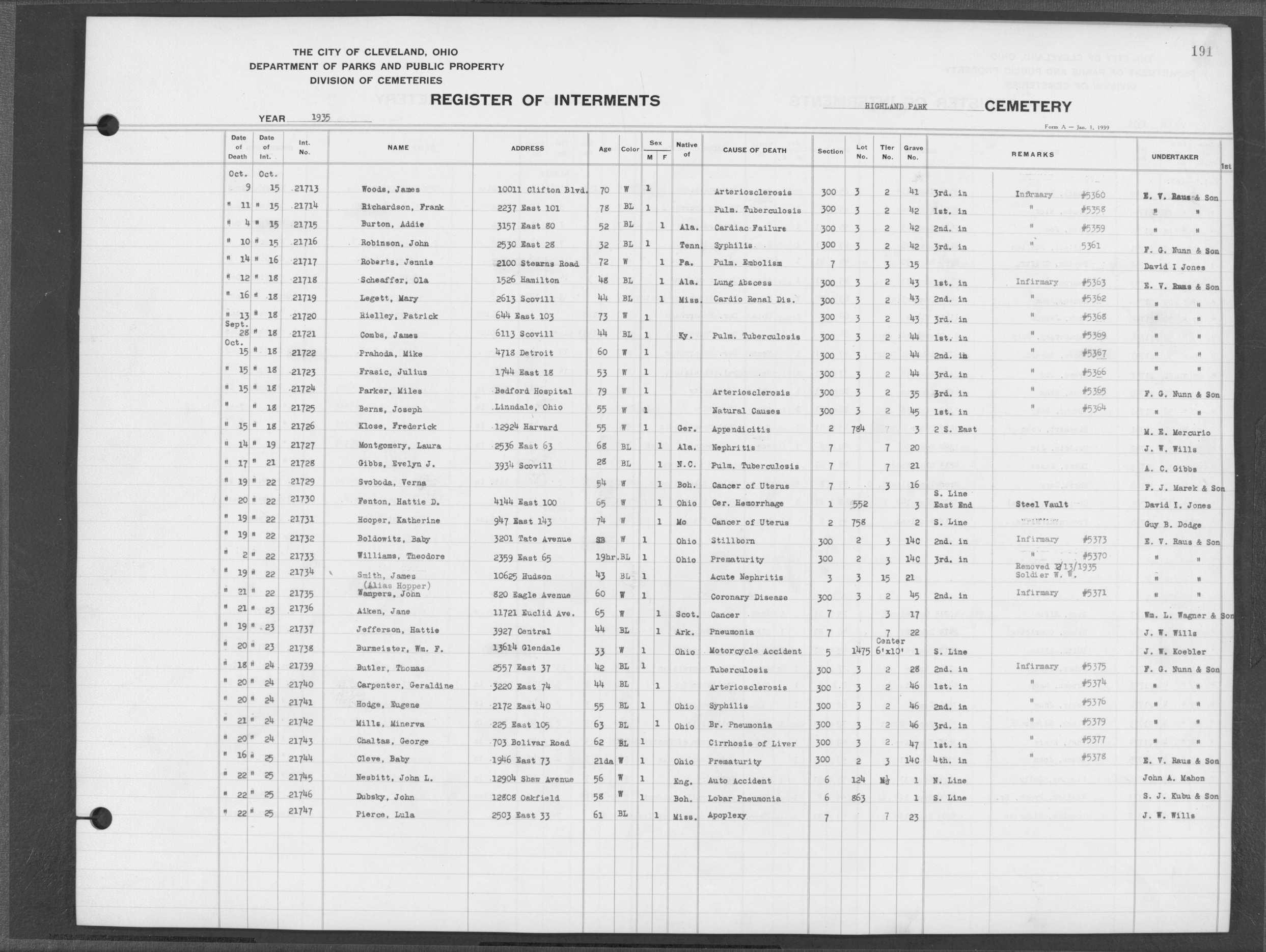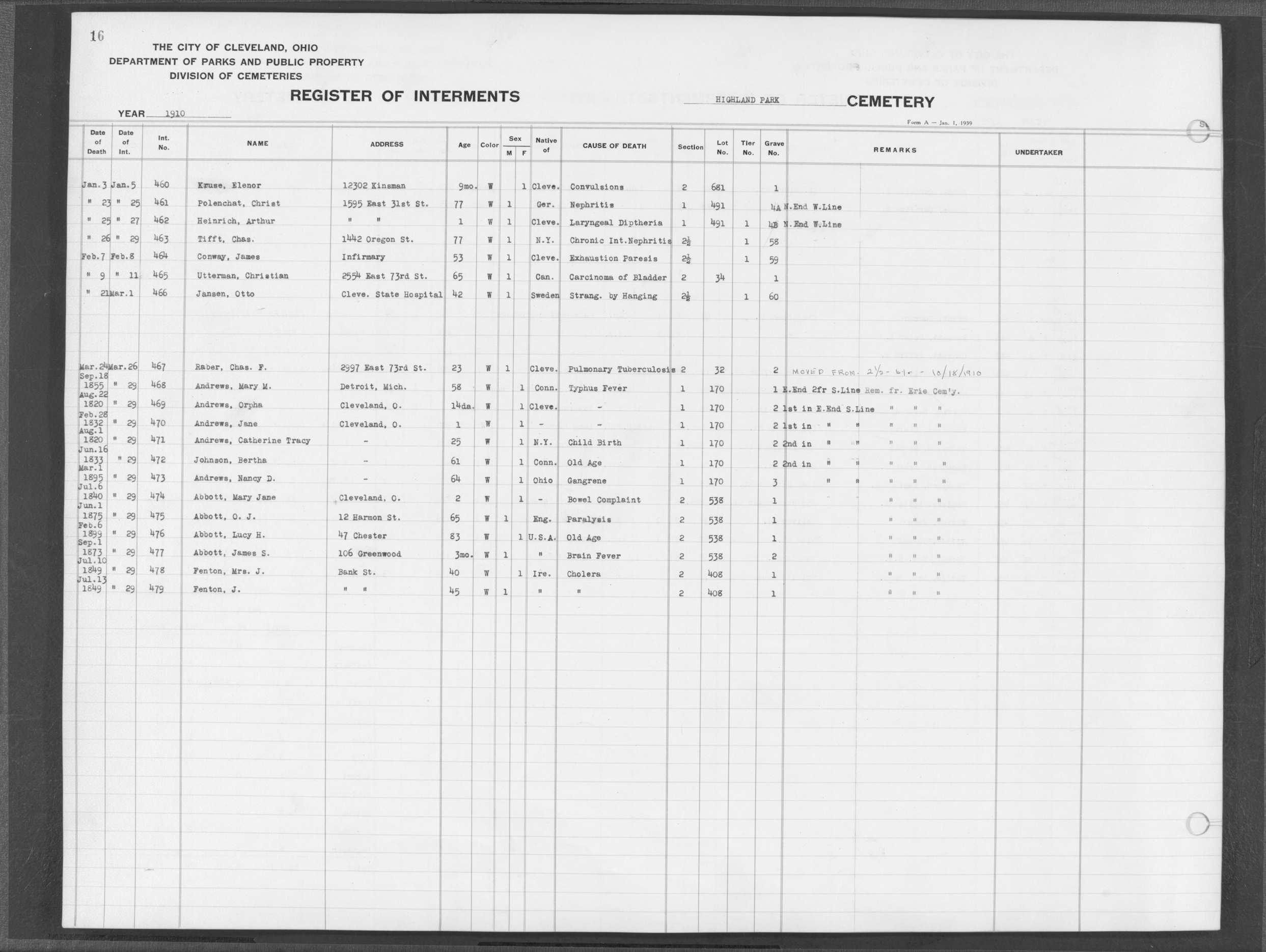 | West Park | 1 | 82 | Dec | 21 | 1912 | 2572 | Alberts, Catherine | 48y | W | F | ||||
