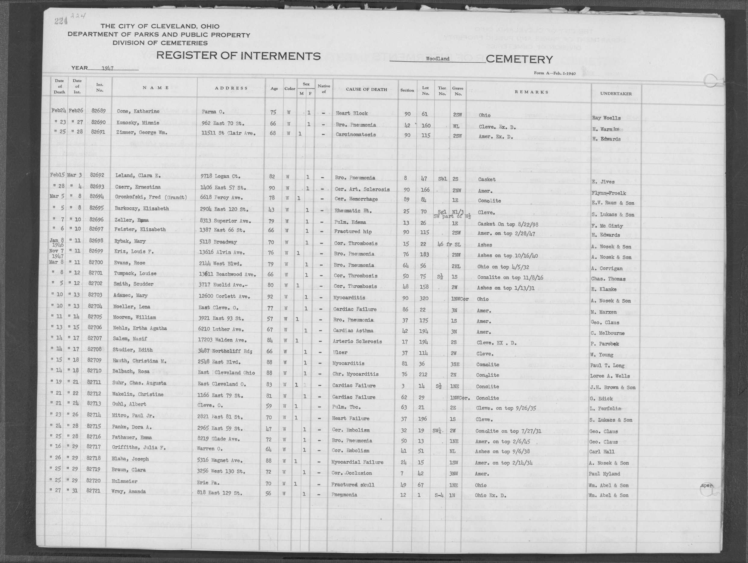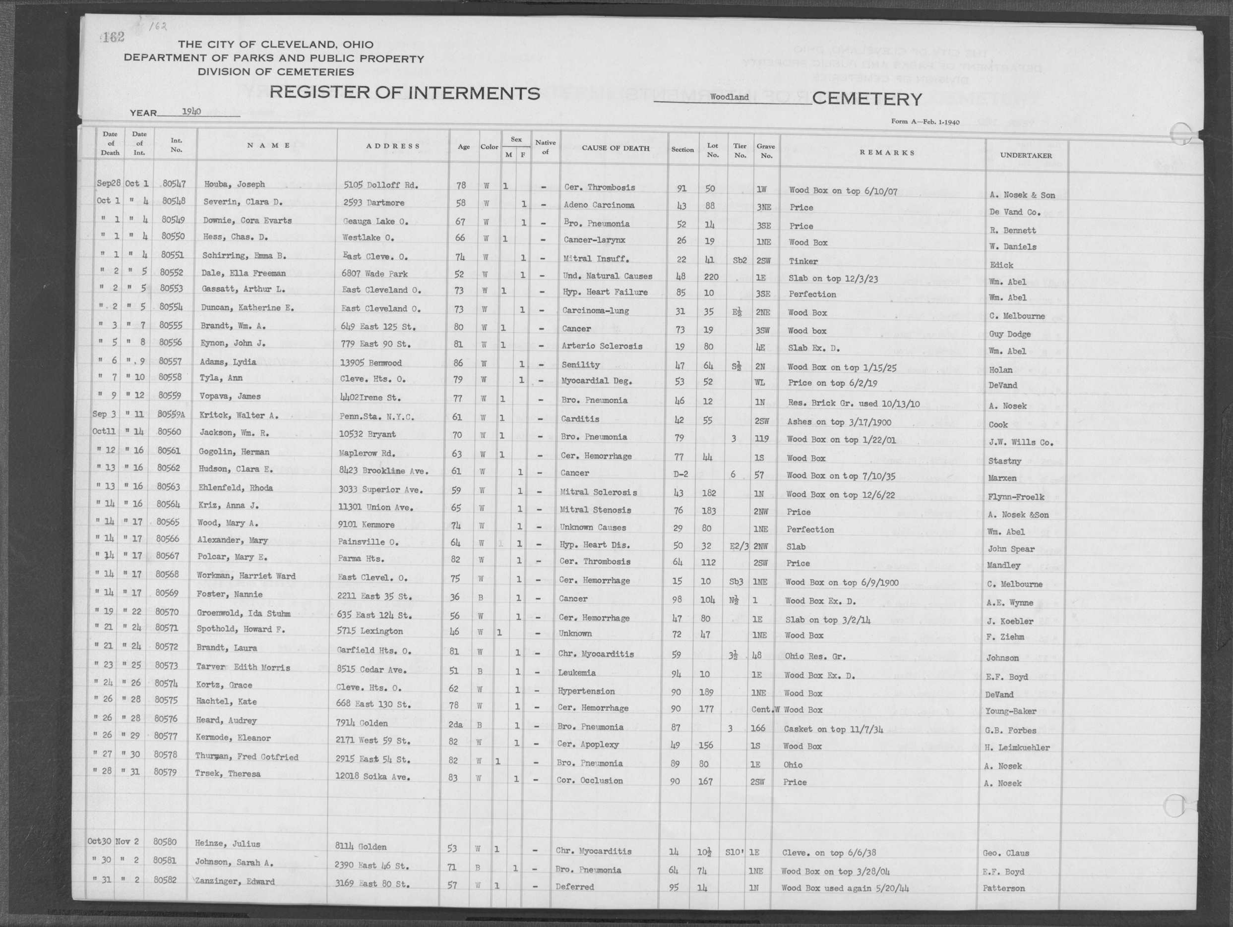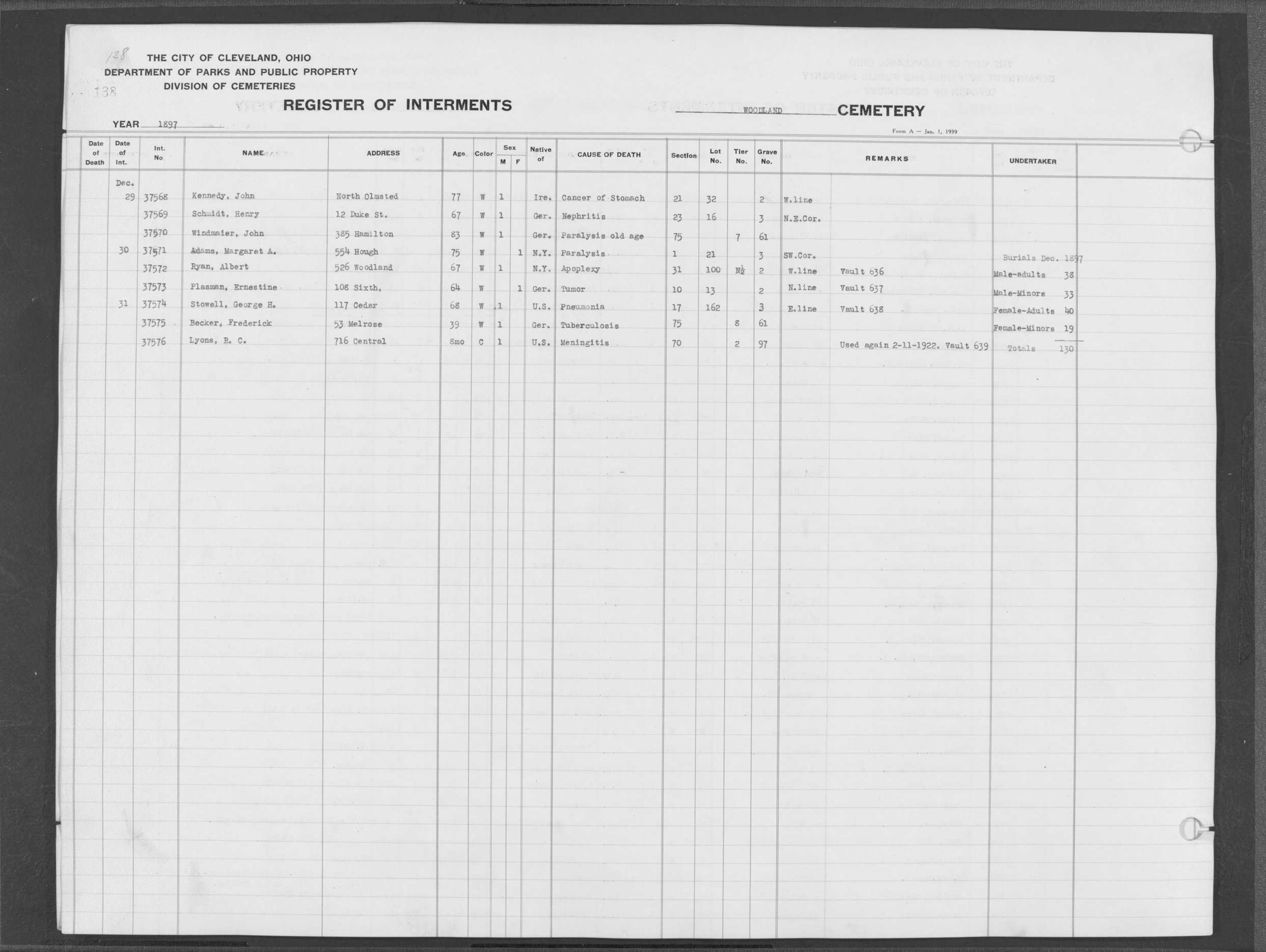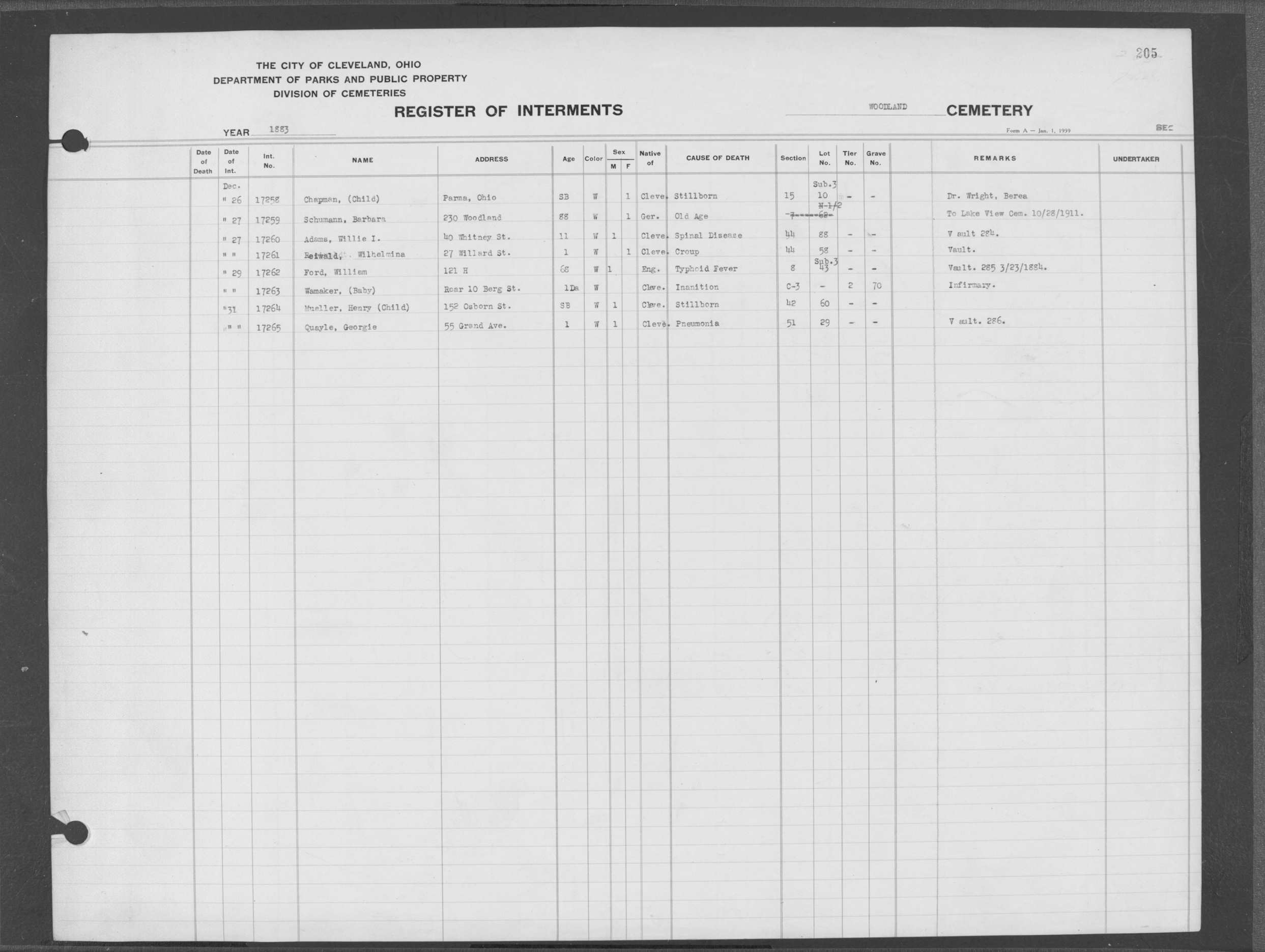| West Park | 1 | 82 | Dec | 21 | 1912 | 2572 | Alberts, Catherine | 48y | W | F | ||||