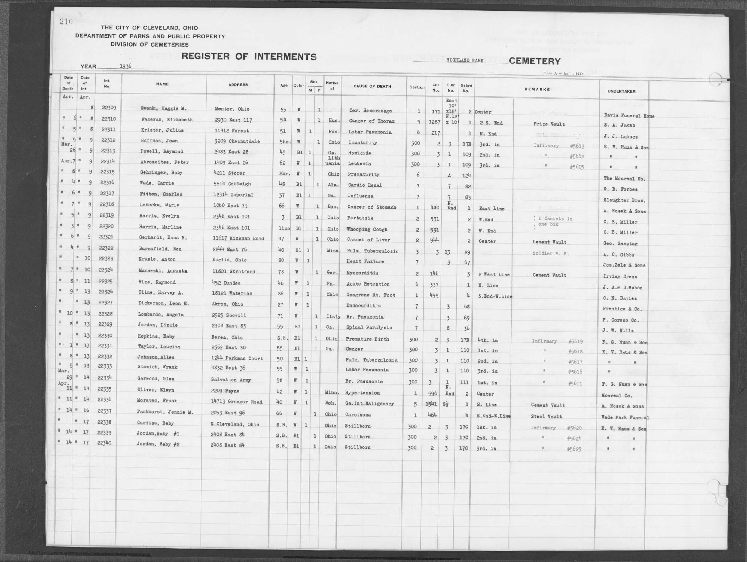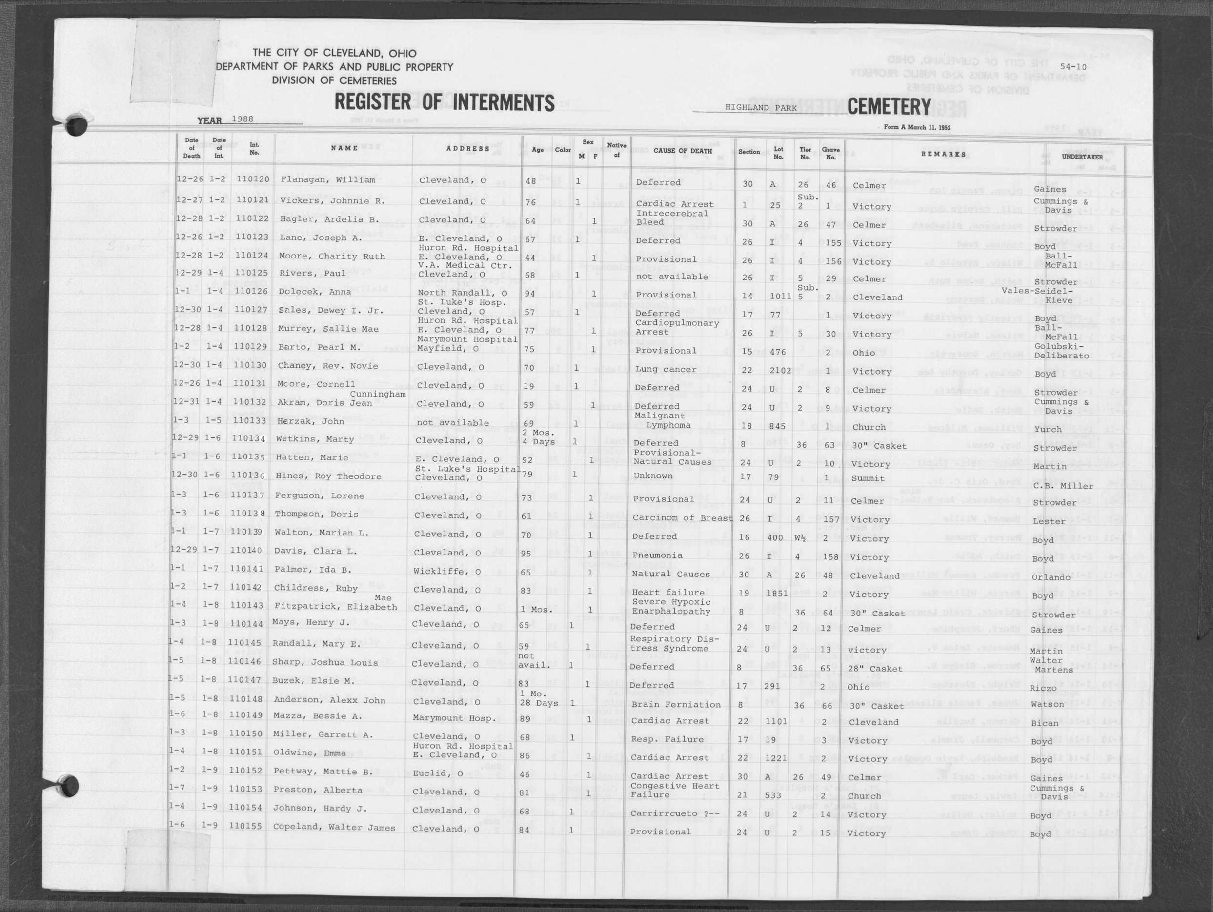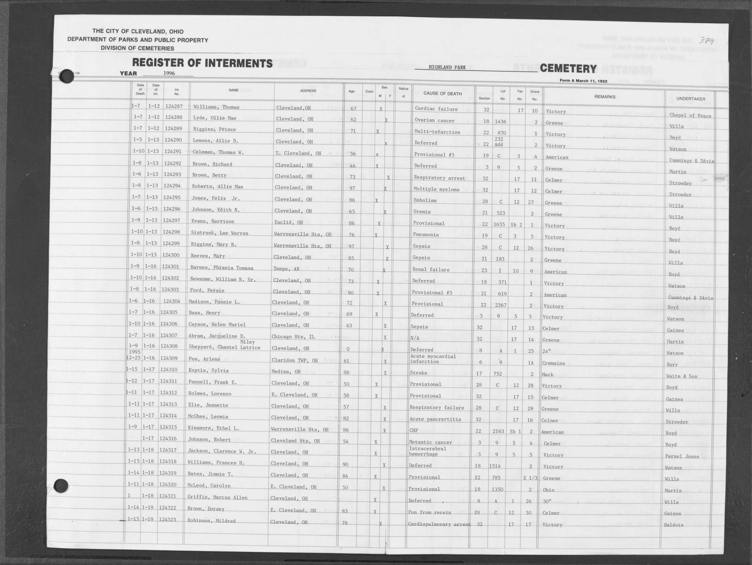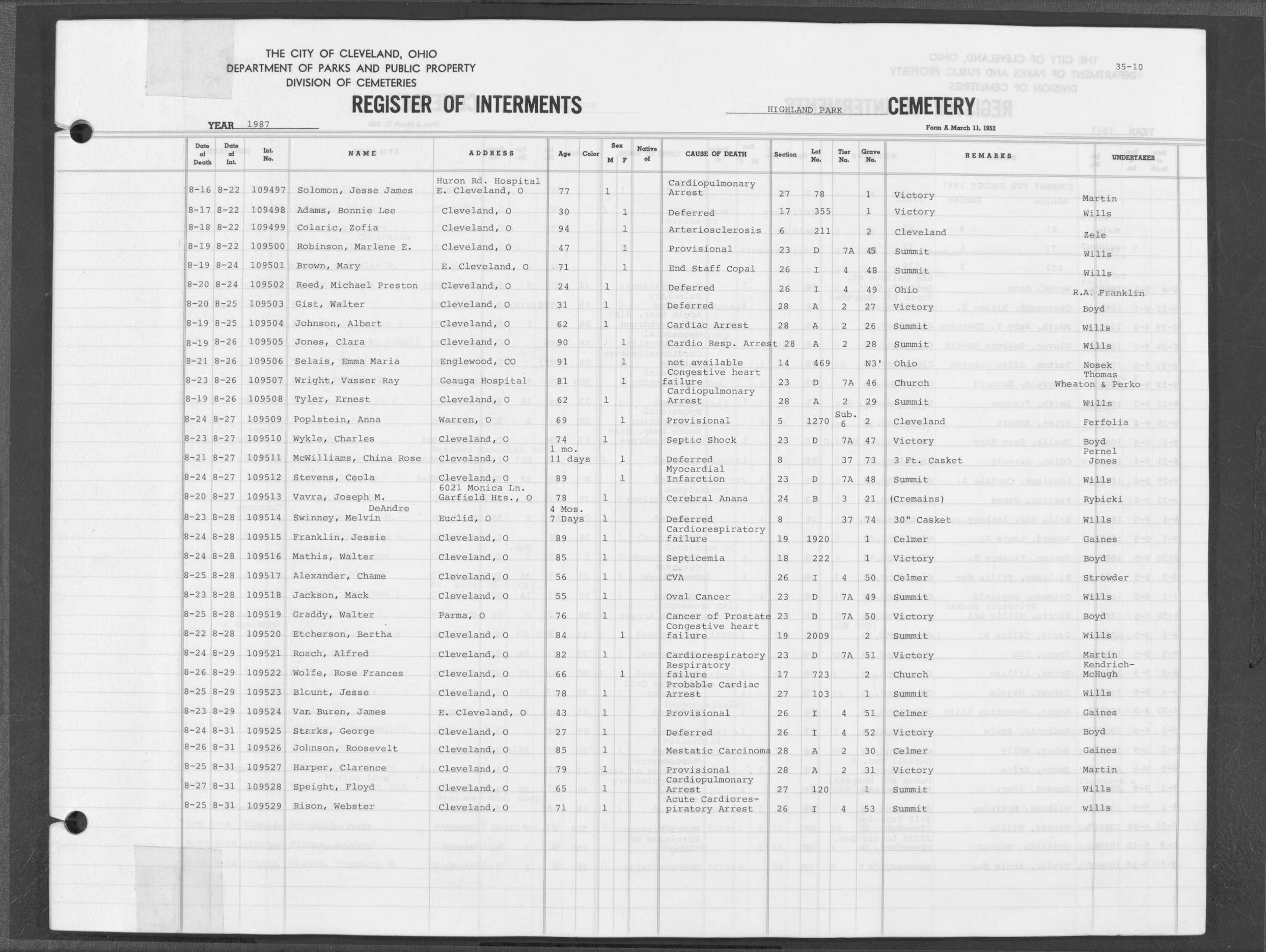 | Highland Park | 7 | 32 | Jul | 28 | 1967 | Aug | 1 | 1967 | 64555 | Alberty, Frances Sargent | 52y | F | ||