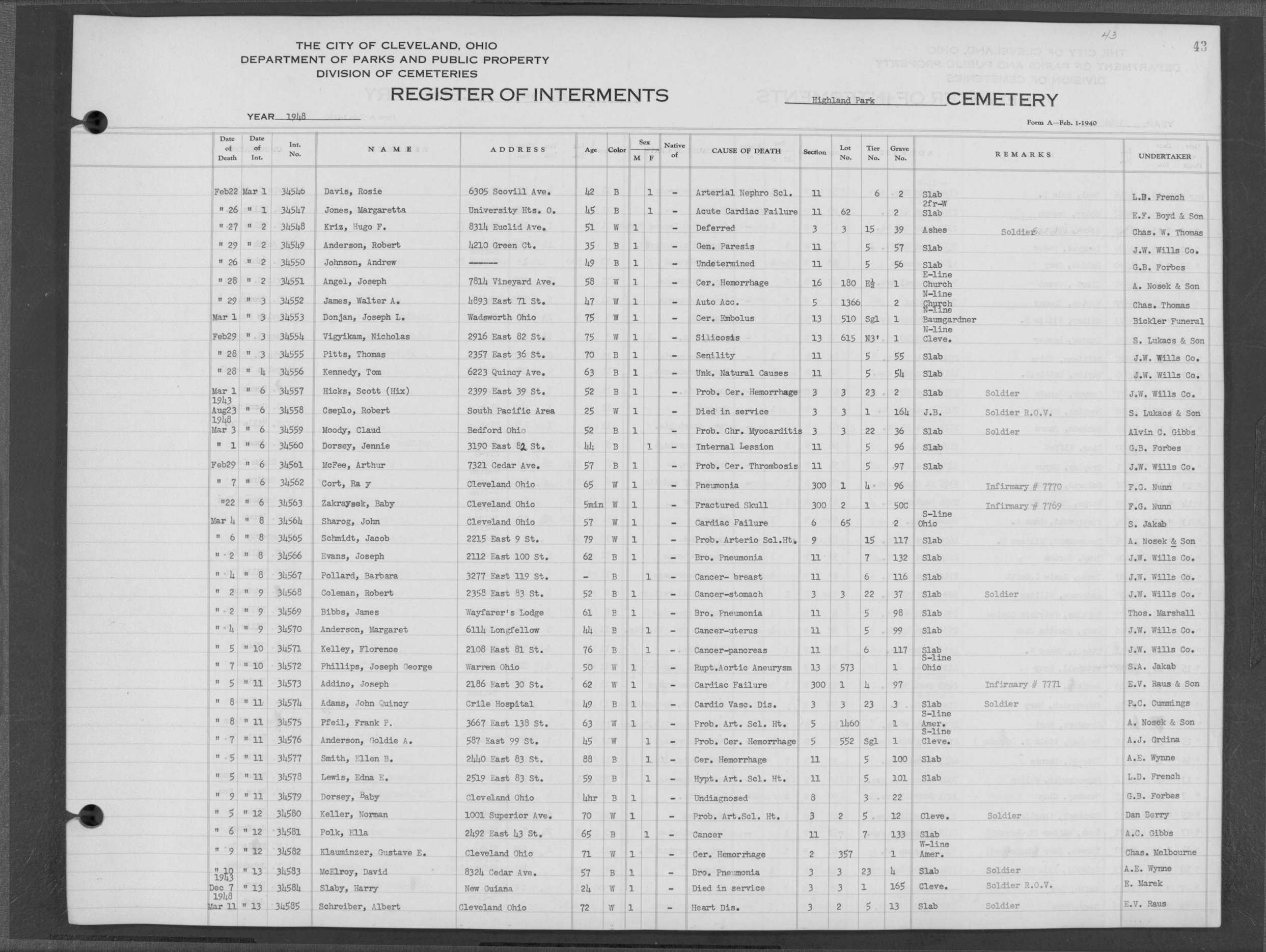| Highland Park | 4 | 156 | Sep | 3 | 1943 | Sep | 10 | 1943 | 28940 | Albert, Hattielene | 20y | B | F | |