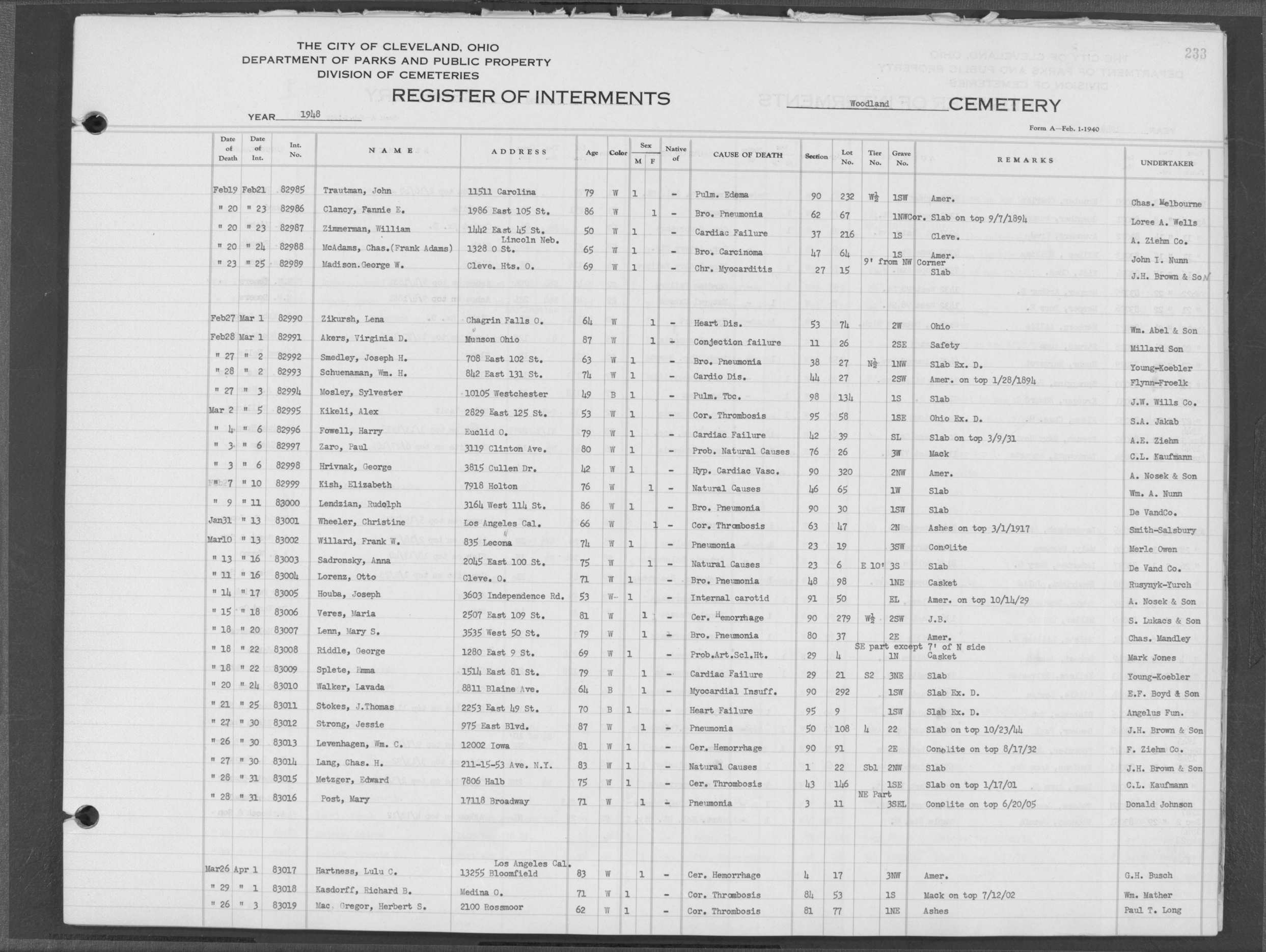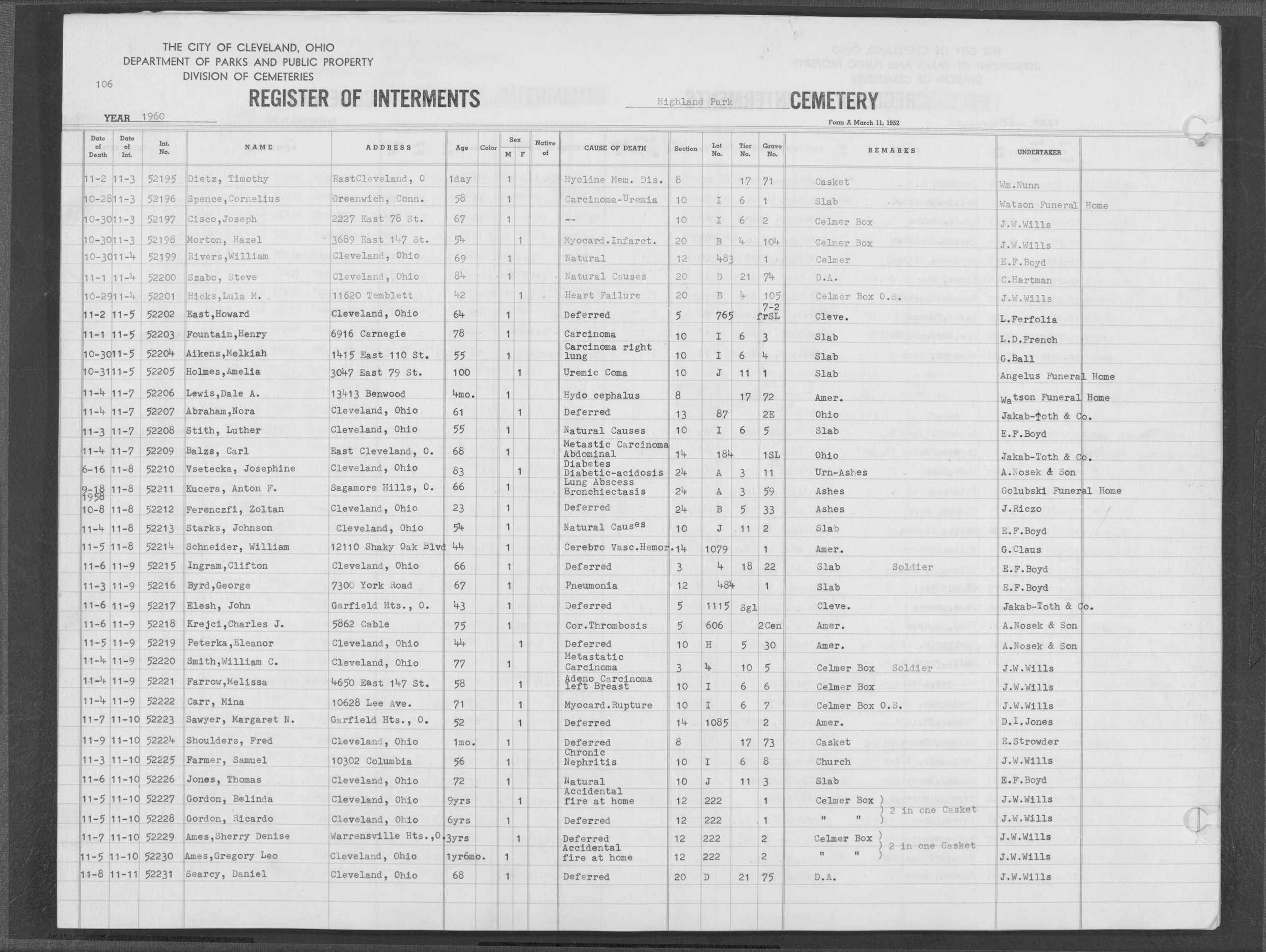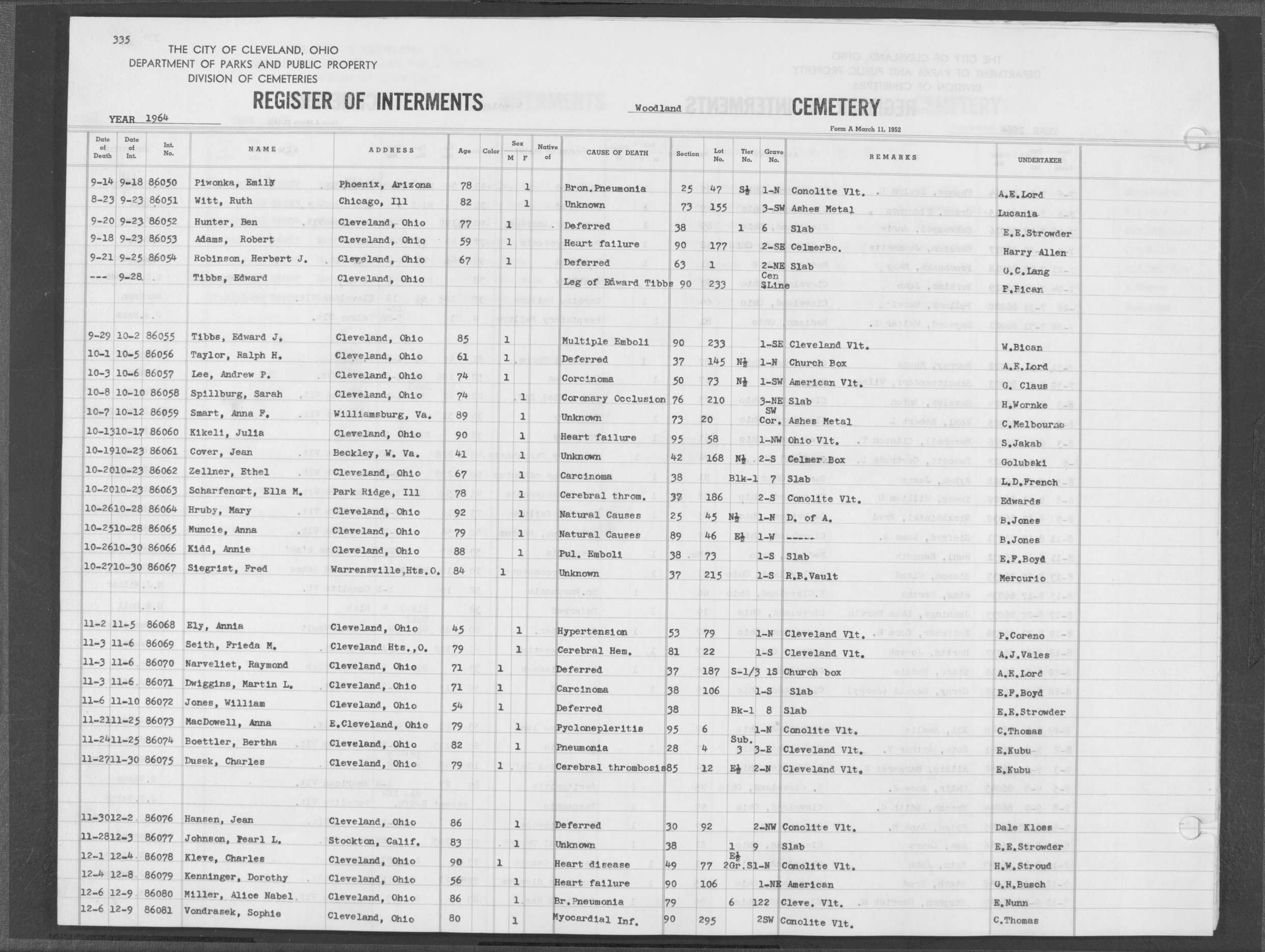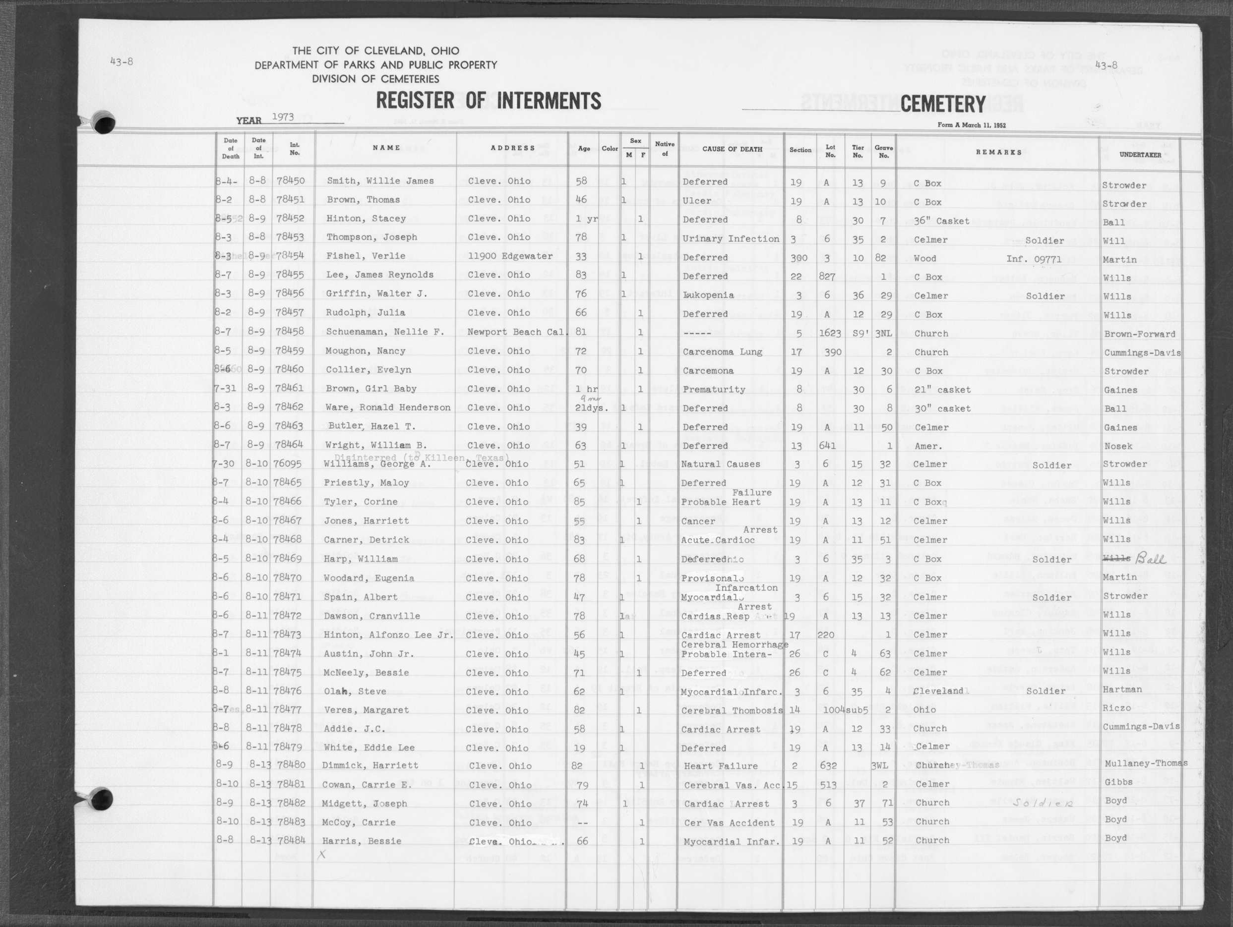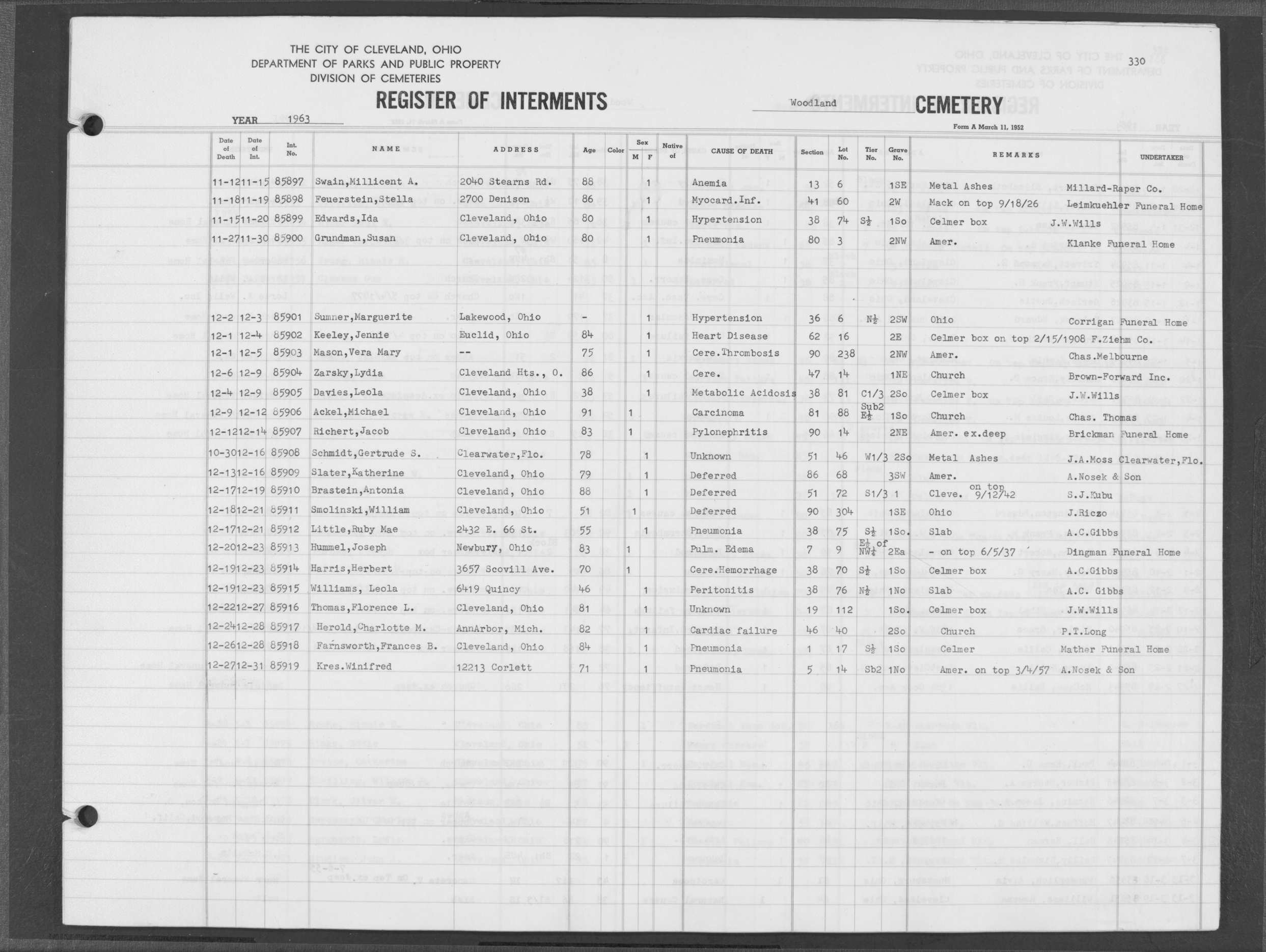 | West Park | 5 | 73 | Aug | 25 | 1970 | Aug | 27 | 1970 | 33578 | Albert, Anna Depner | 79y | F | ||