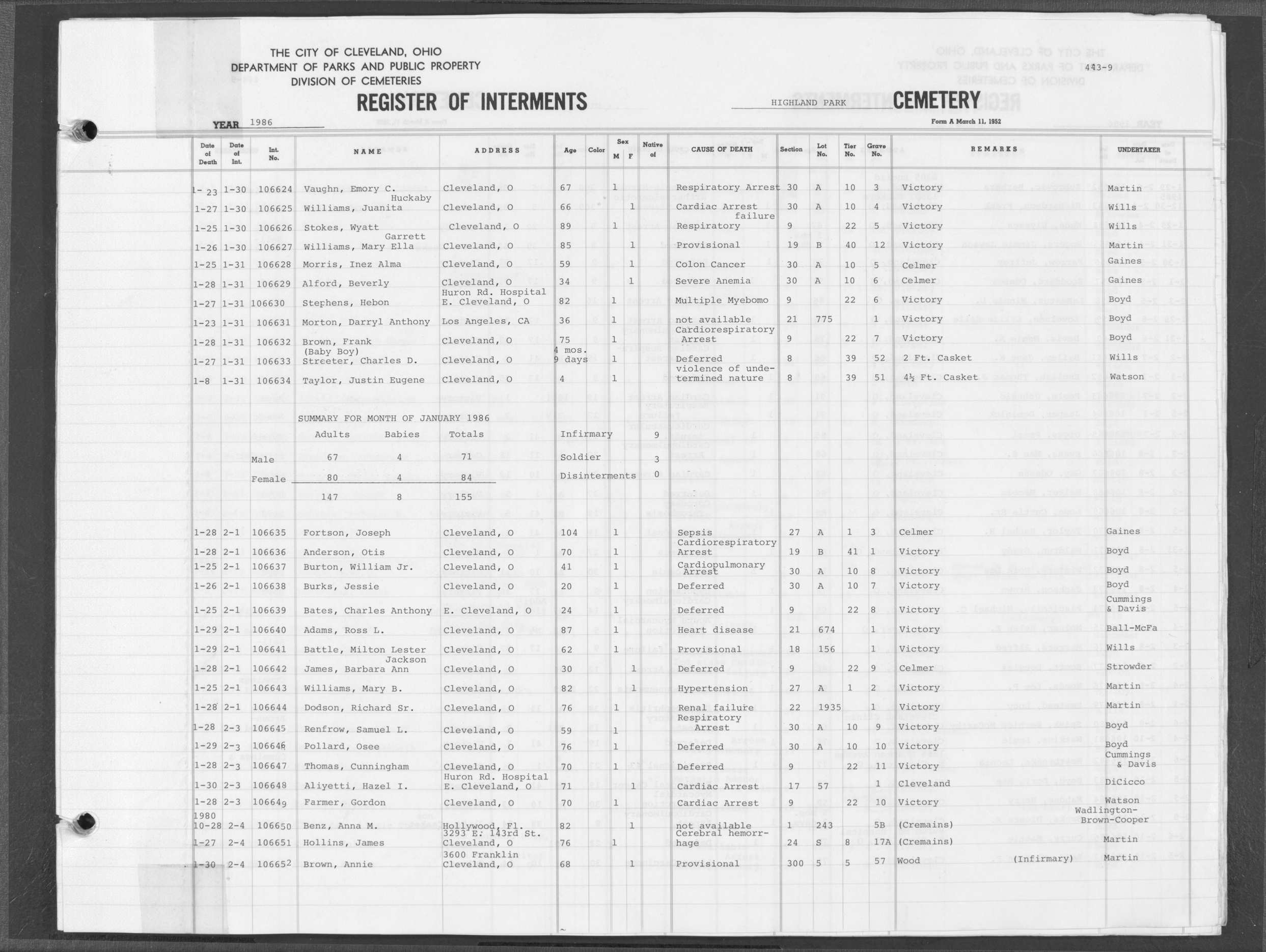 | Highland Park | 9 | 10 | Feb | 8 | 1979 | Feb | 12 | 1979 | 92016 | Albert, Anicin | 49y | M | ||