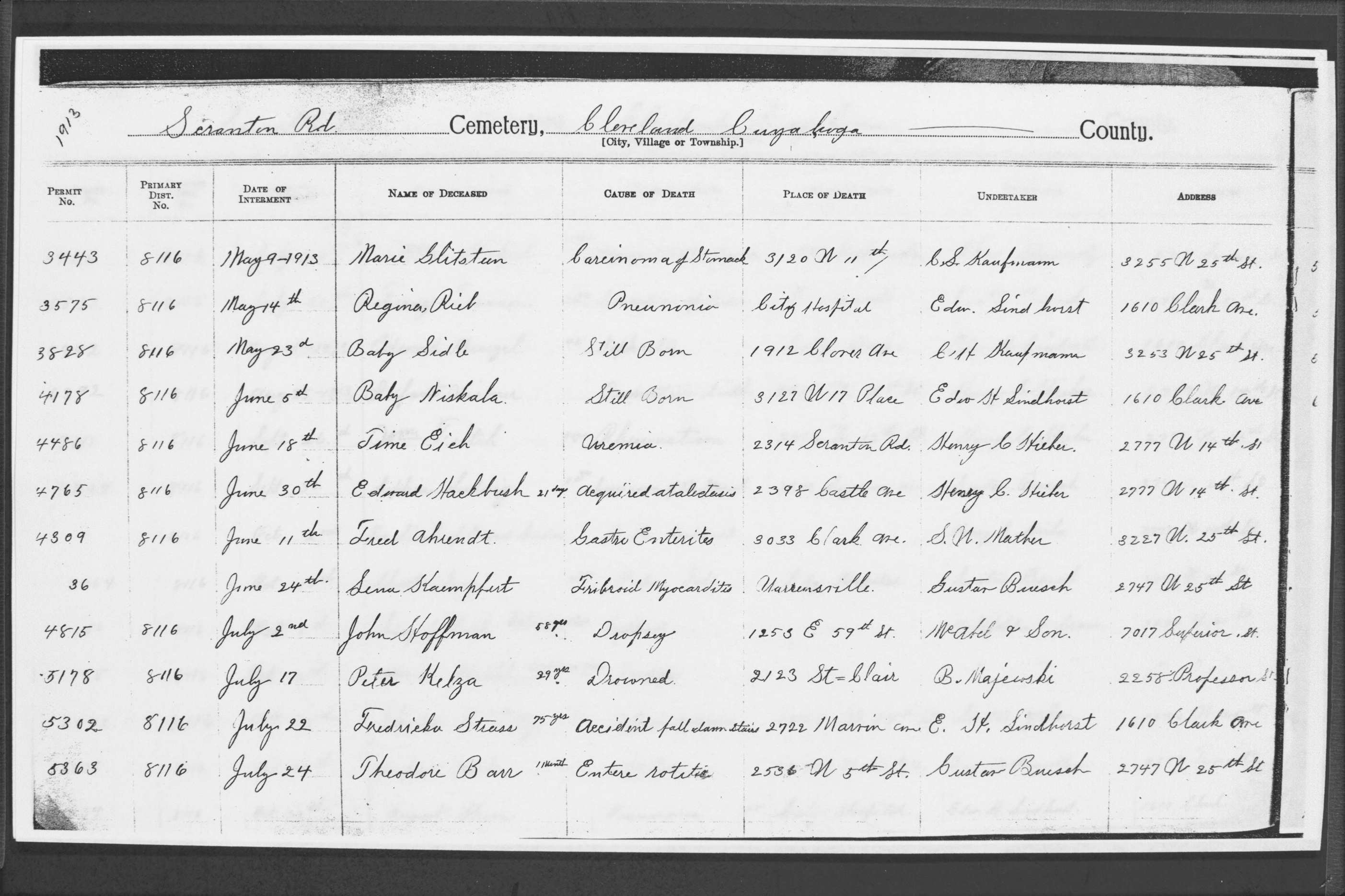 | Monroe Street | 3 | 207 | May | 3 | 1914 | 26272 | , Anselin | Sister AKA Ella McCoy | 53y | W | F | |||