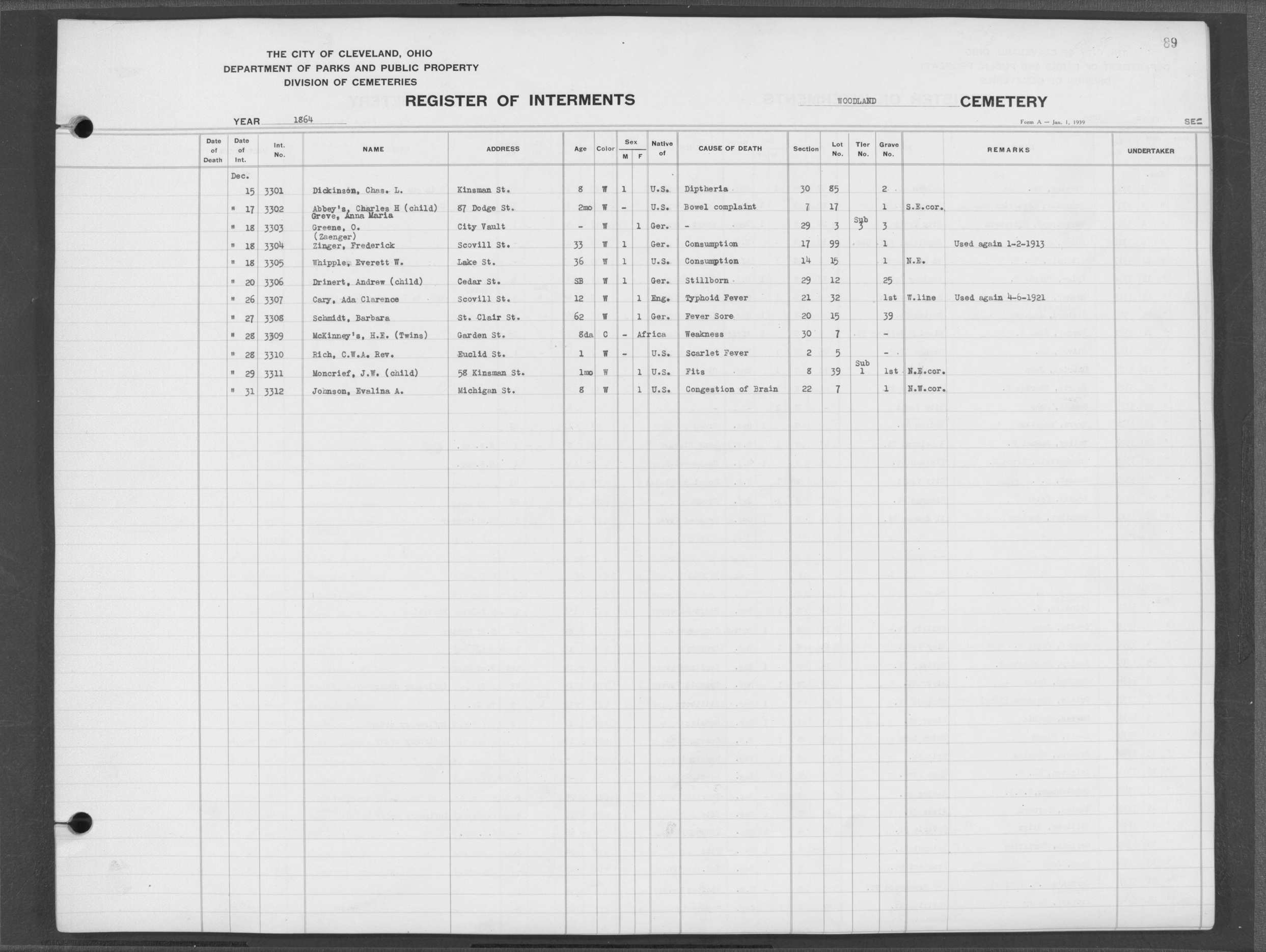 | Erie Street | 1 | 231 | May | 31 | 1864 | 9286 | Albert, | Child of Fred | 1y | M | ||||