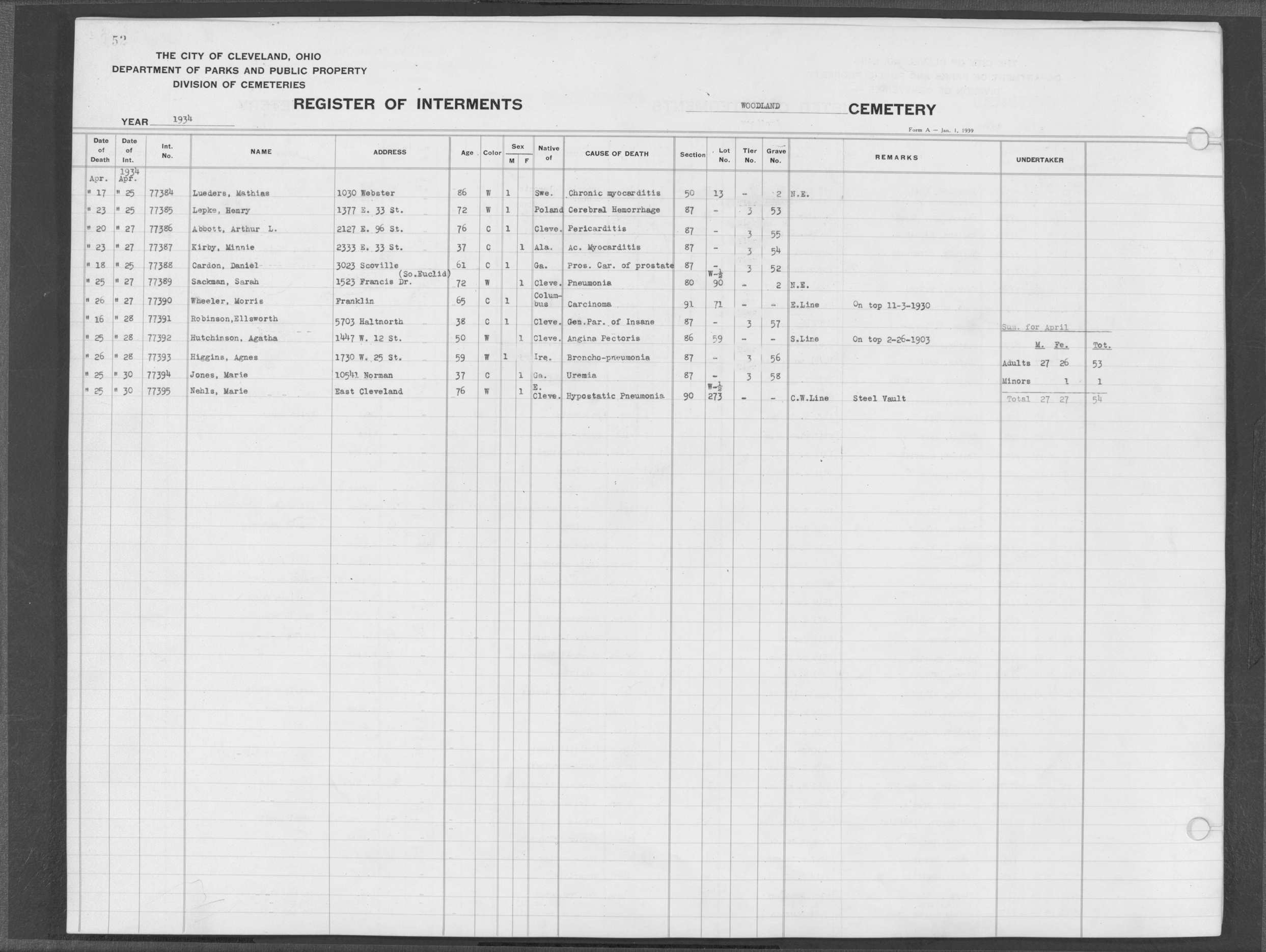 | Harvard Grove | 4 | 54 | Mar | 17 | 1938 | Mar | 22 | 1938 | 23712 | Albert, Sleein | 62y | C | F | |