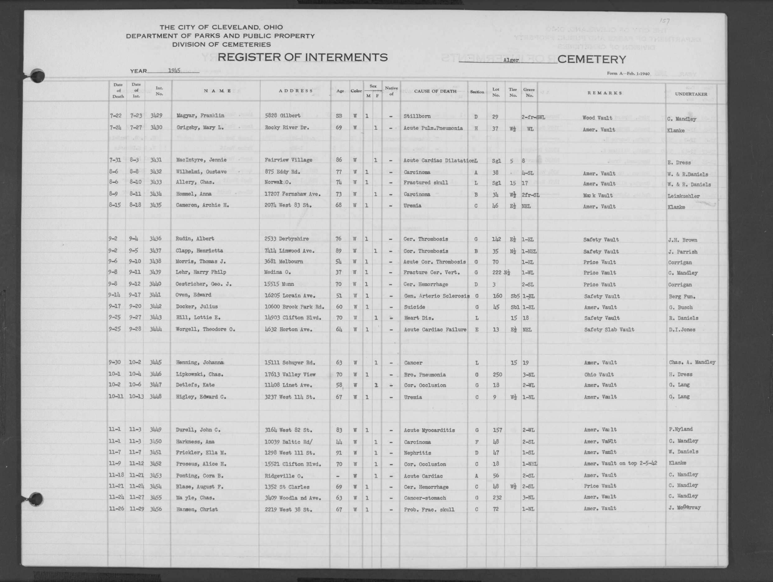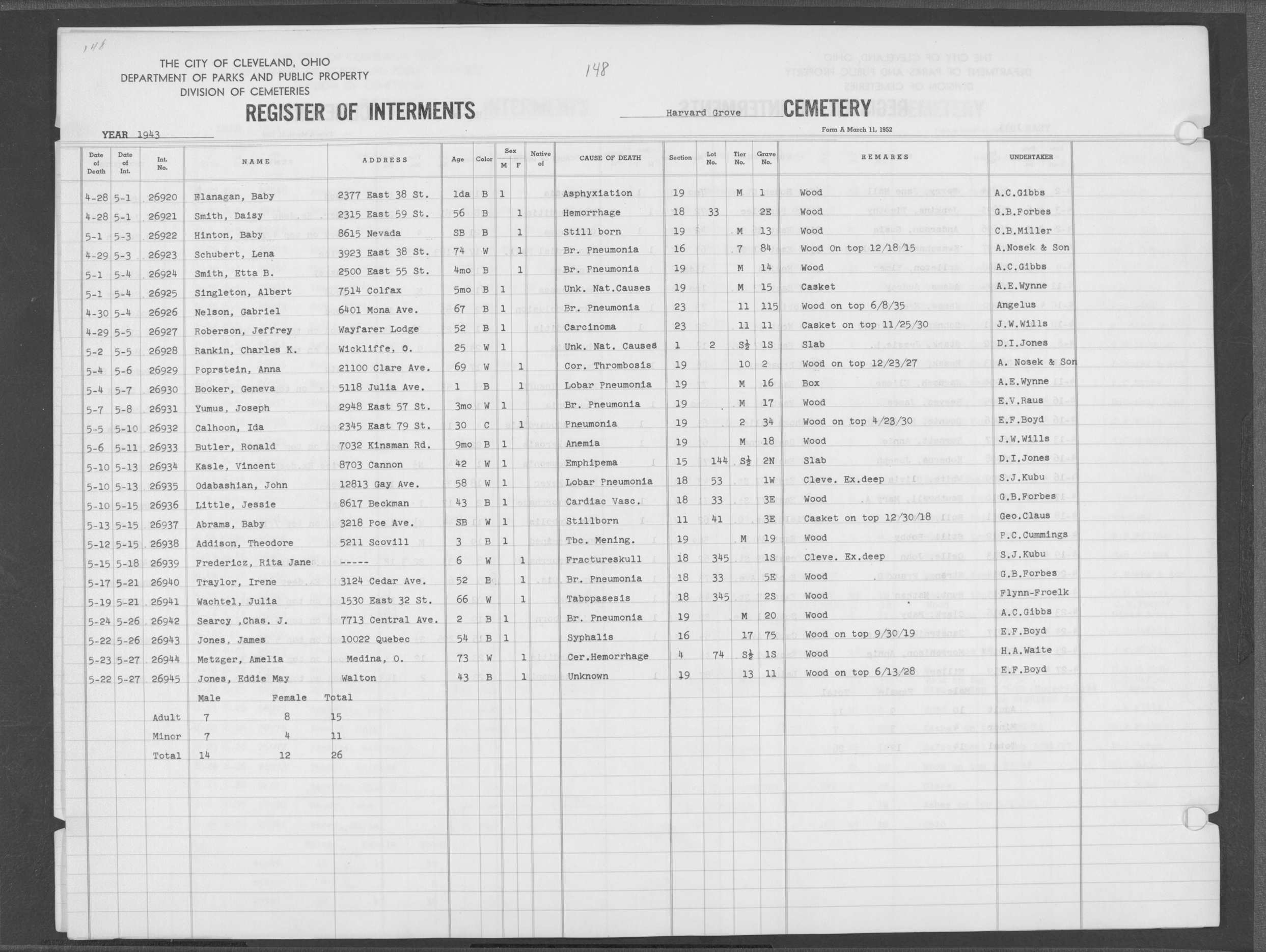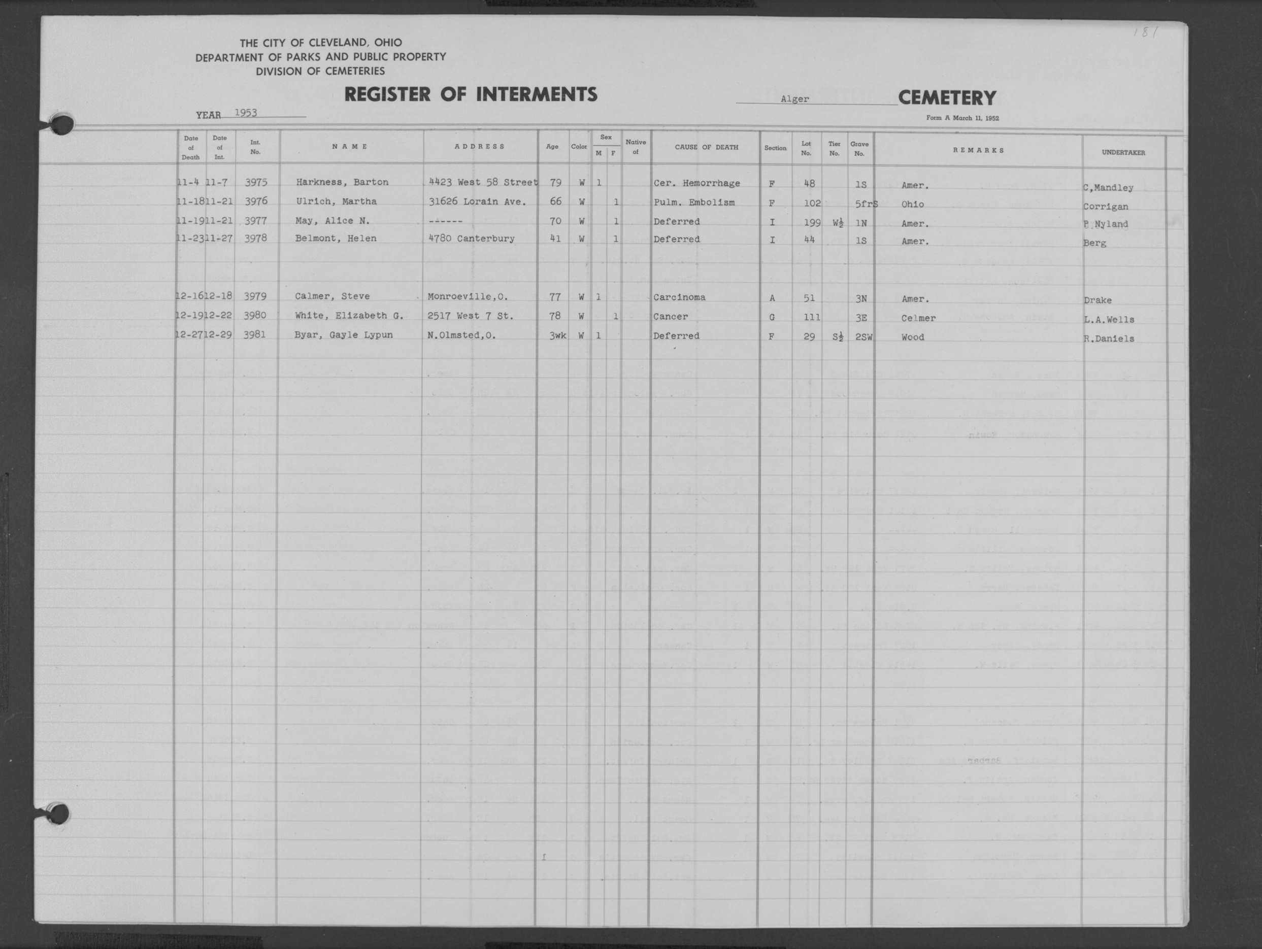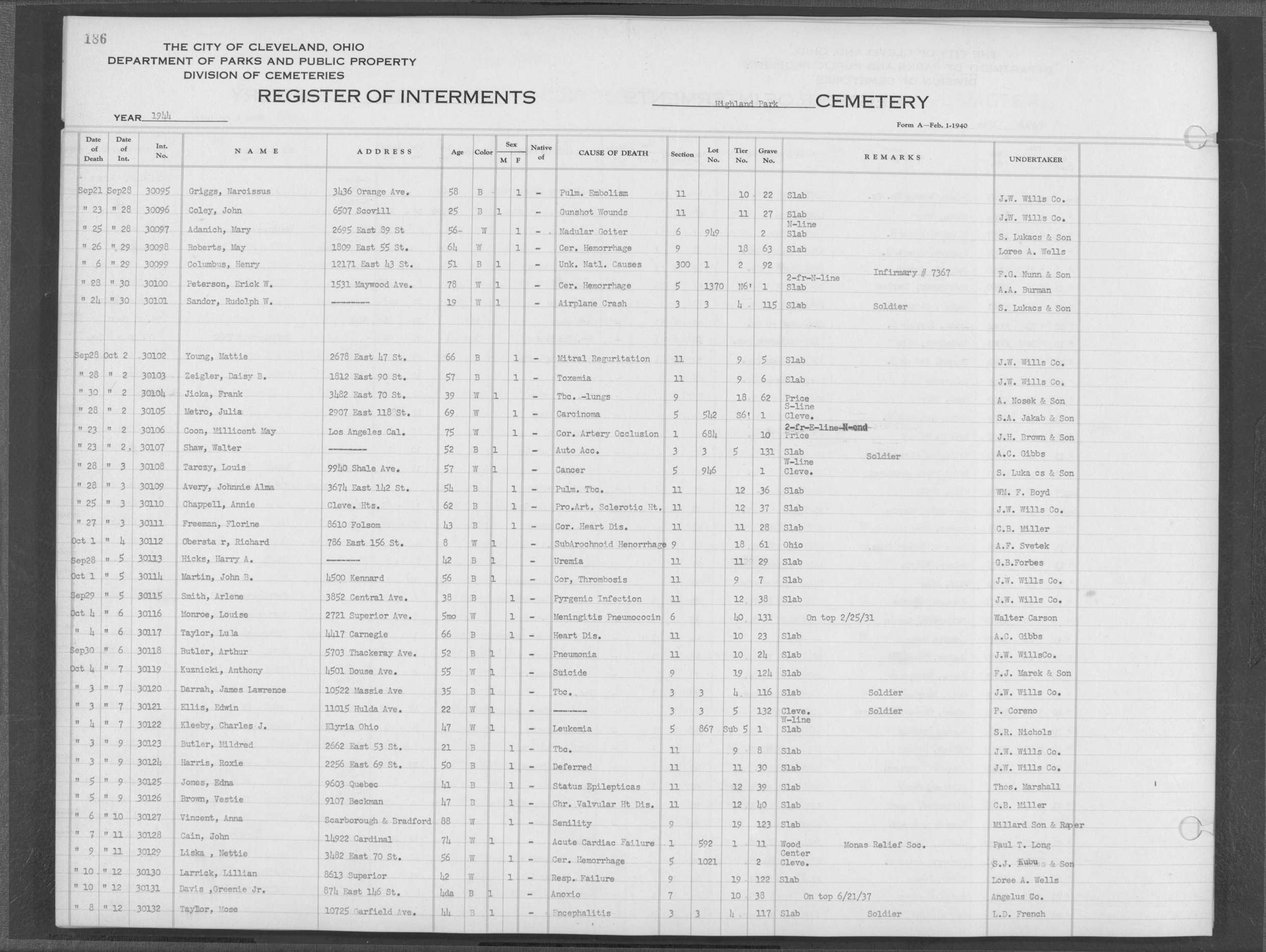 | Harvard Grove | 4 | 170 | Nov | 28 | 1945 | Dec | 1 | 1945 | 27561 | Caddy, Bert Wm | 64y | W | M | |