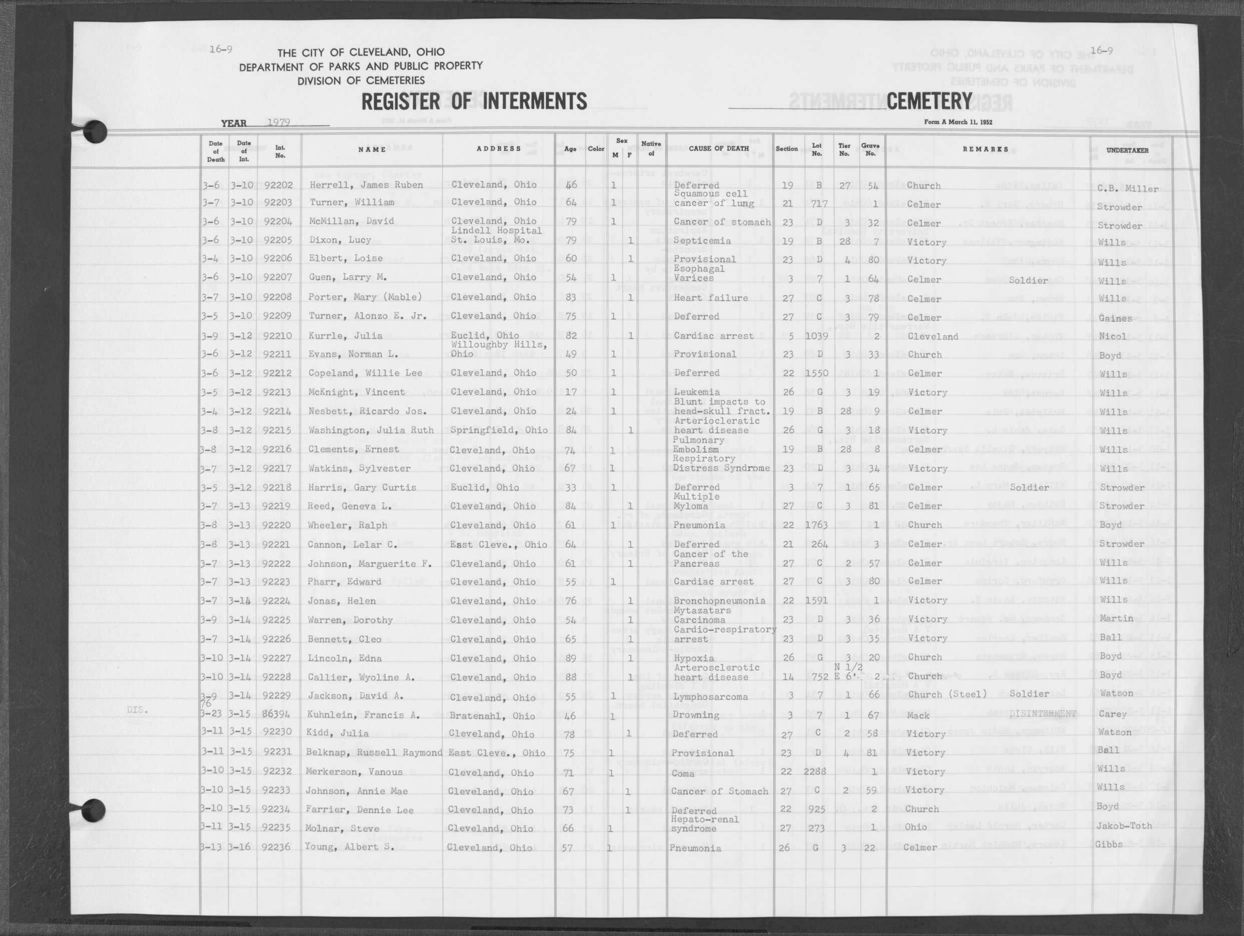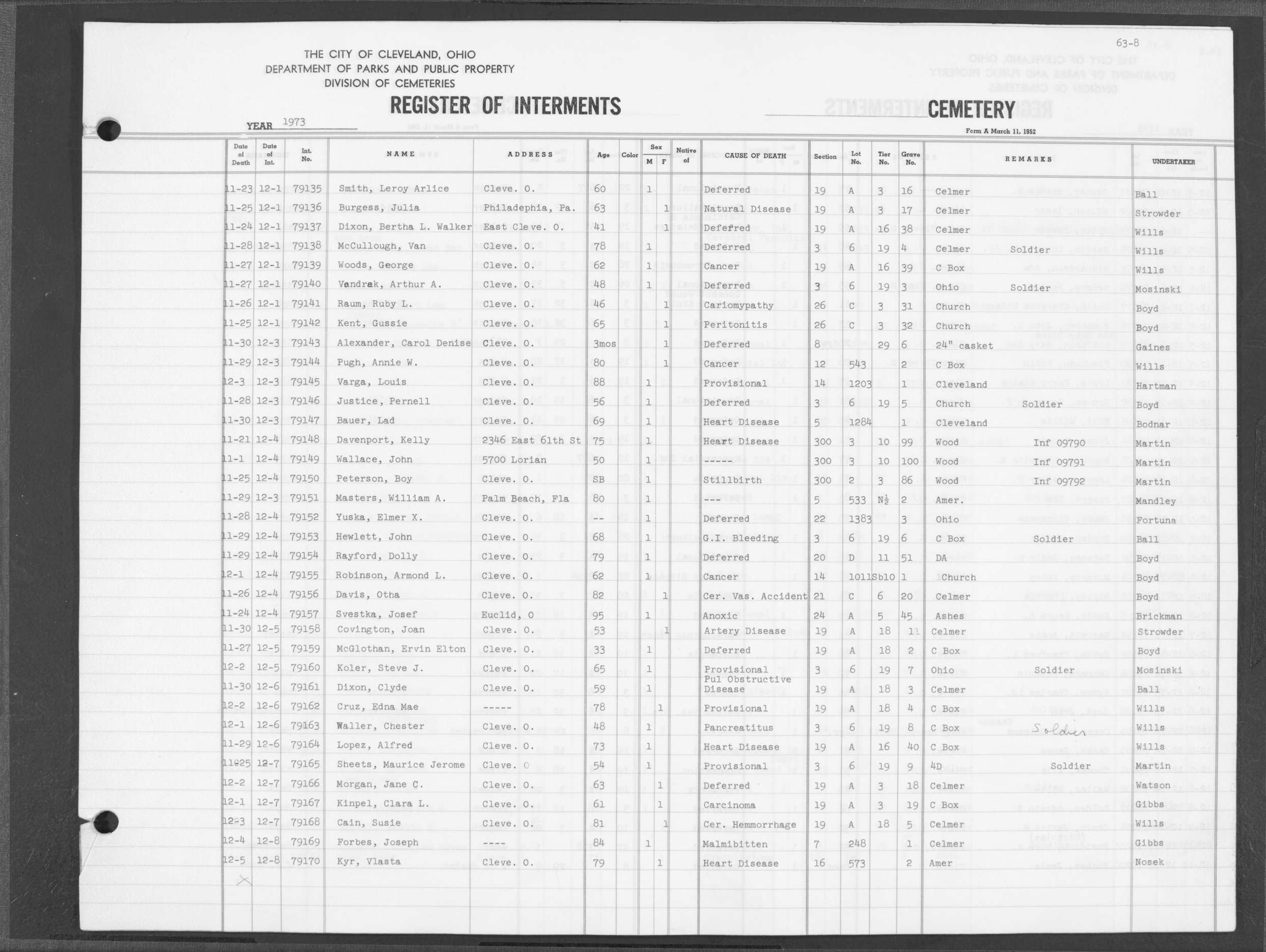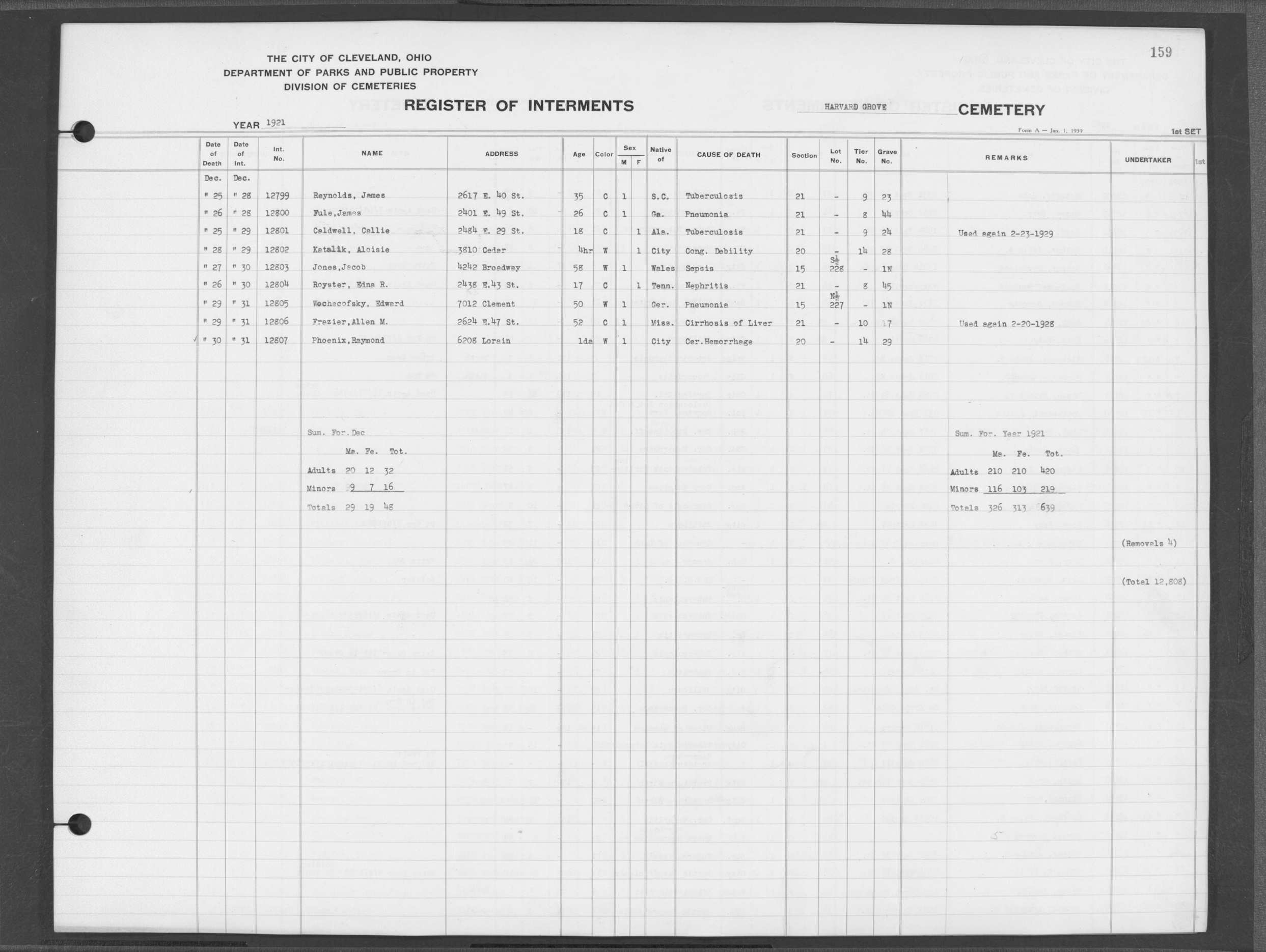 | Harvard Grove | 4 | 170 | Nov | 28 | 1945 | Dec | 1 | 1945 | 27561 | Caddy, Bert Wm | 64y | W | M | |