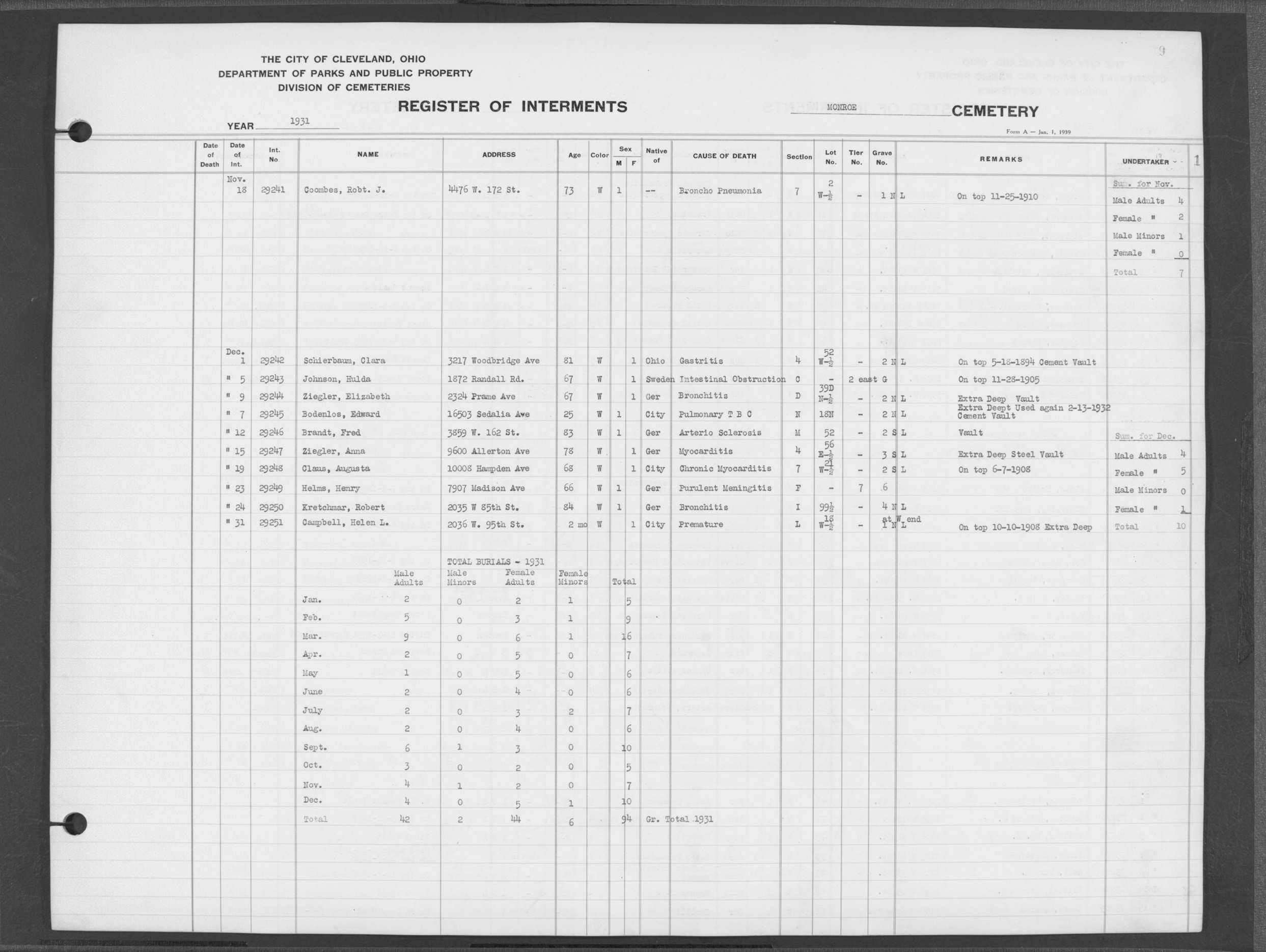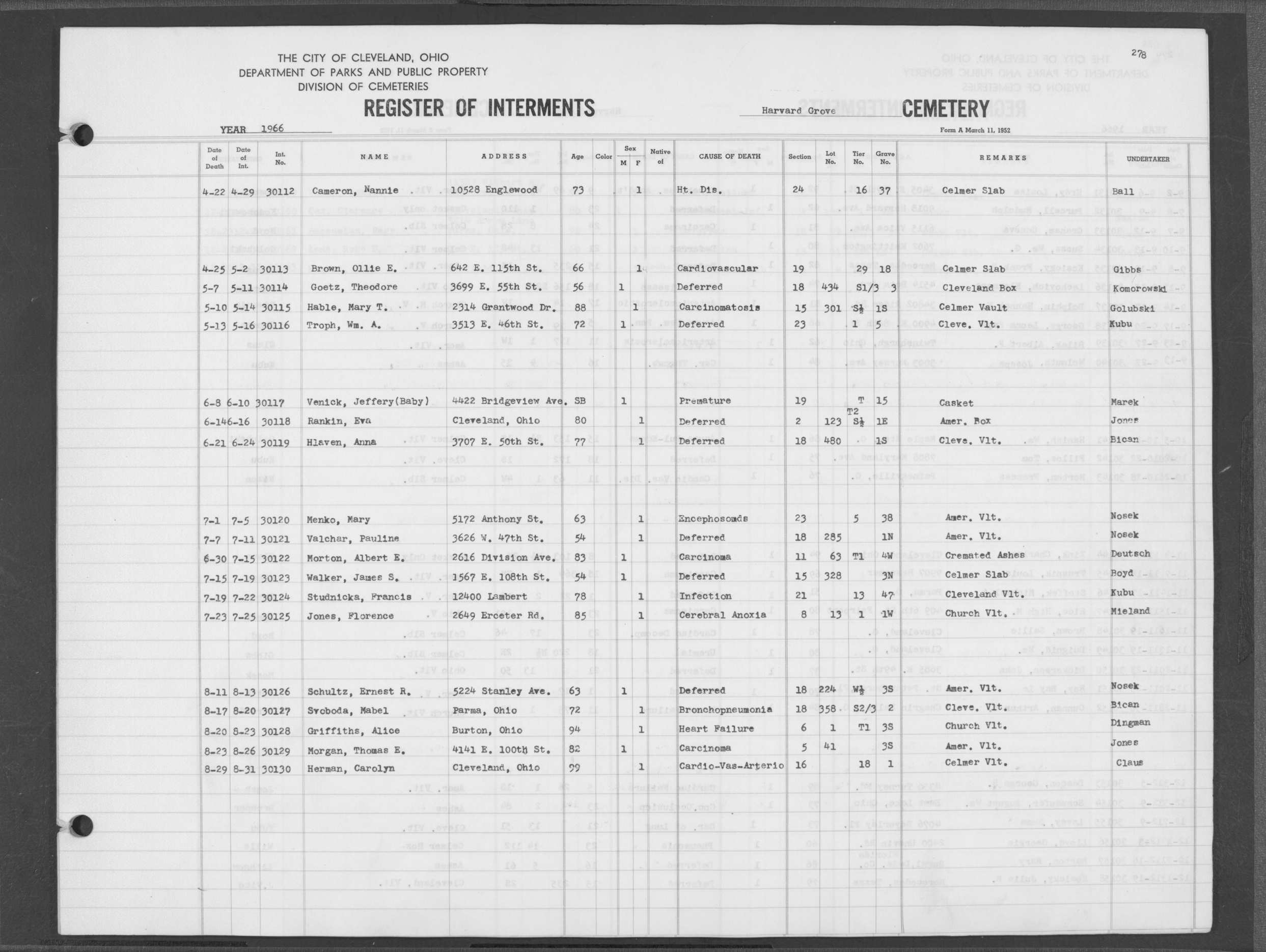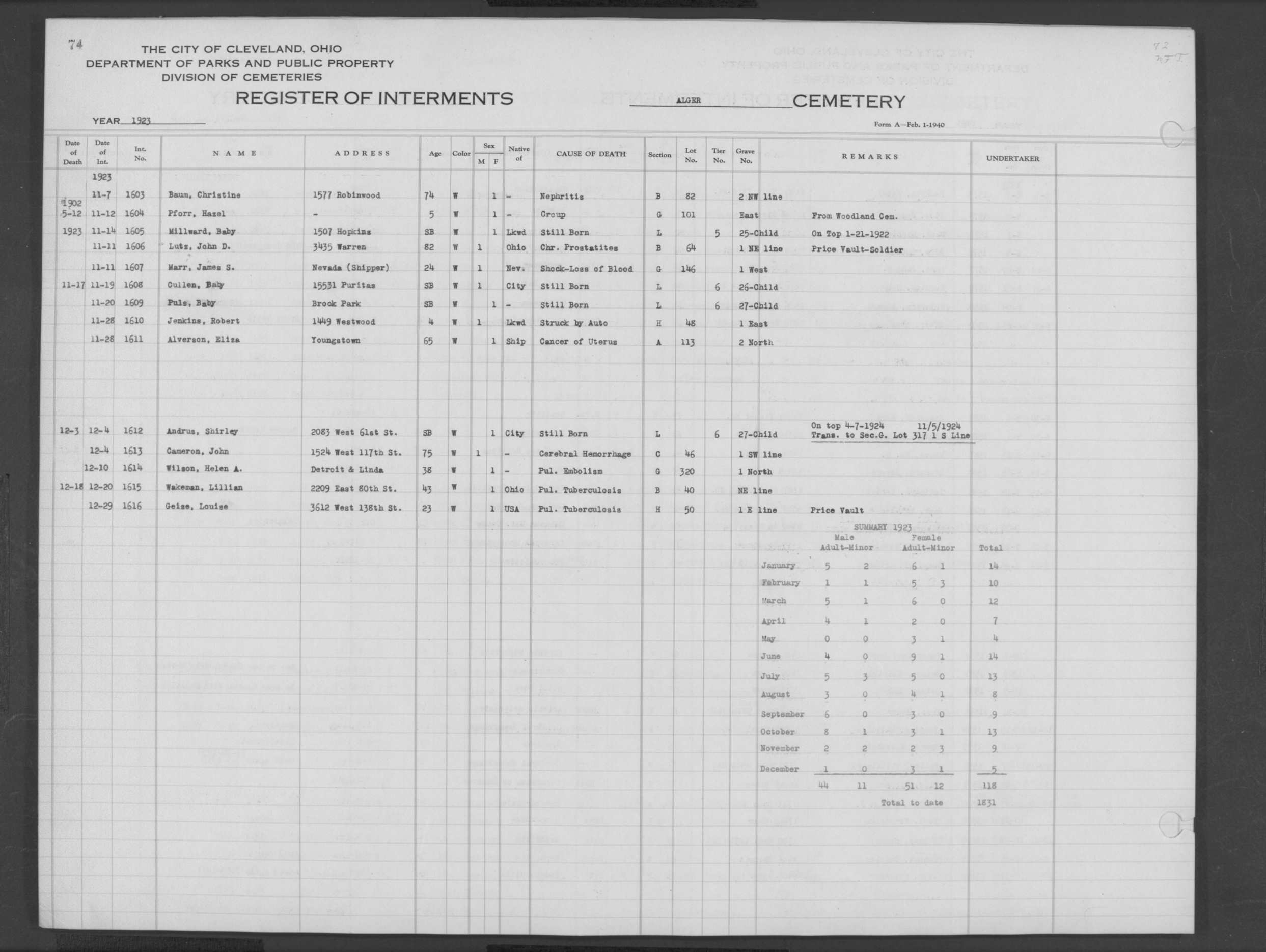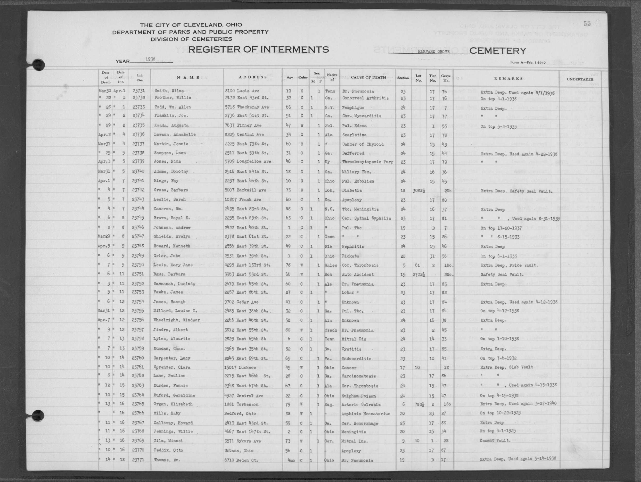 | Harvard Grove | 4 | 170 | Nov | 28 | 1945 | Dec | 1 | 1945 | 27561 | Caddy, Bert Wm | 64y | W | M | |