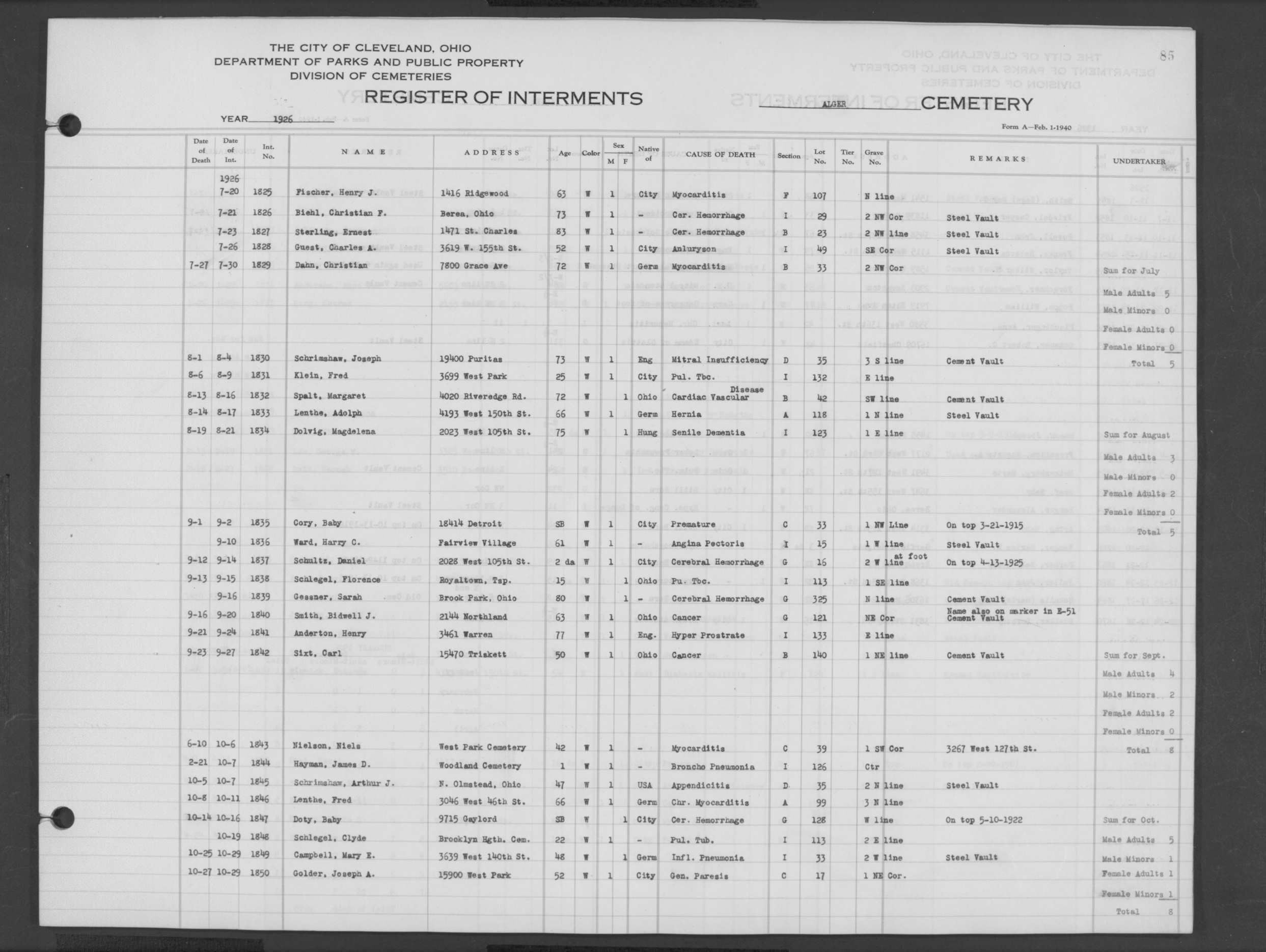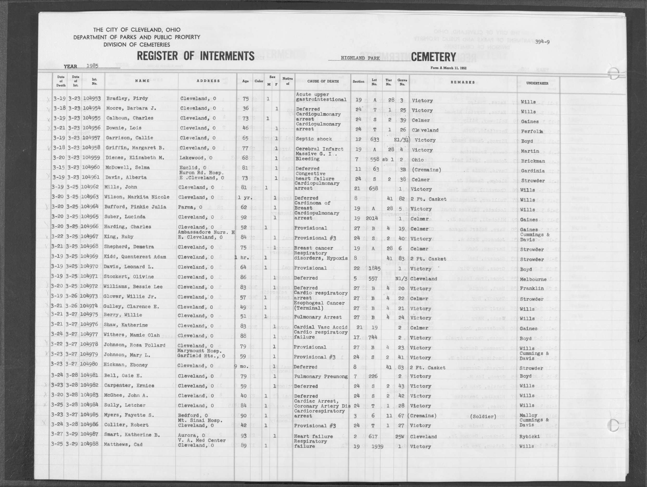 | Highland Park | 9 | 402 | May | 8 | 1985 | May | 11 | 1985 | 105242 | Capak, Anne L | 74y | F | ||