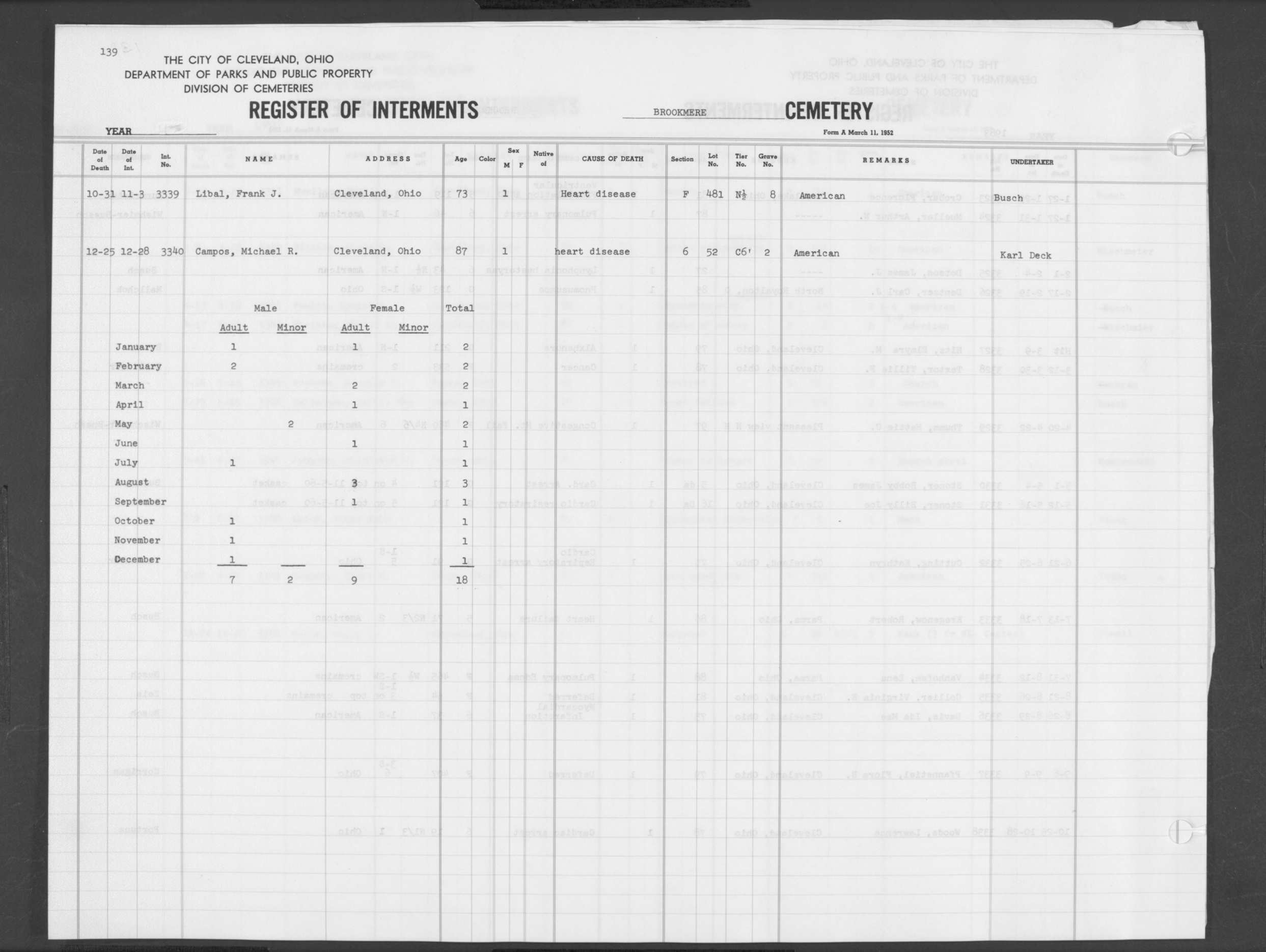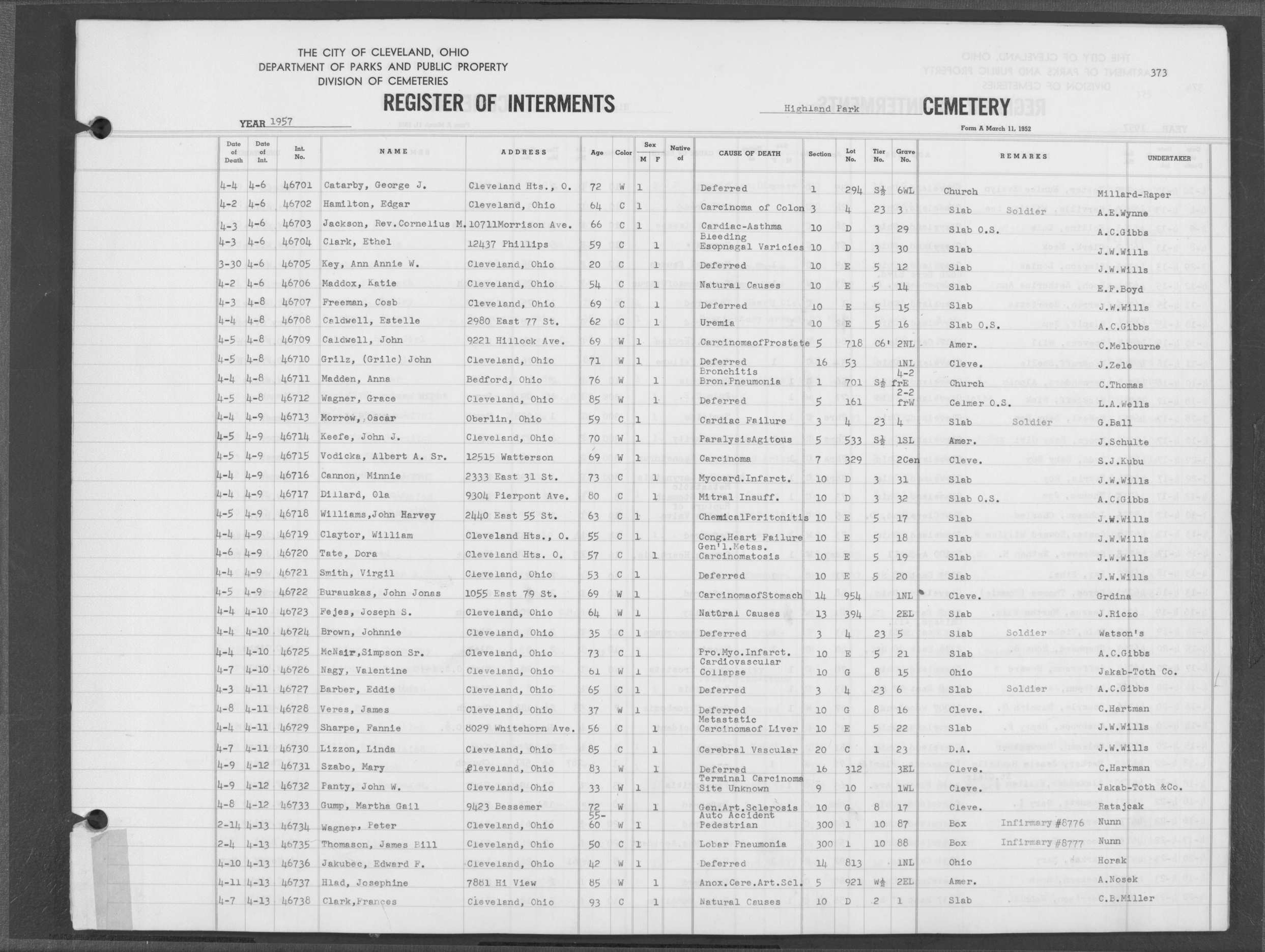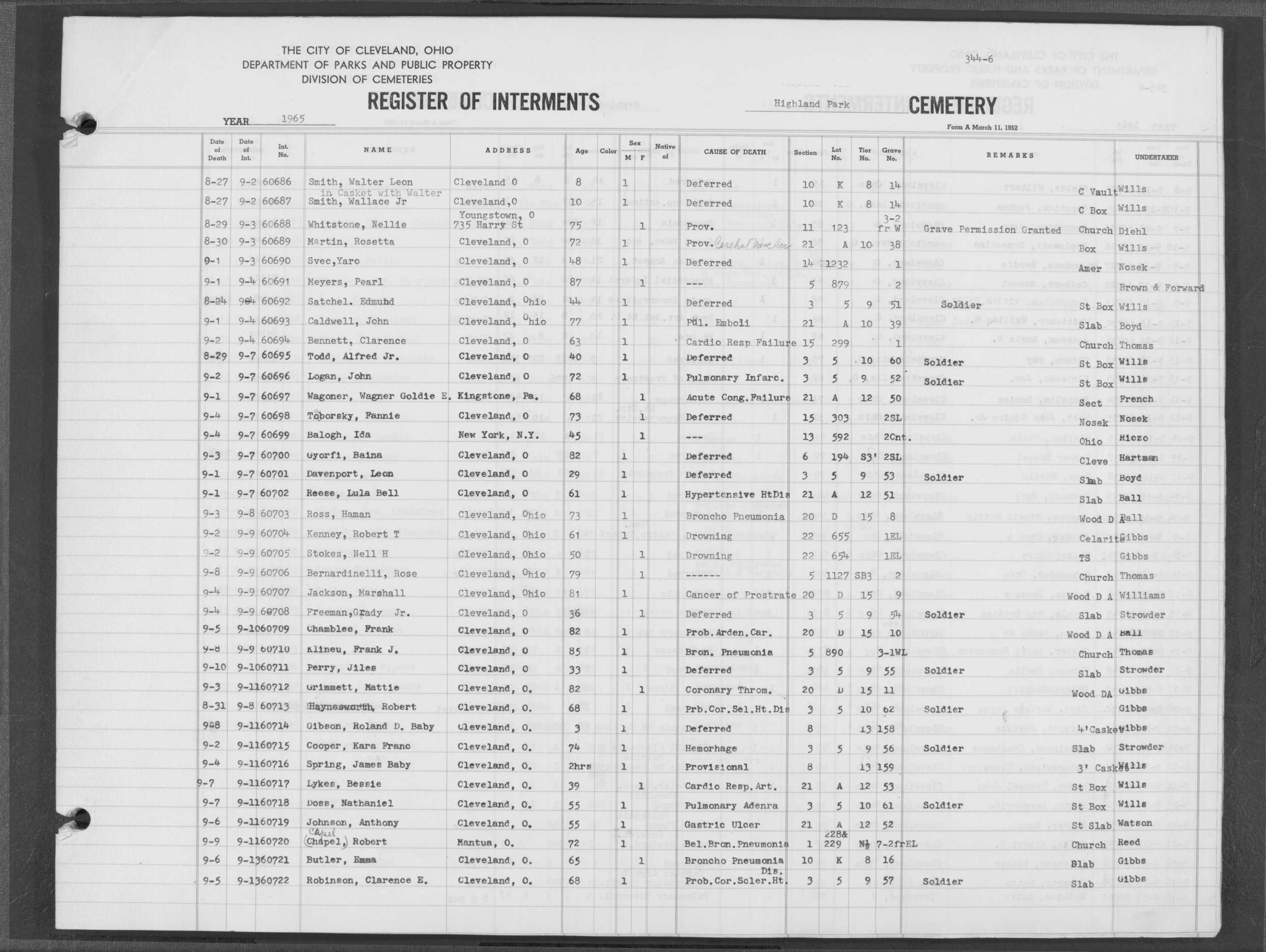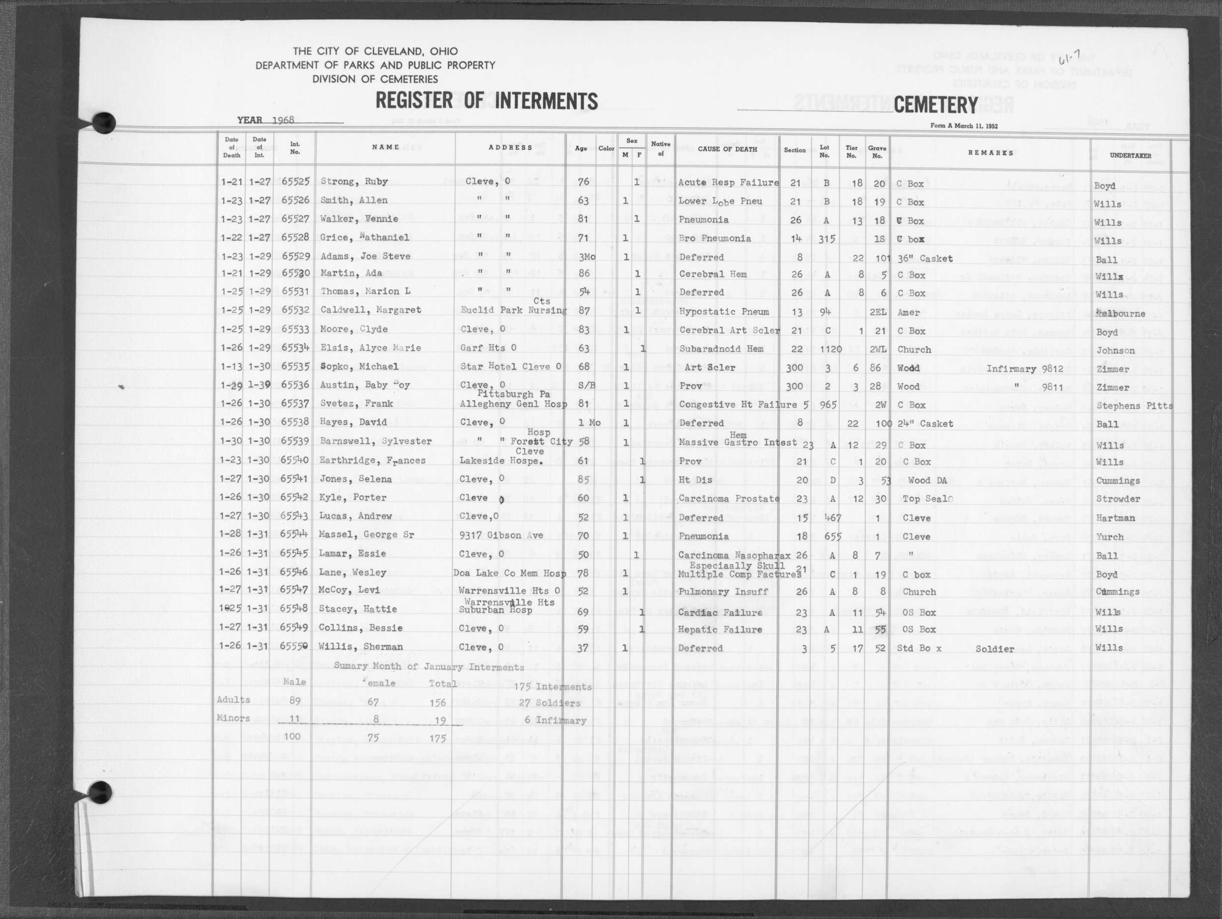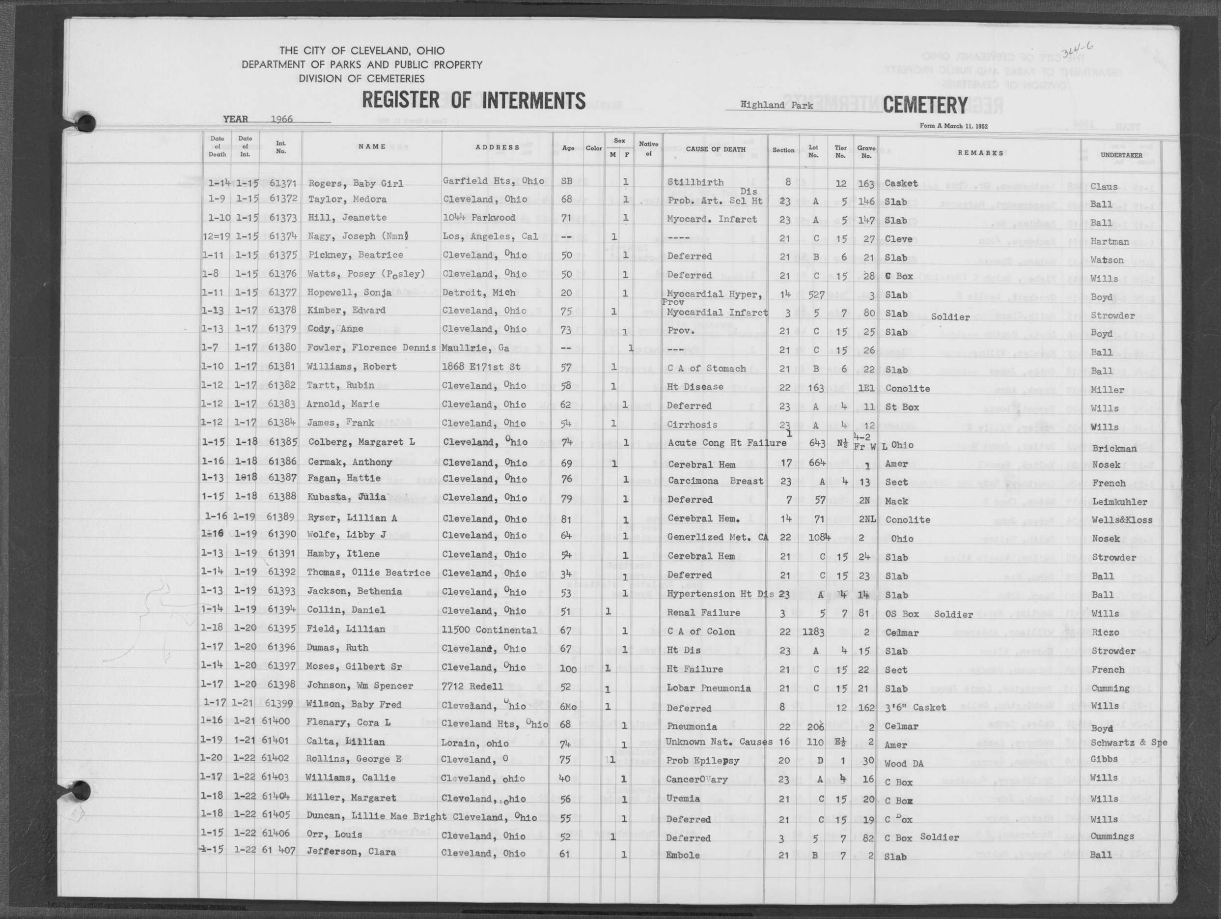 | Highland Park | 6 | 205 | Jan | 25 | 1963 | Jan | 29 | 1963 | 55724 | Cada, James | 82y | M | ||