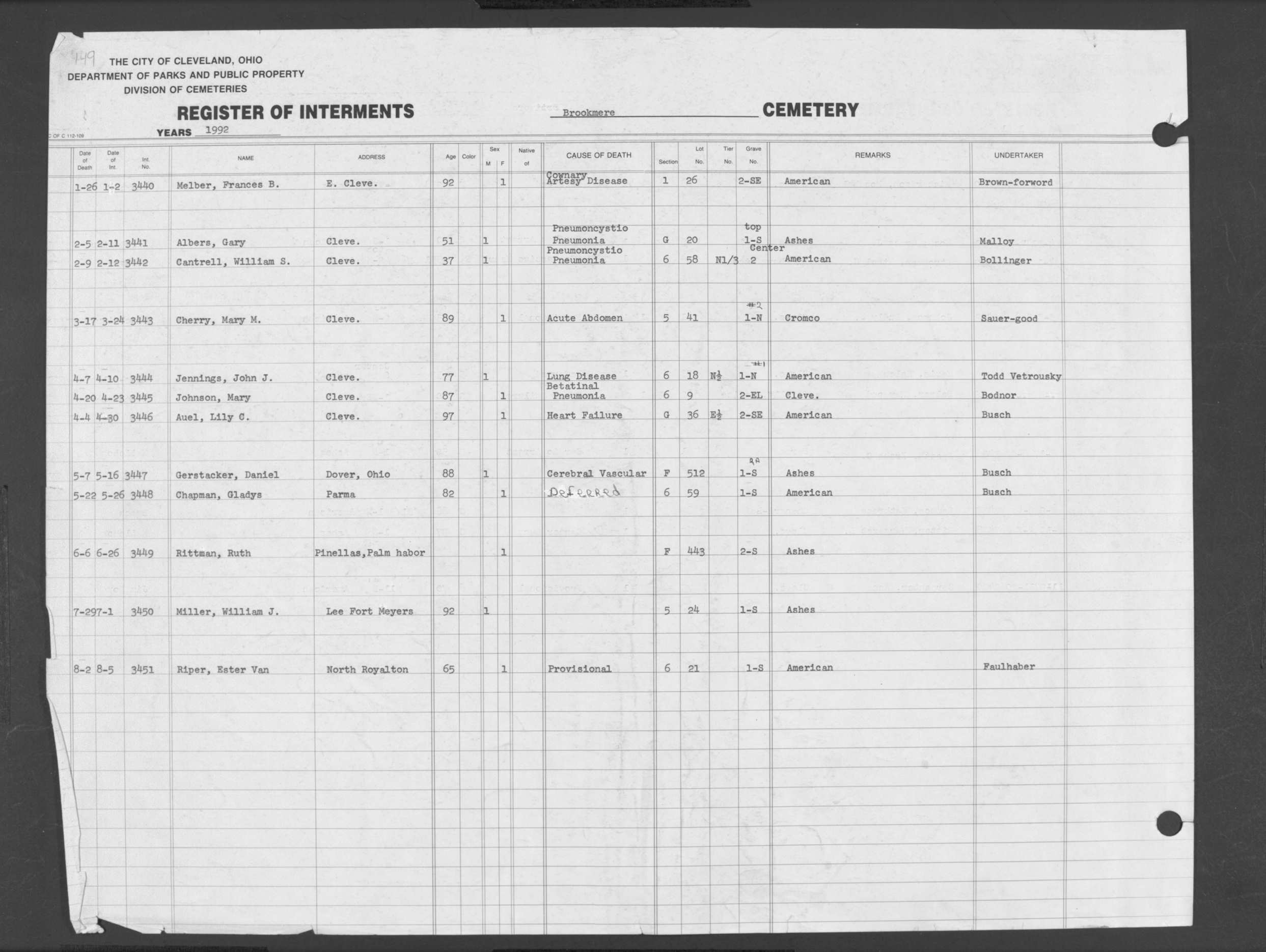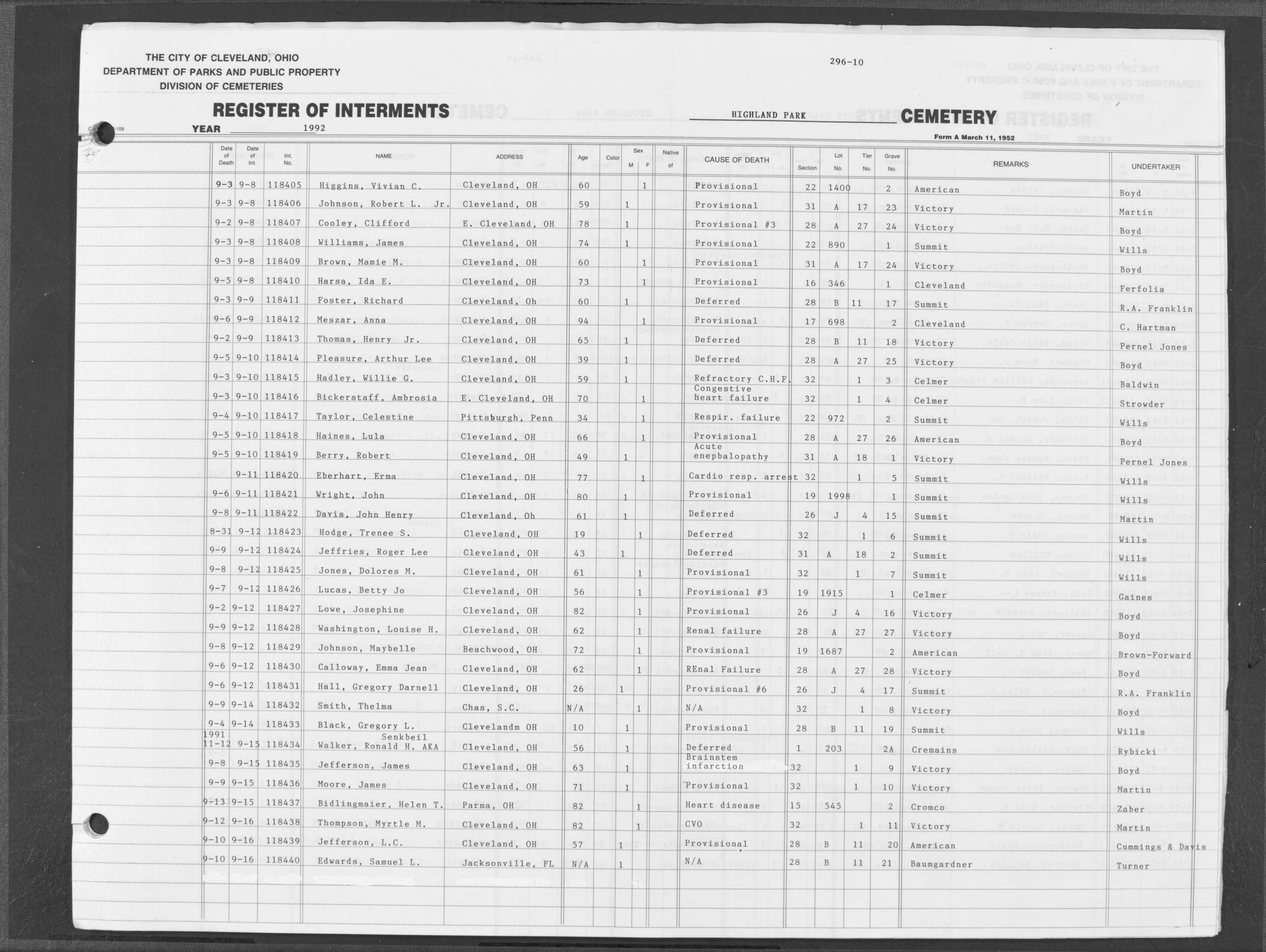 | Highland Park | 10 | 300 | Oct | 10 | 1992 | Oct | 15 | 1992 | 118551 | Capito, James | 80y | M | ||