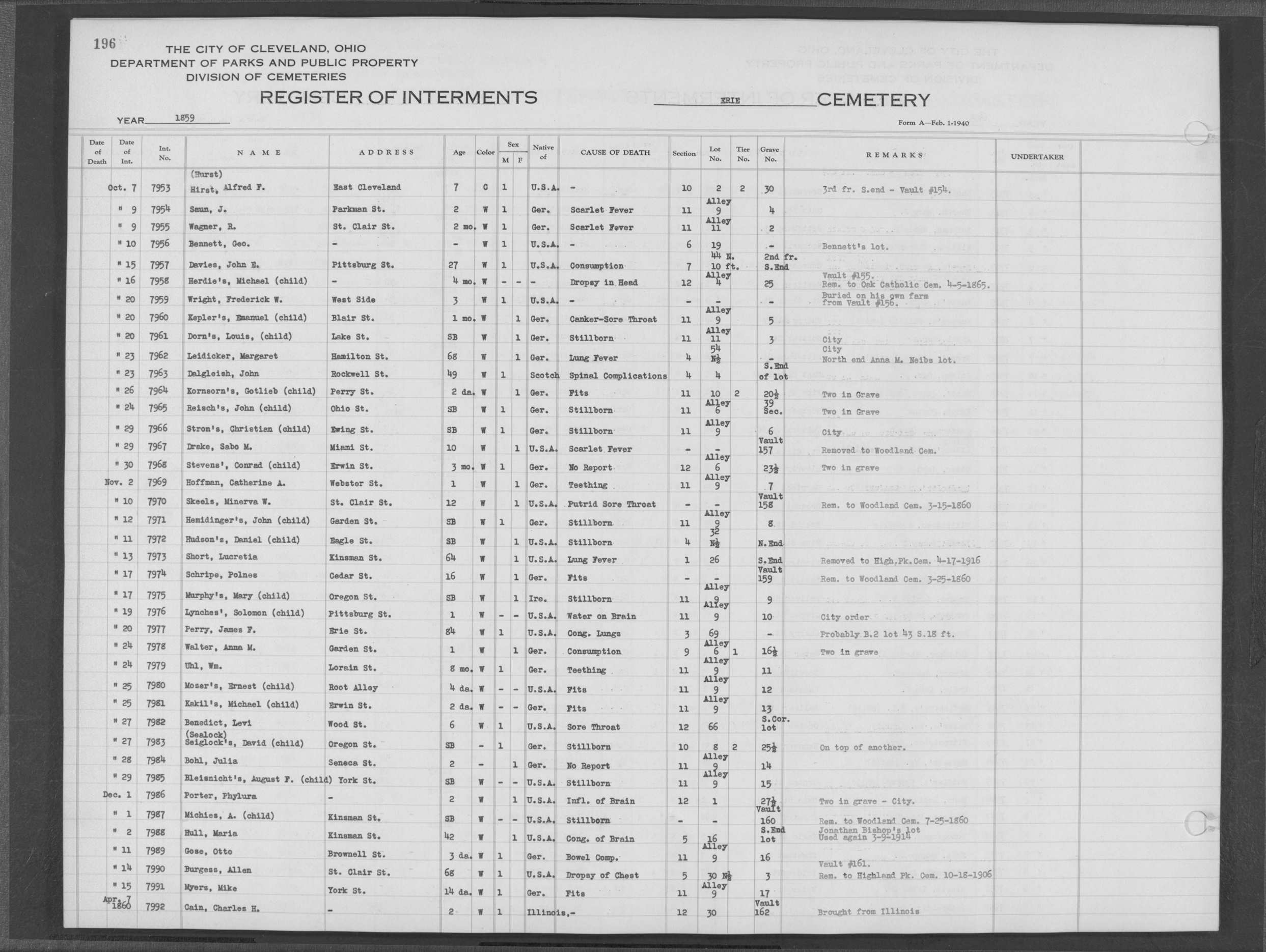 | Erie Street | 1 | 177 | May | 30 | 1857 | 7225 | Capener, B F | 19m | W | M | ||||