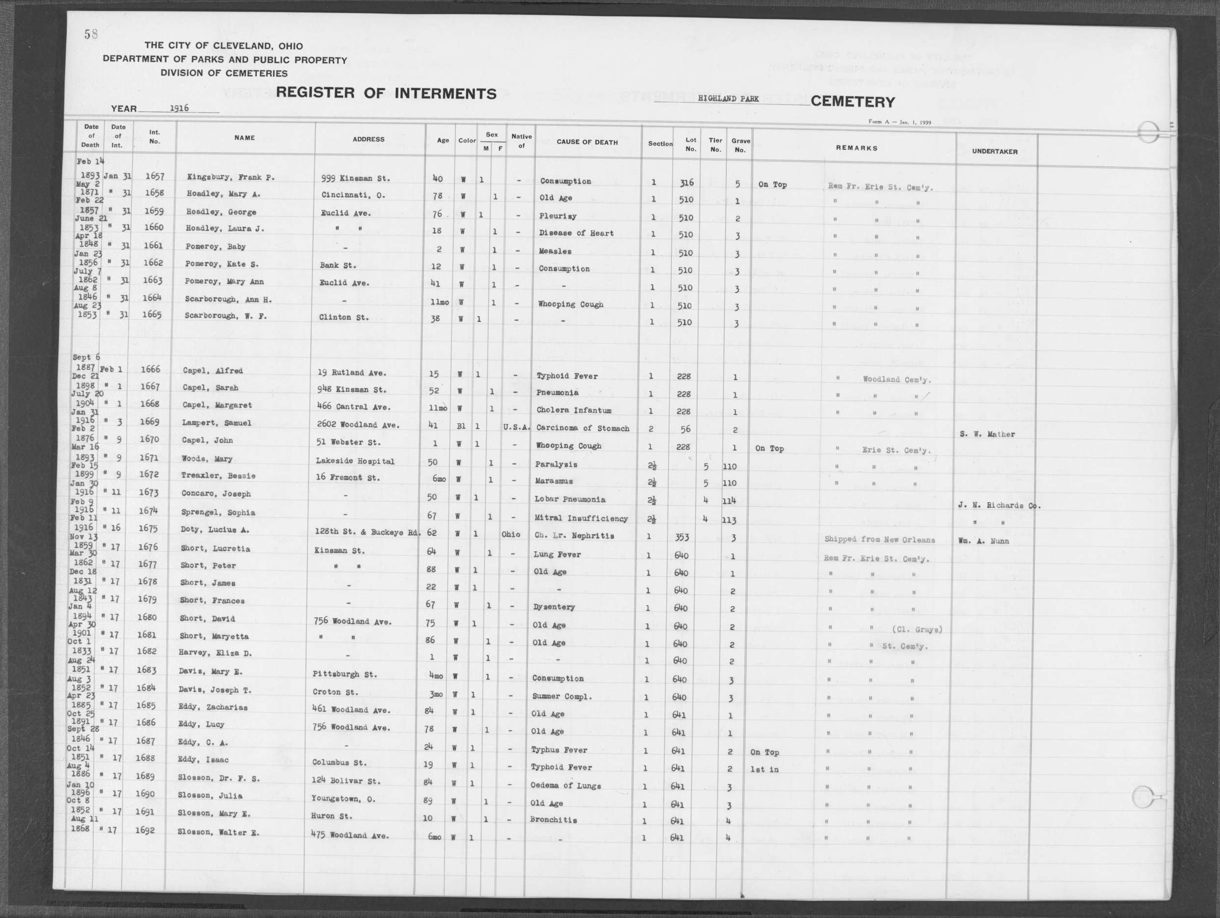 | Highland Park | 1 | 58 | Dec | 21 | 1898 | Feb | 1 | 1916 | 1667 | Capel, Sarah | 52y | W | F | |