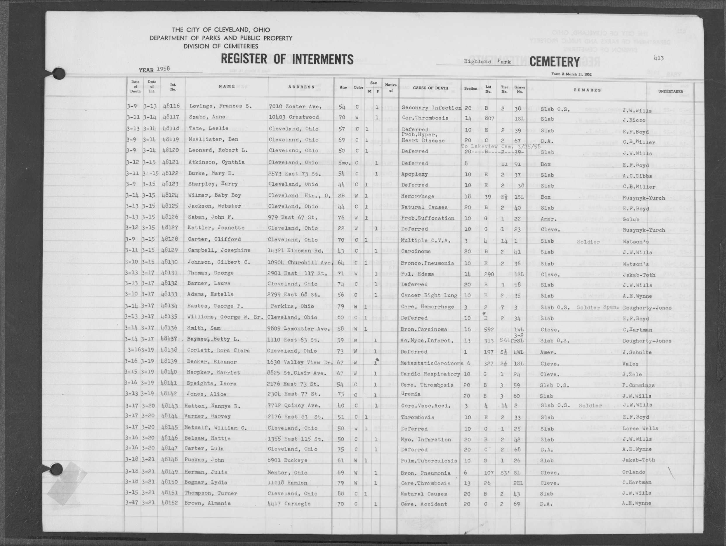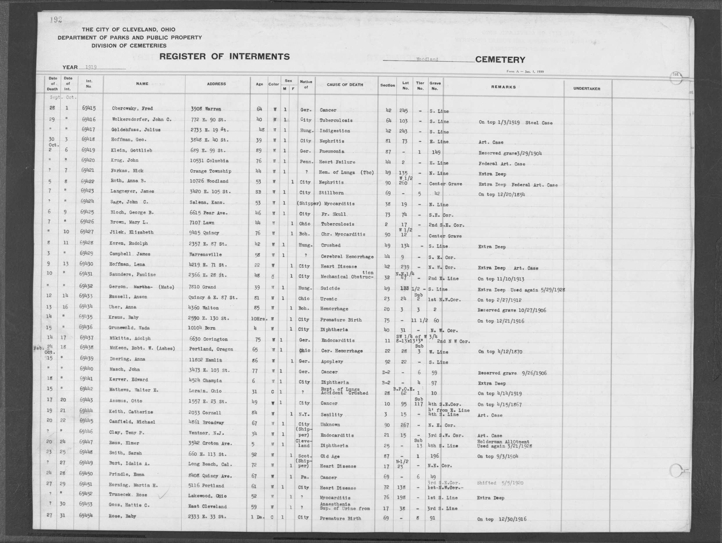 | West Park | 1 | 207 | Oct | 28 | 1920 | 6909 | Caban, Susie | 62y | W | F | ||||