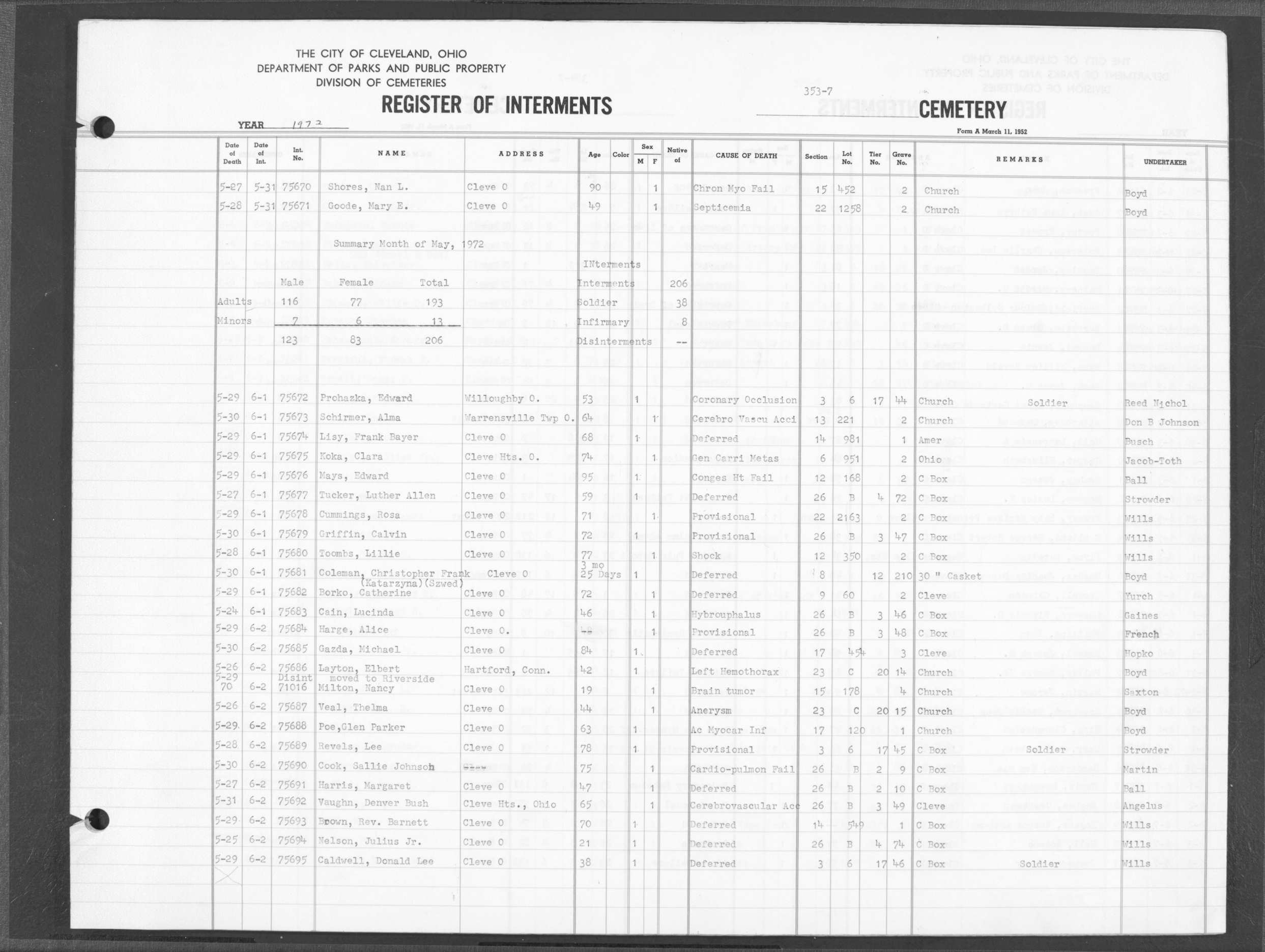 | Harvard Grove | 4 | 228 | Mar | 9 | 1956 | Mar | 12 | 1956 | 28902 | Caddy, Ronald J | 45y | W | M | |
