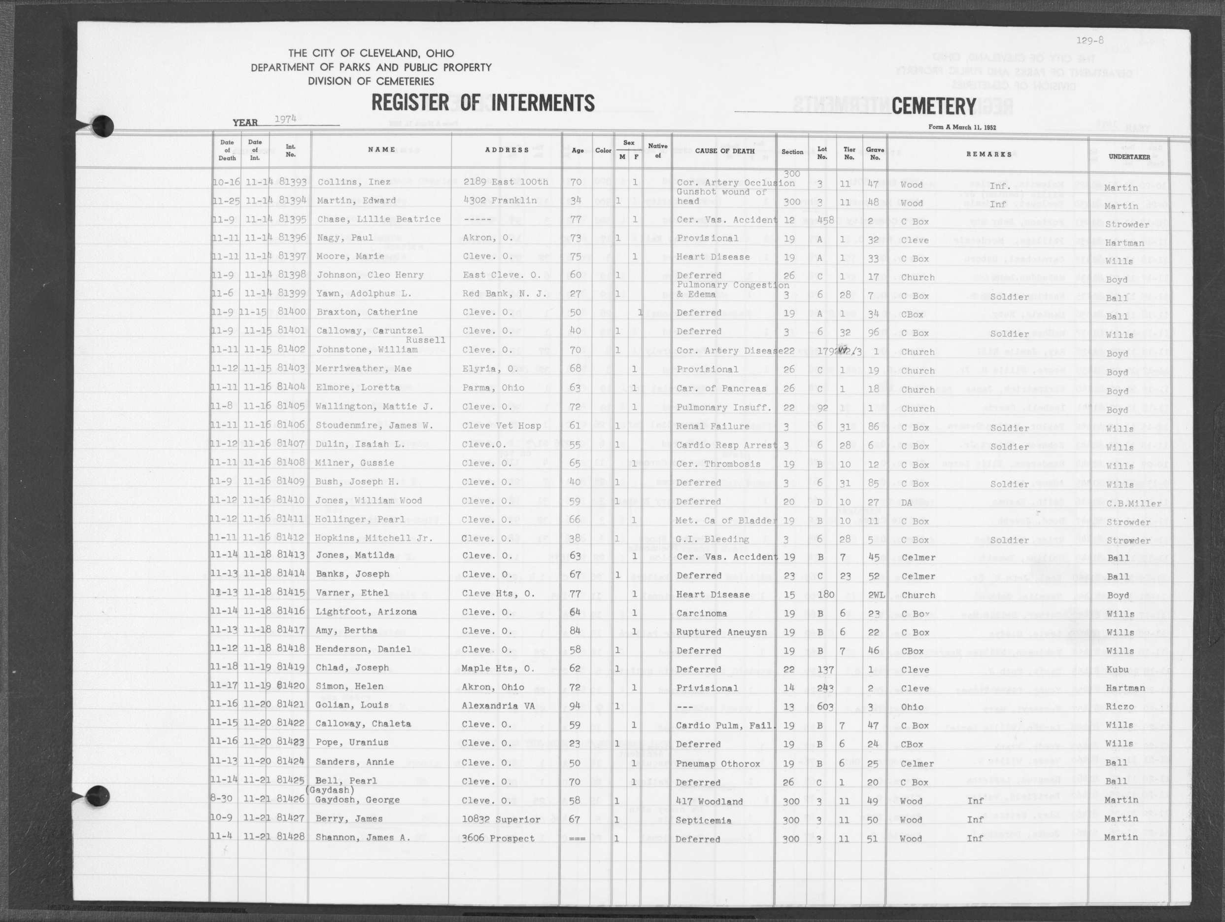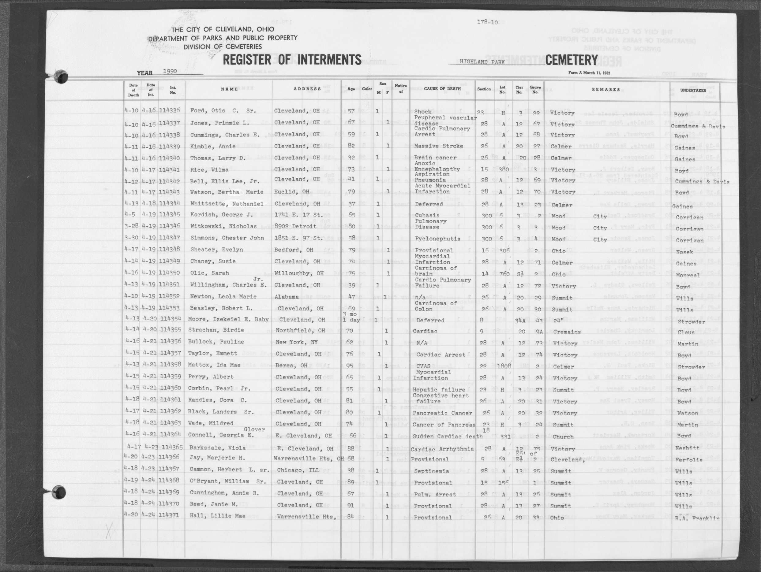 | Highland Park | 4 | 74 | Jan | 1940 | Jan | 9 | 1940 | 25774 | Capek, James | 70y | W | M | ||