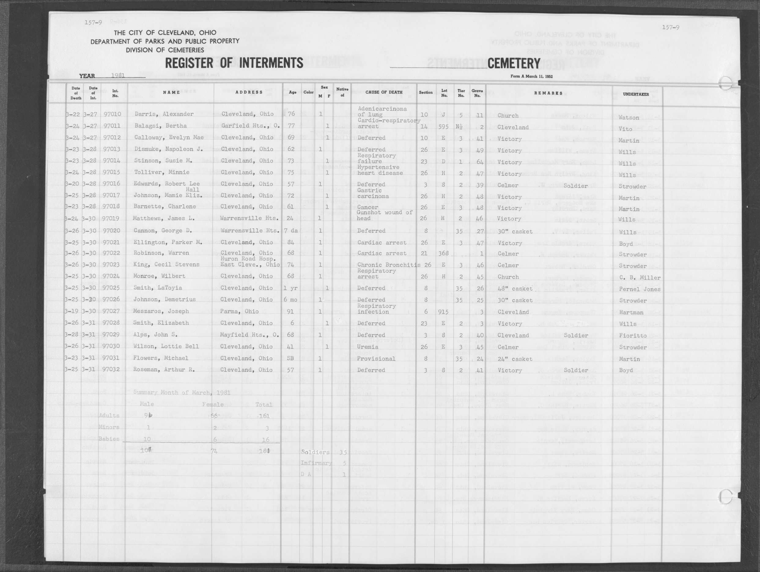 | Highland Park | 9 | 151 | Feb | 18 | 1981 | Feb | 21 | 1981 | 96786 | Capers, Anna Mae | 62y | F | ||