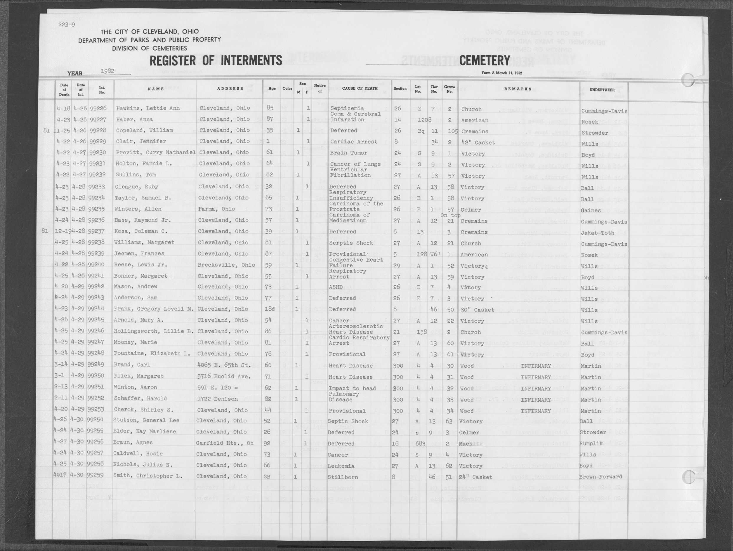 | West Park | 6 | 63A | Apr | 4 | 1983 | Apr | 6 | 1983 | 40919 | Canty, Andrew | 52y | M | ||