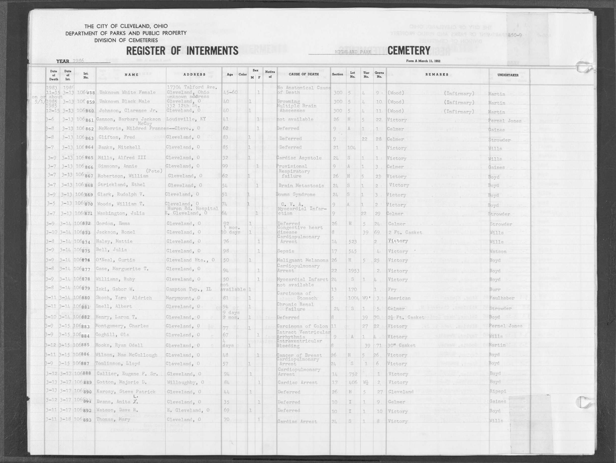 | Highland Park | 9 | 292 | Jun | 21 | 1983 | Jun | 27 | 1983 | 101535 | Cabiness, William | 64y | M | ||