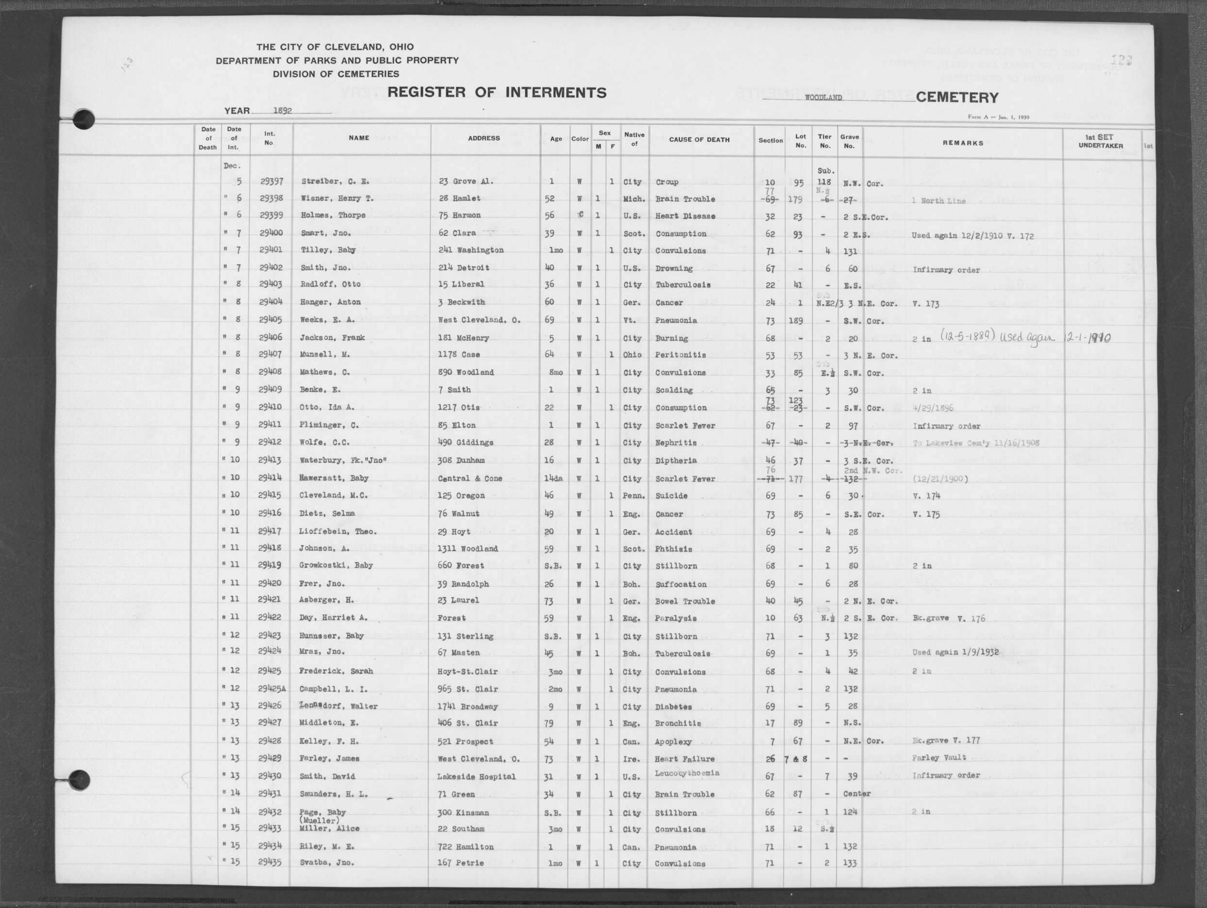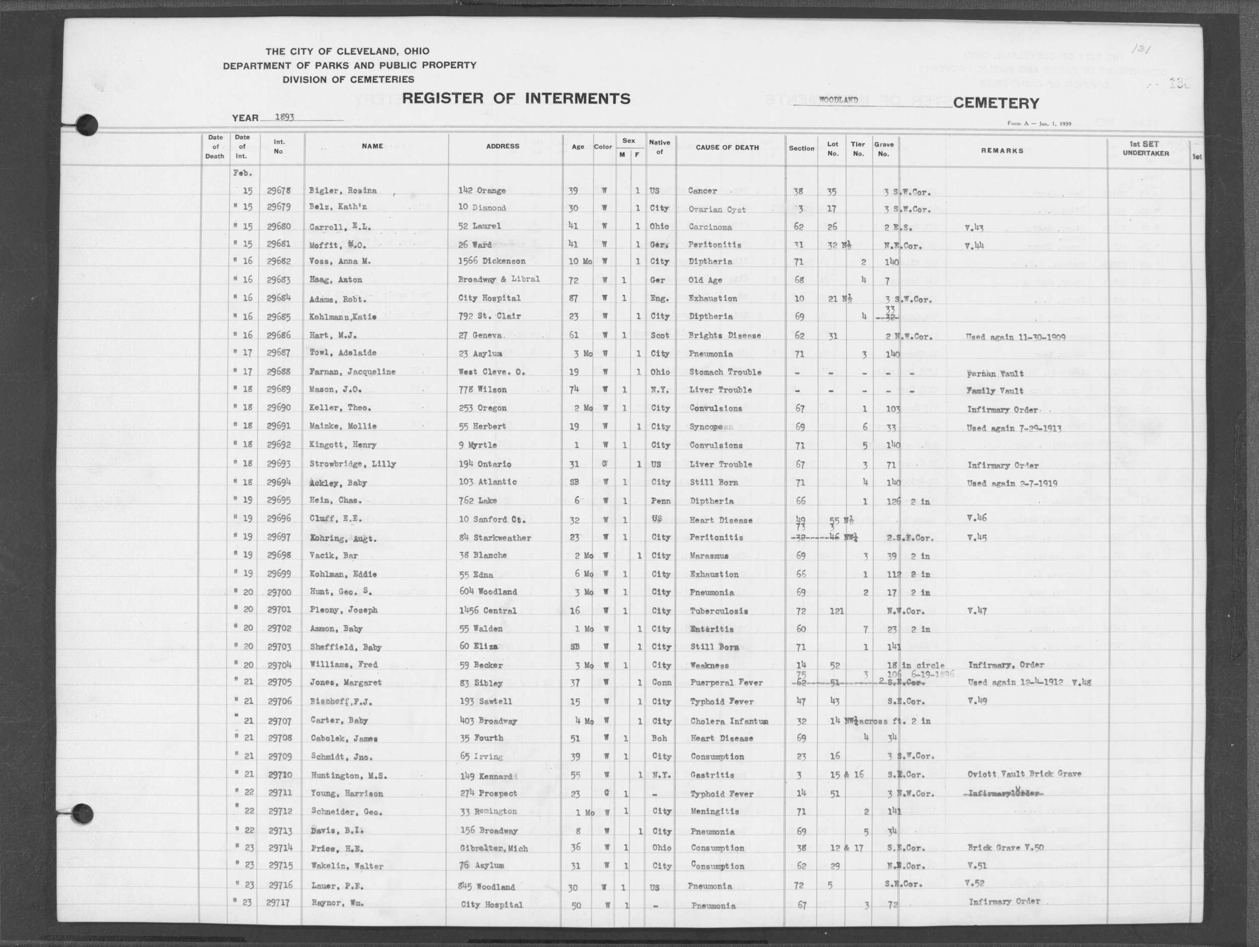| Woodland | 4 | 131 | Feb | 21 | 1893 | 29708 | Cabolek, James | 51y | W | M | ||||