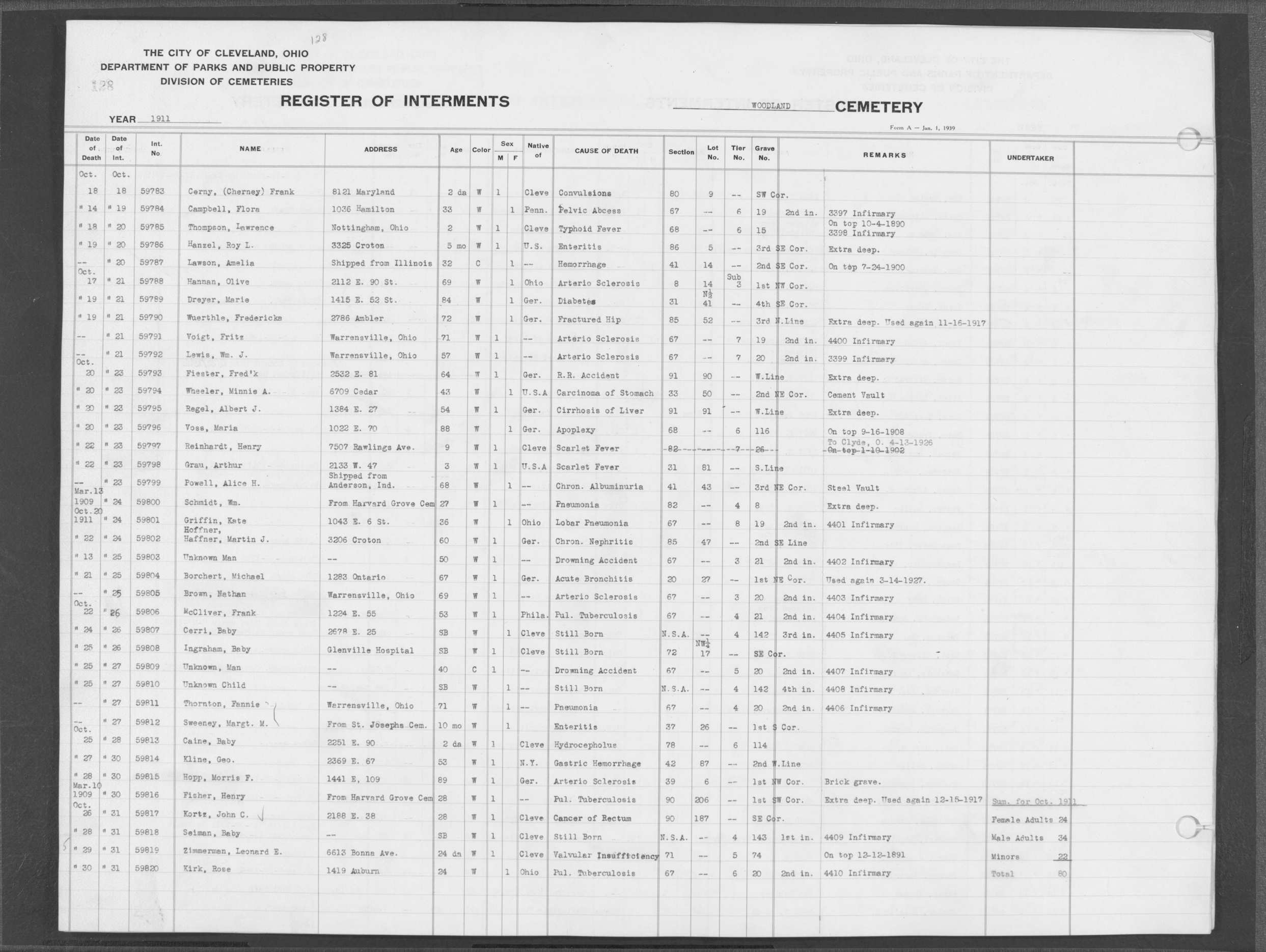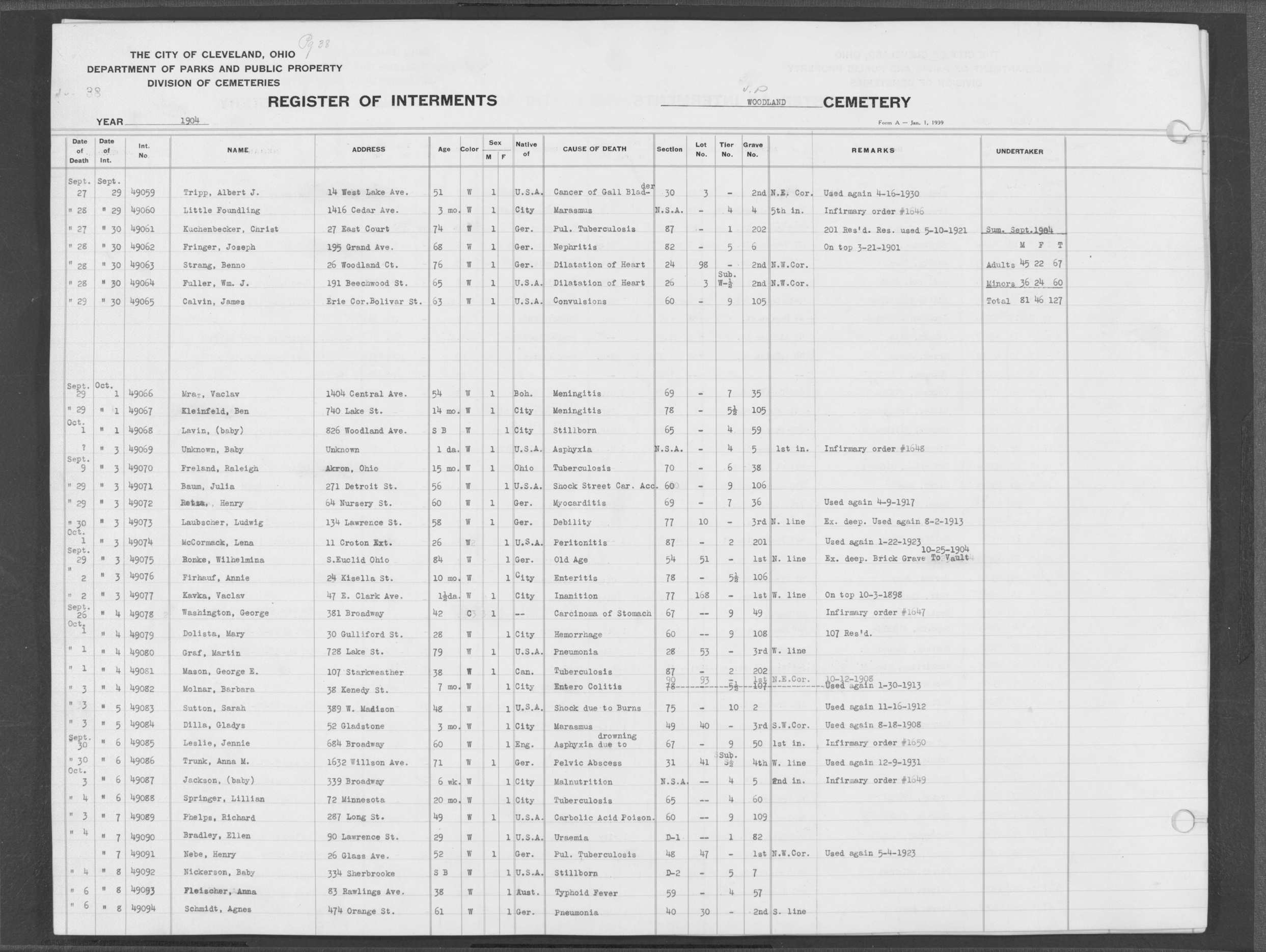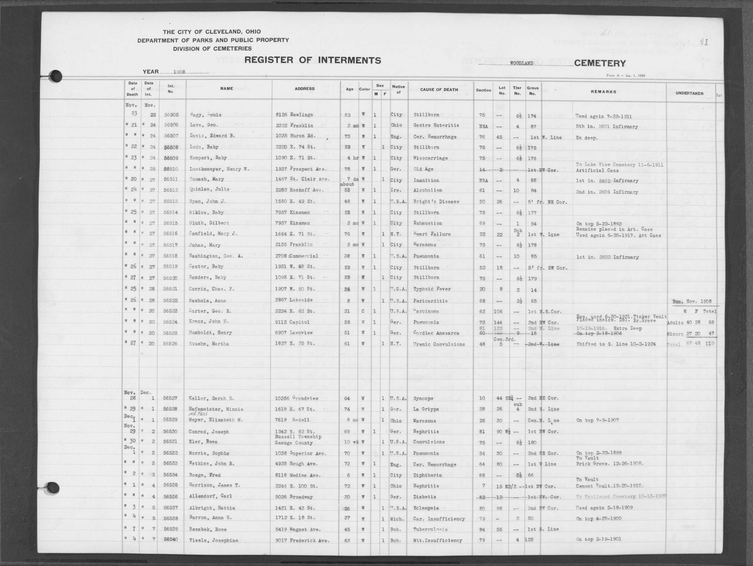 | Woodland | 8 | 38 | Oct | 23 | 1908 | Oct | 26 | 1908 | 56391 | Cabradek, Benjamin | 12y | W | M | |