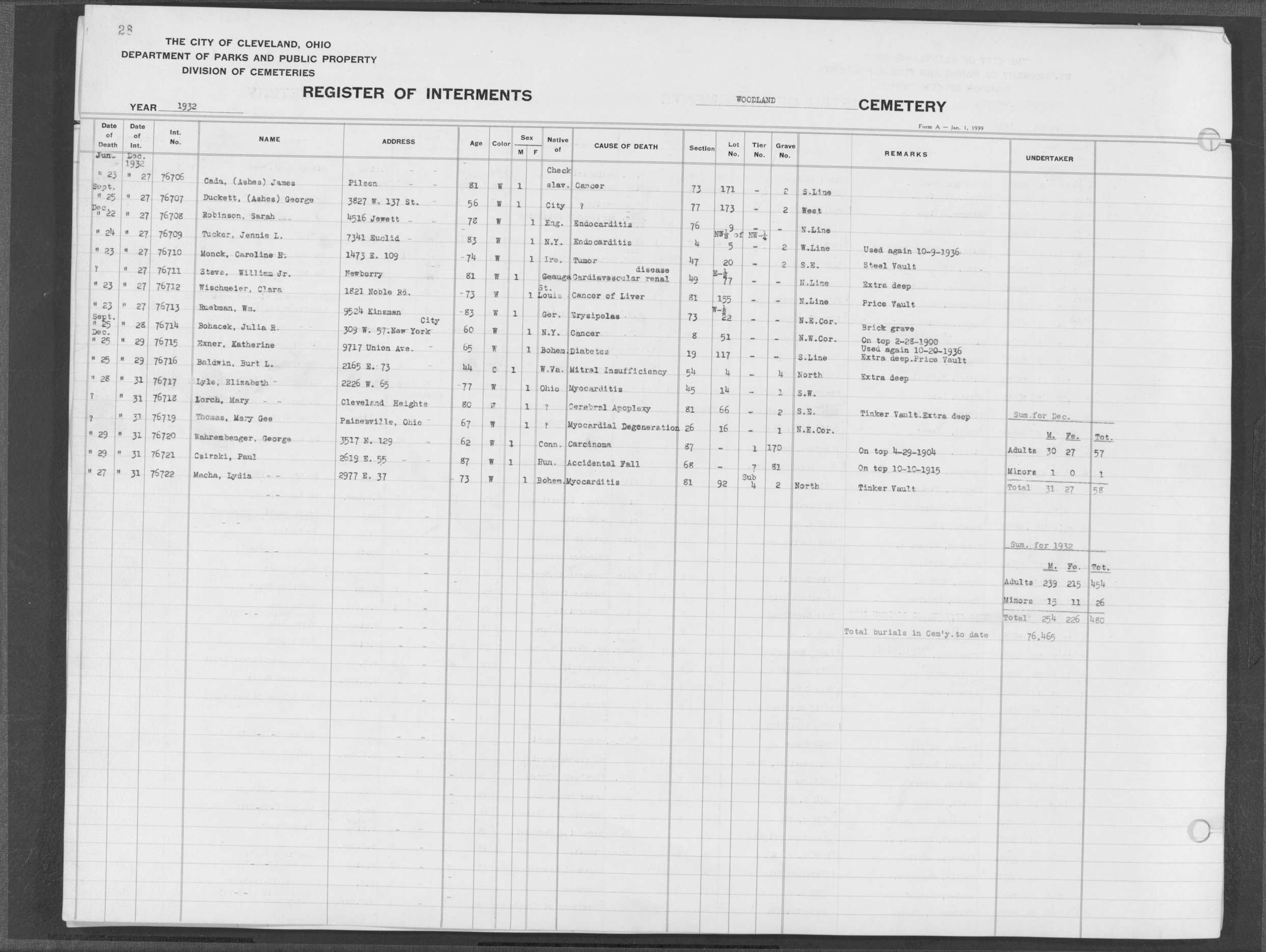 | Woodland | 11 | 28 | Jun | 23 | 1932 | Dec | 27 | 1932 | 76706 | Cada, James | 81y | W | M | |