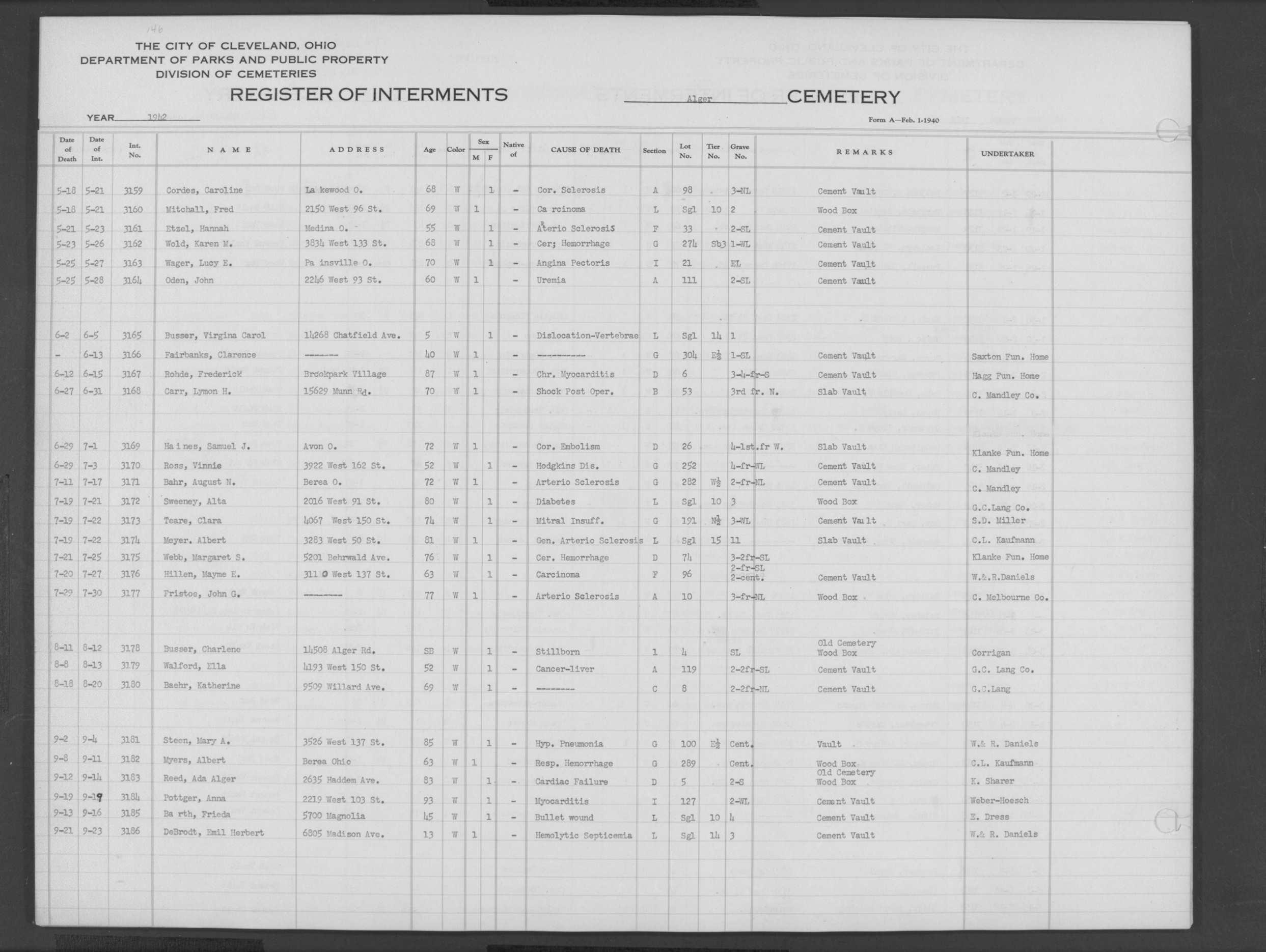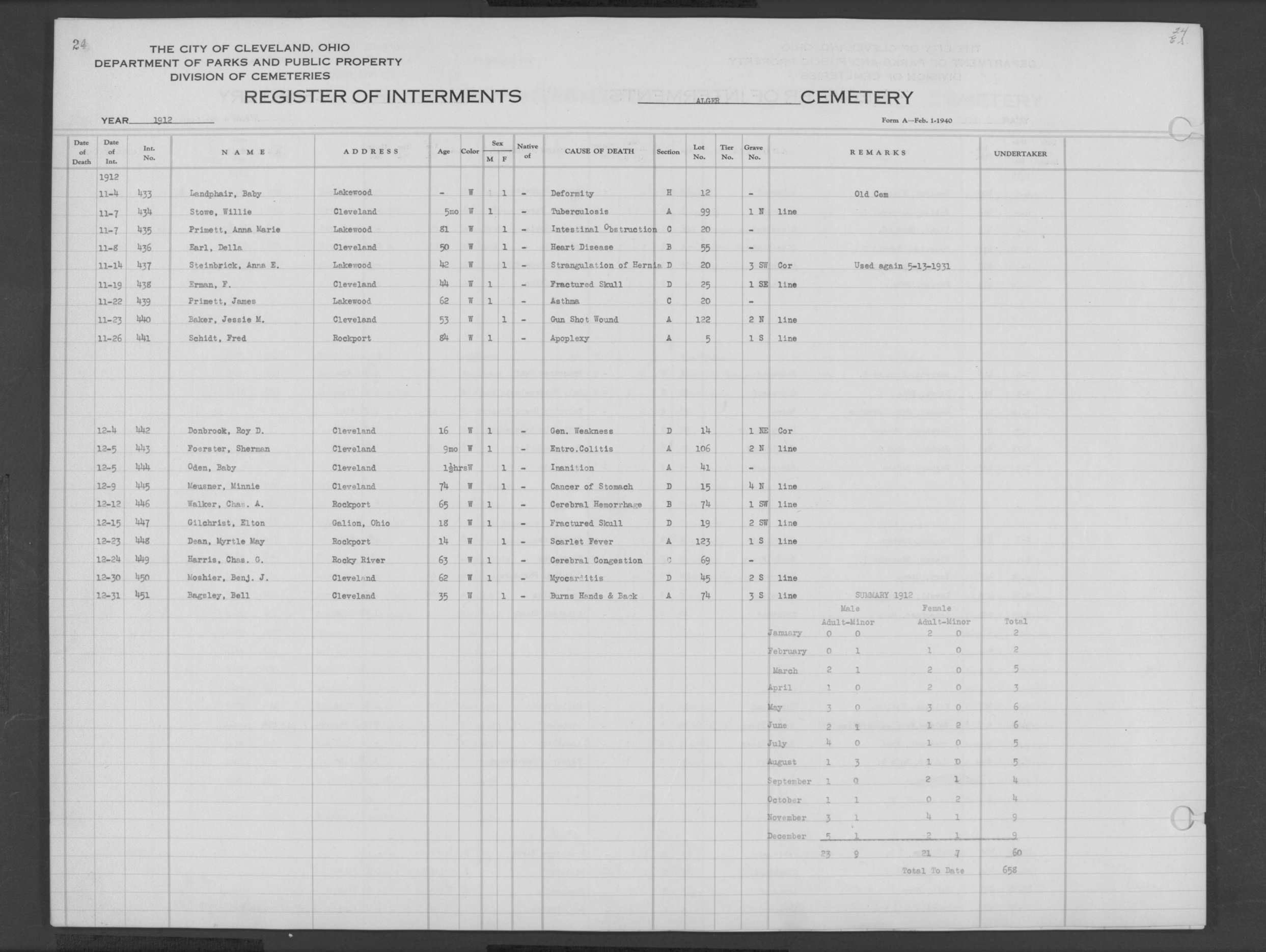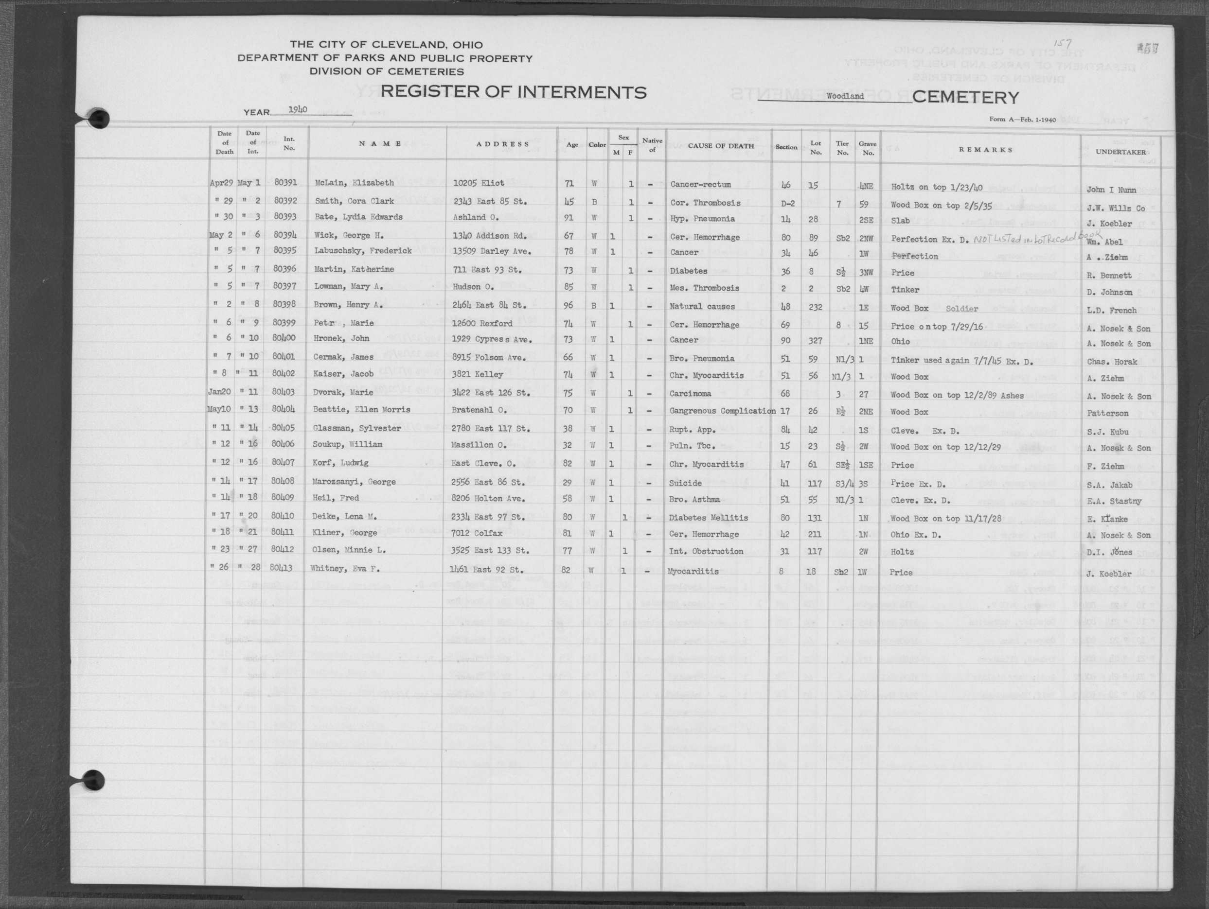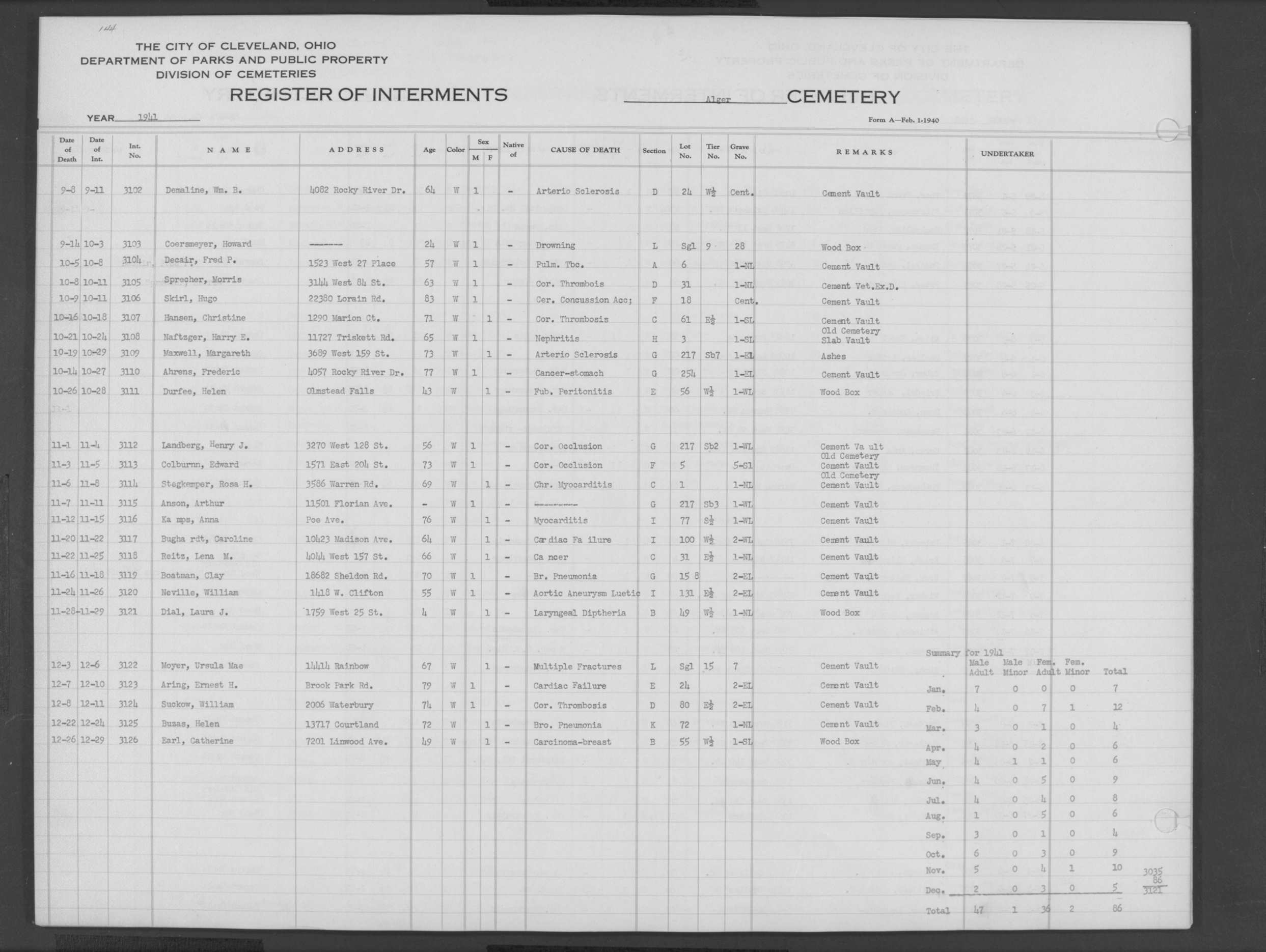 | Harvard Grove | 4 | 94 | Feb | 10 | 1940 | Feb | 12 | 1940 | 25123 | Deacon, Robert E | 58y | W | M | |