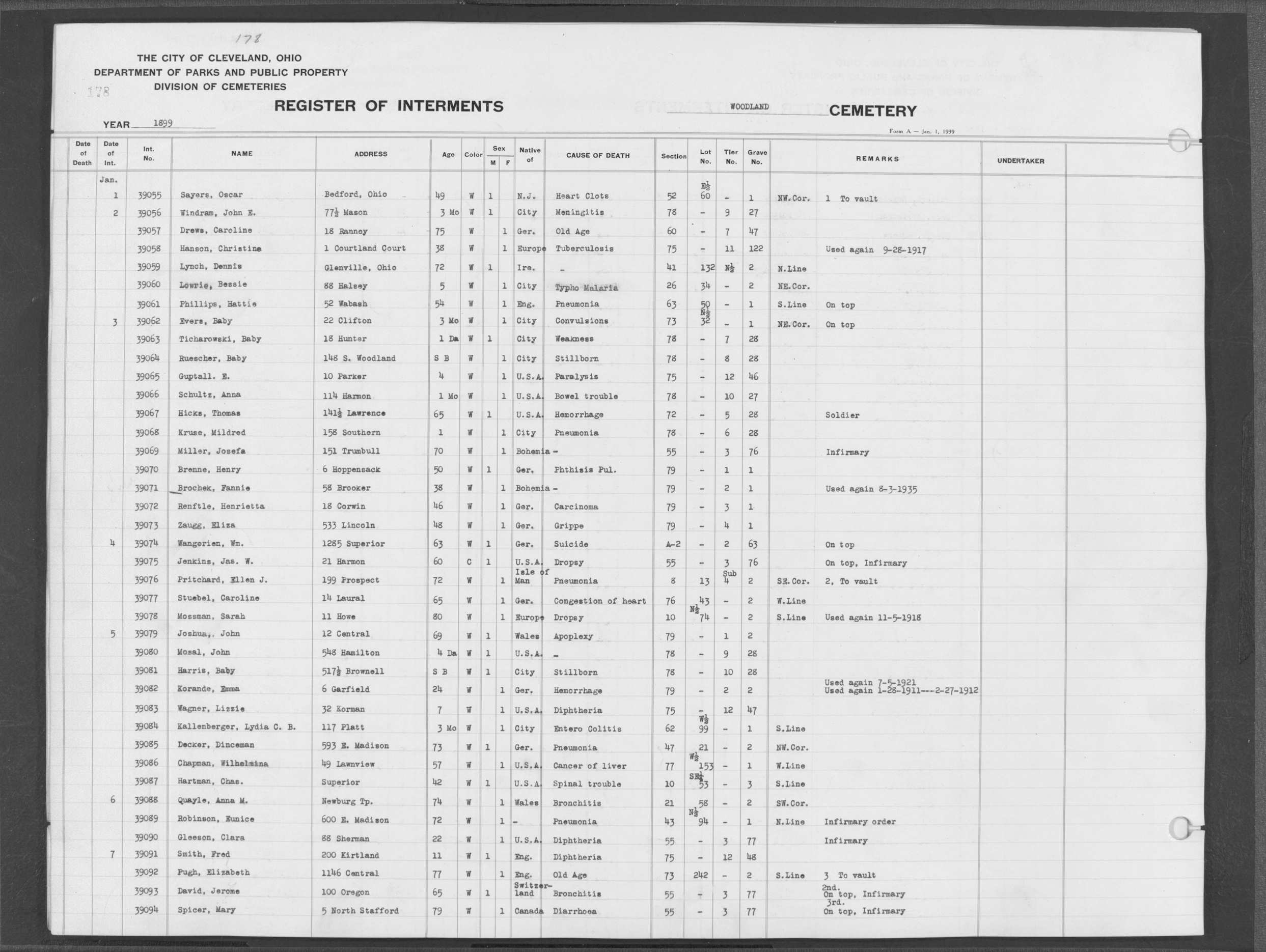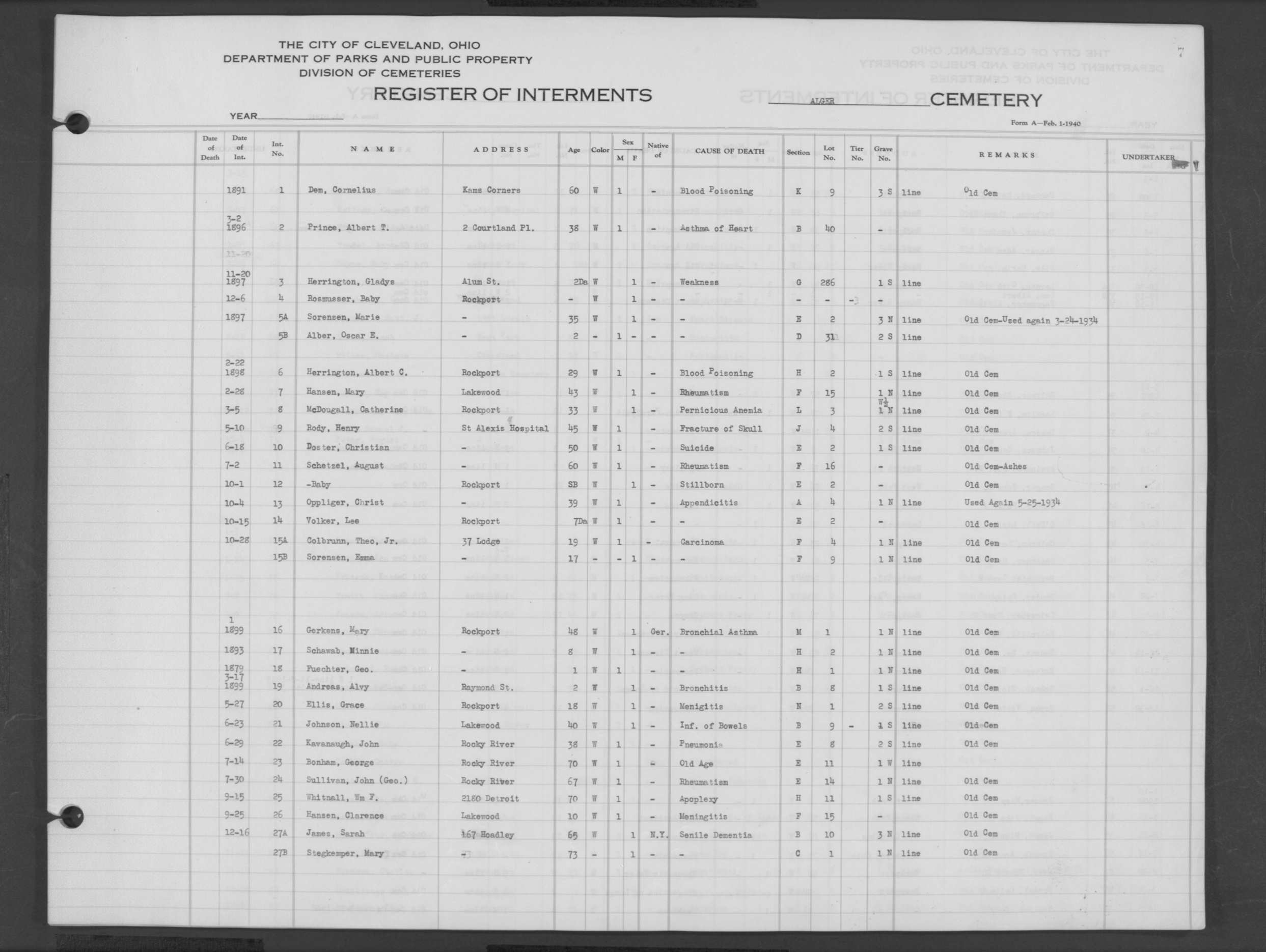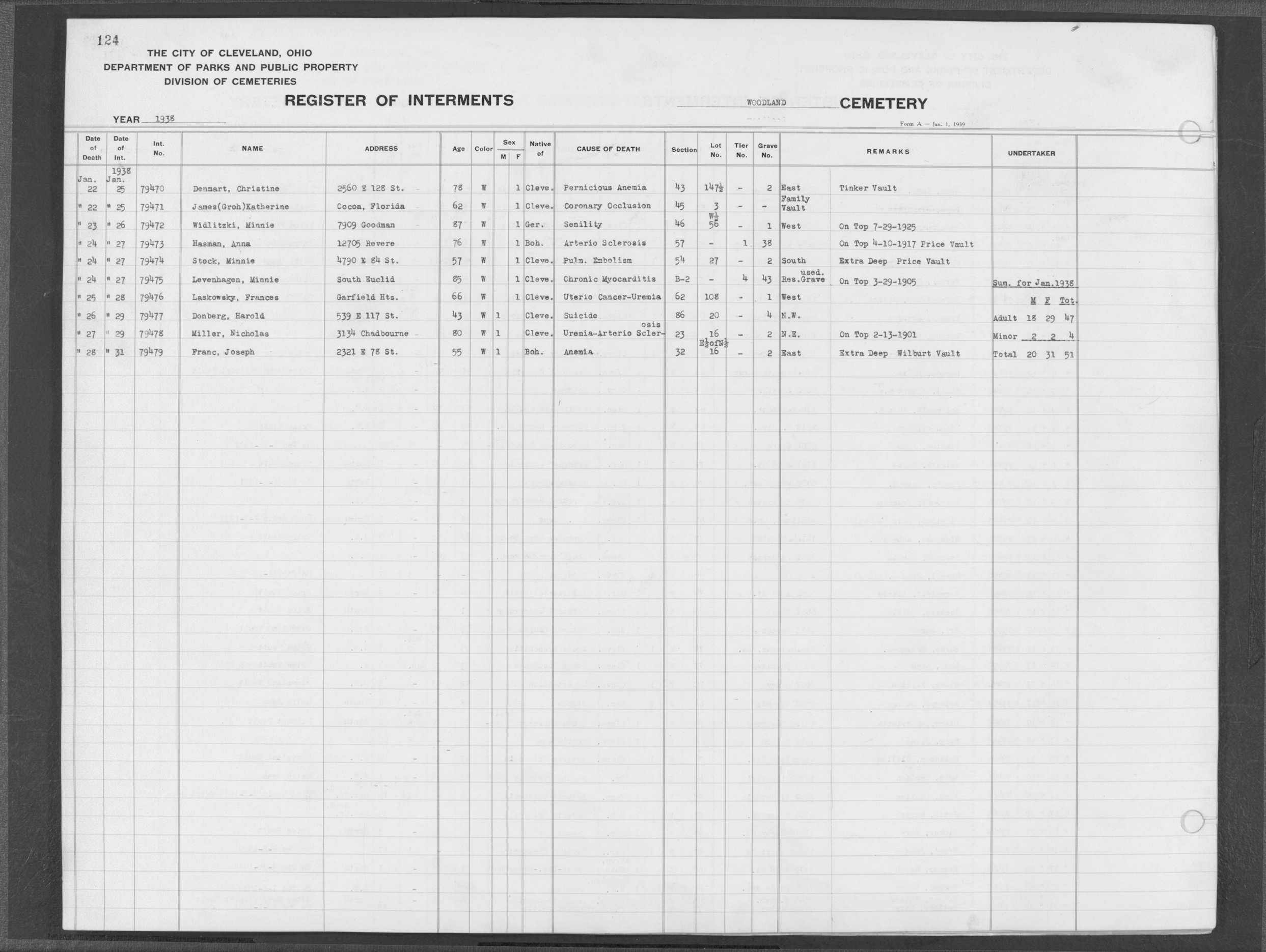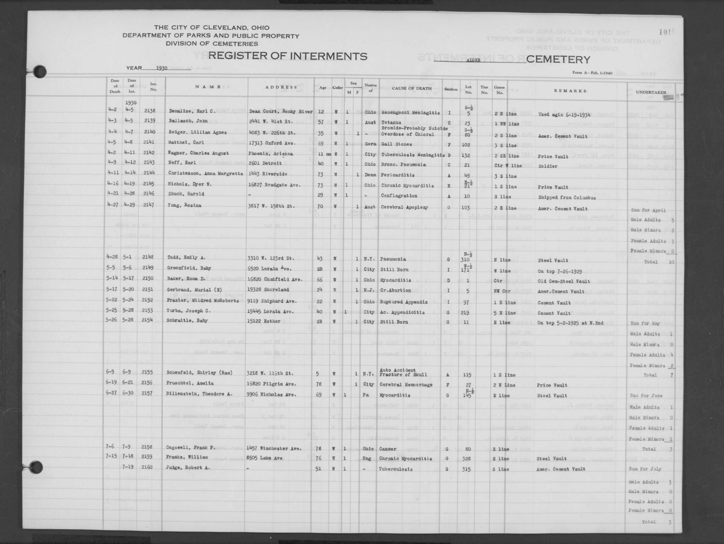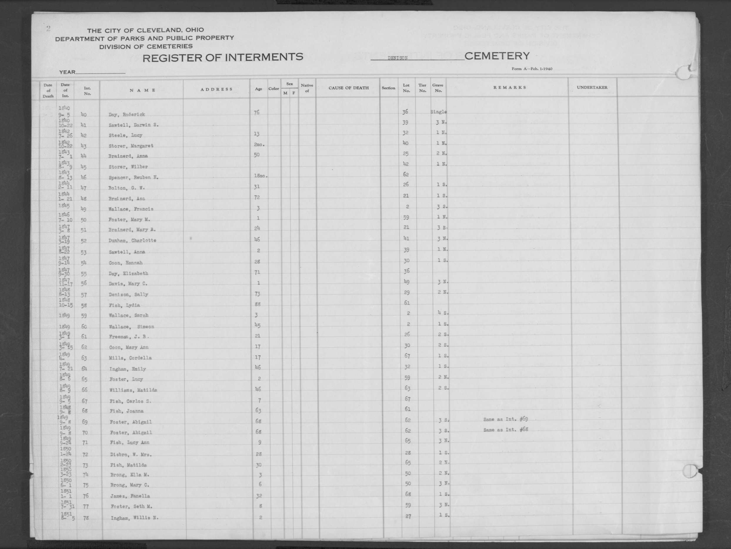 | Harvard Grove | 4 | 94 | Feb | 10 | 1940 | Feb | 12 | 1940 | 25123 | Deacon, Robert E | 58y | W | M | |