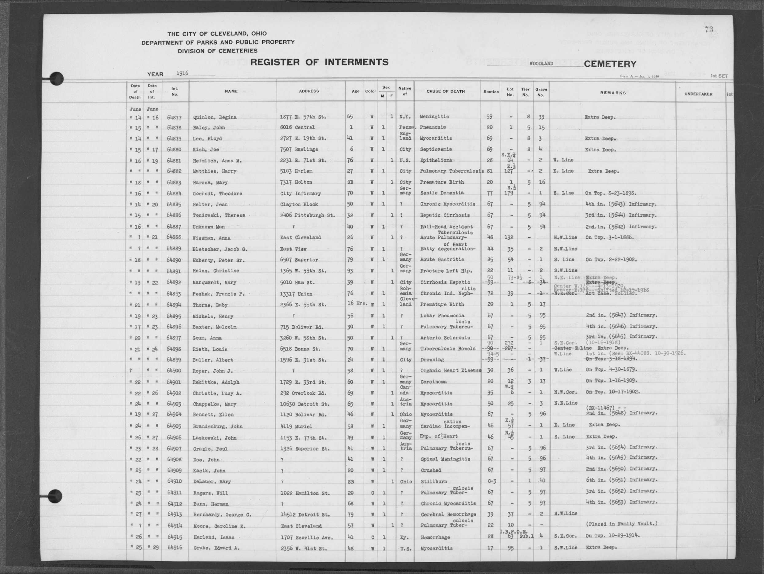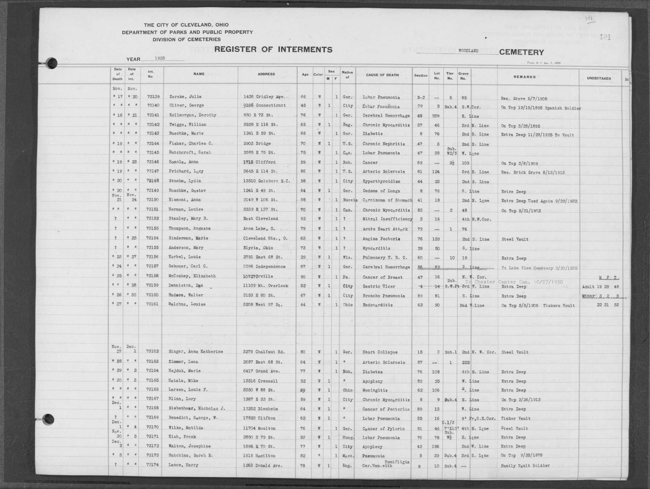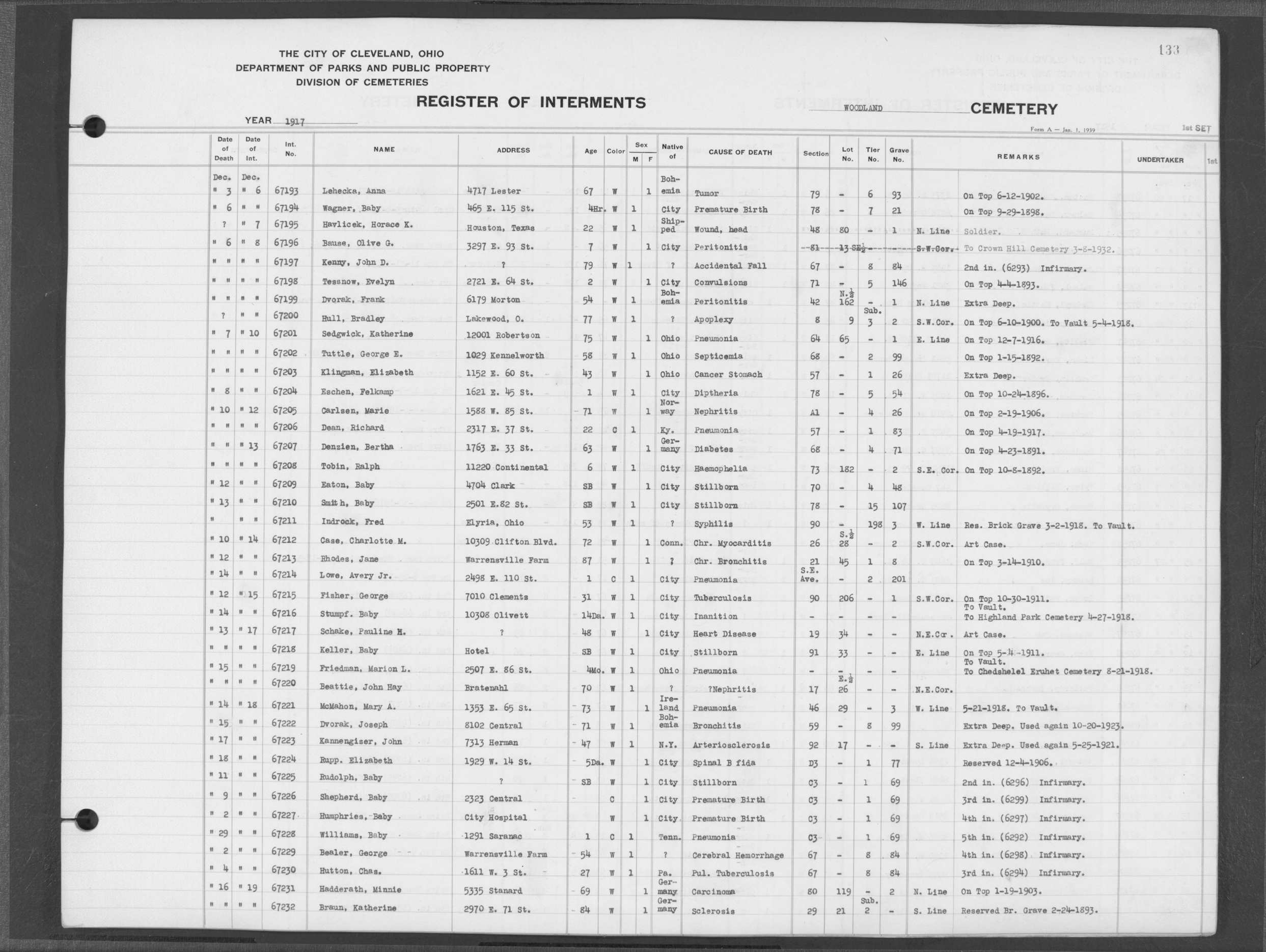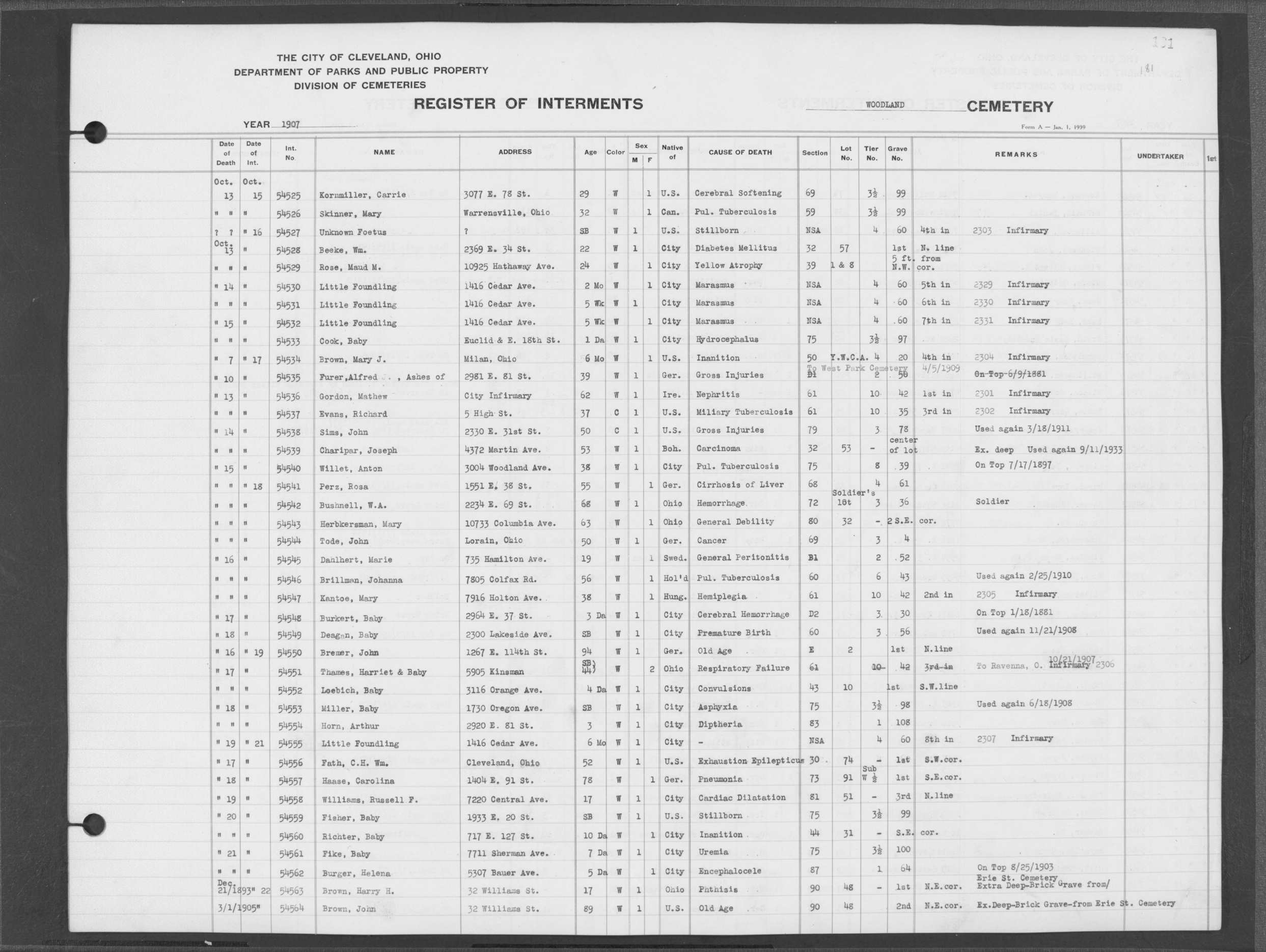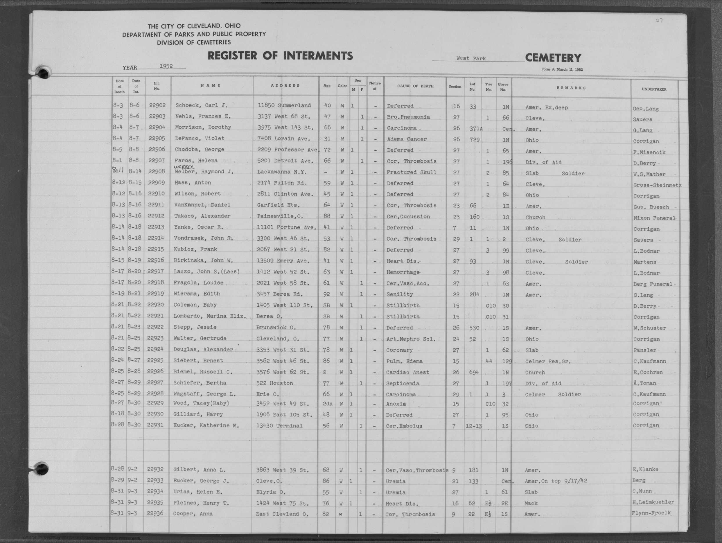 | West Park | 1 | 151 | Oct | 9 | 1917 | 4967 | Derrer, Minnie | 57y | W | F | ||||
