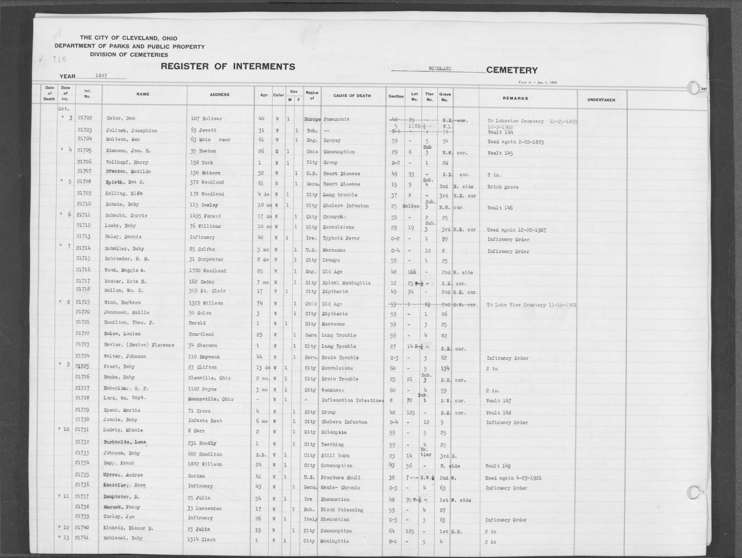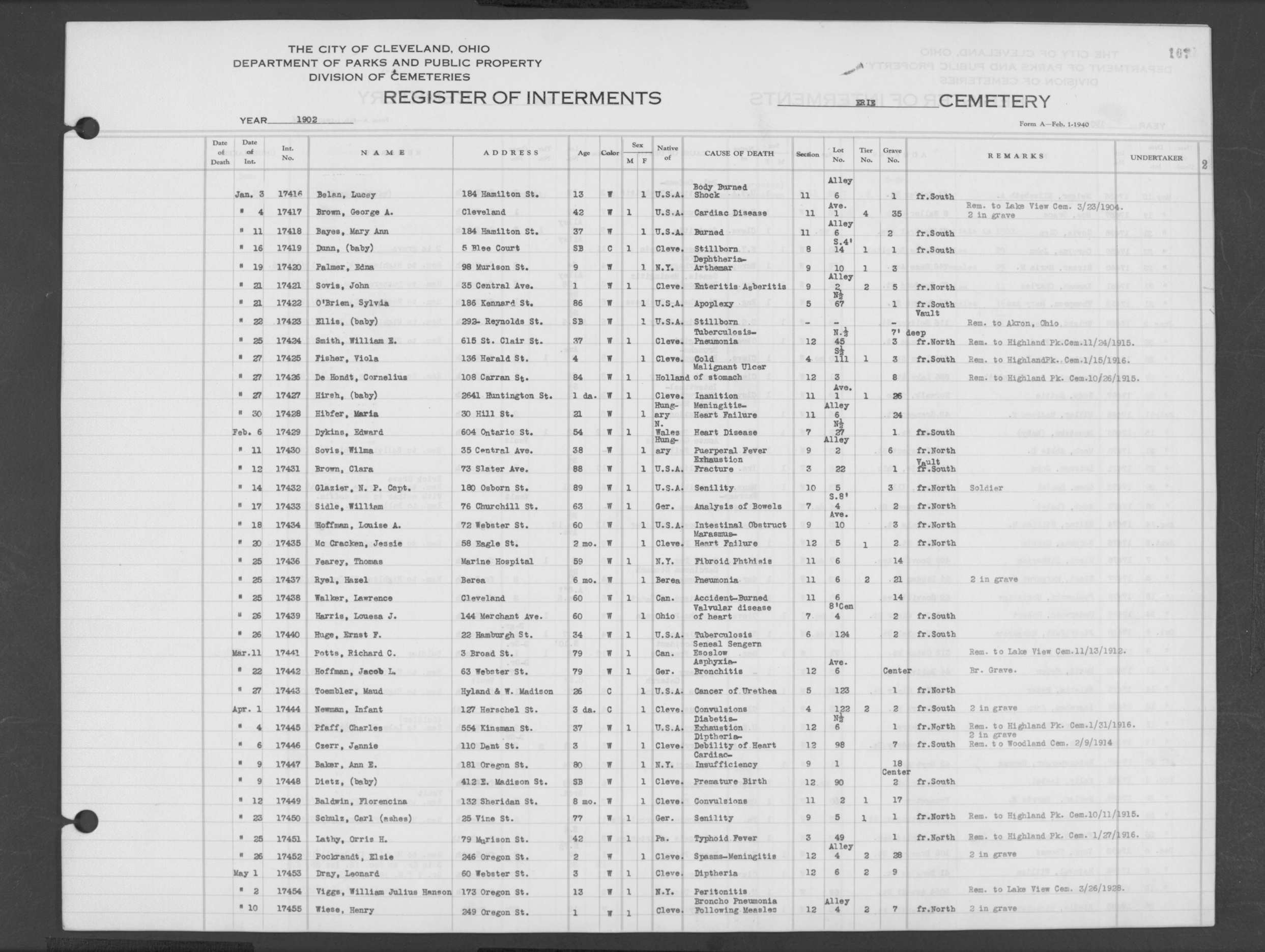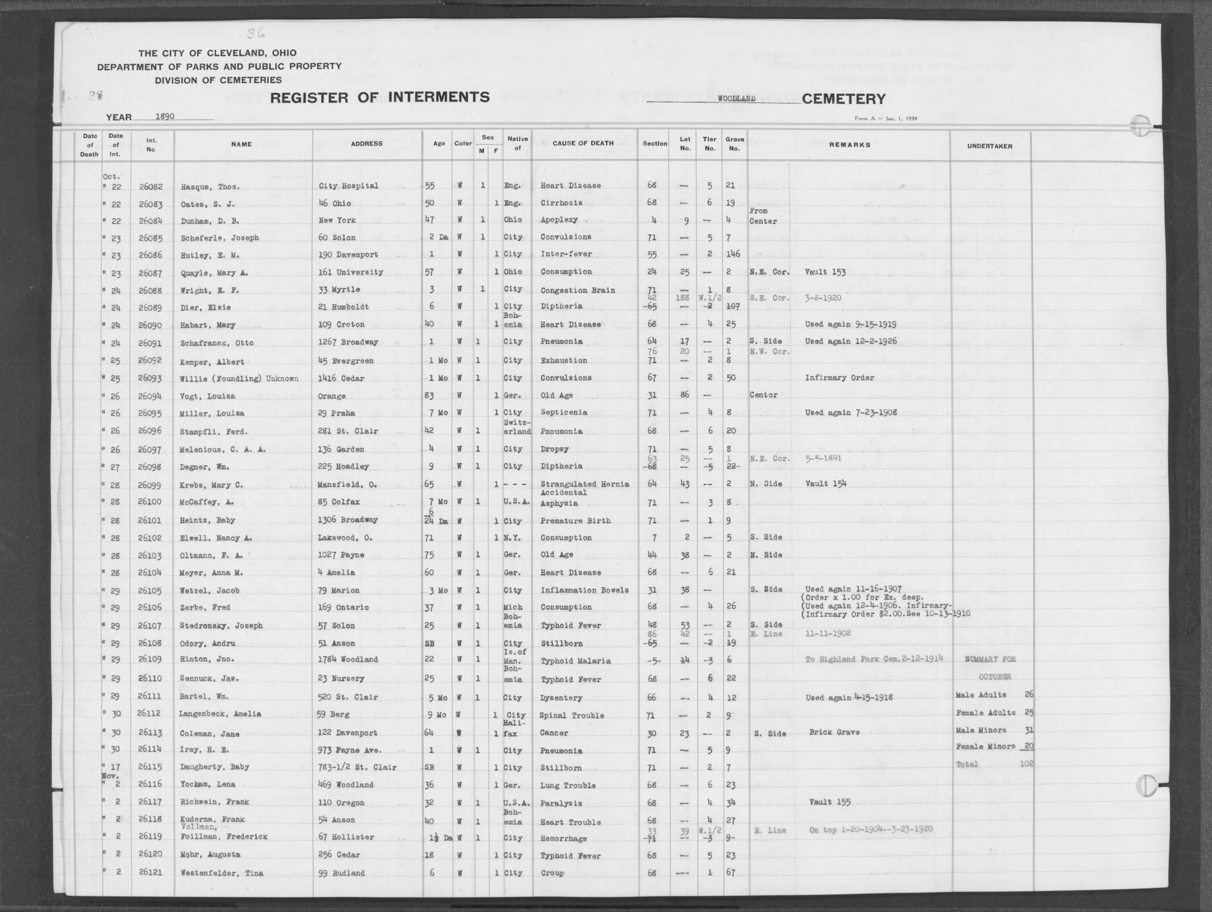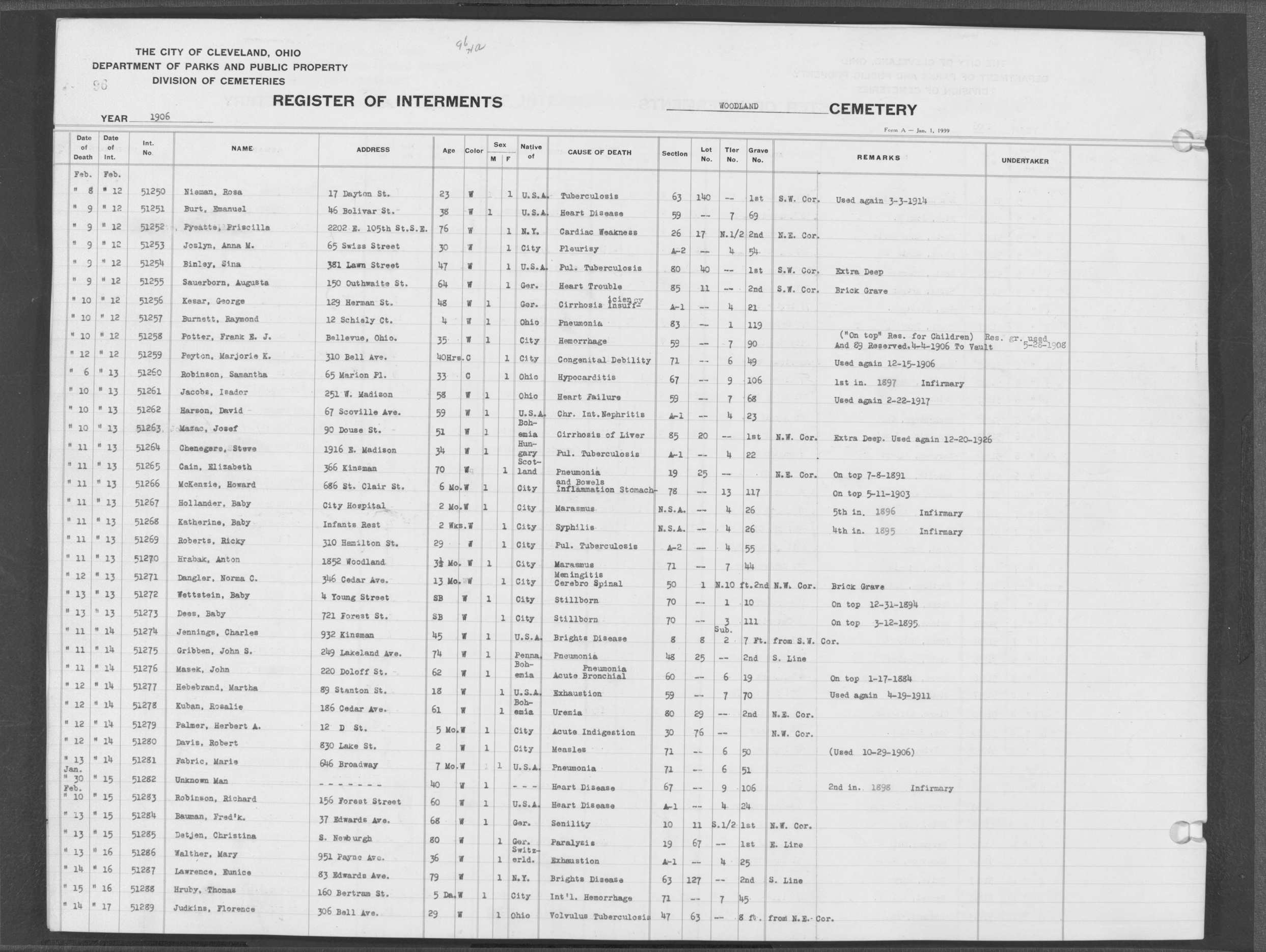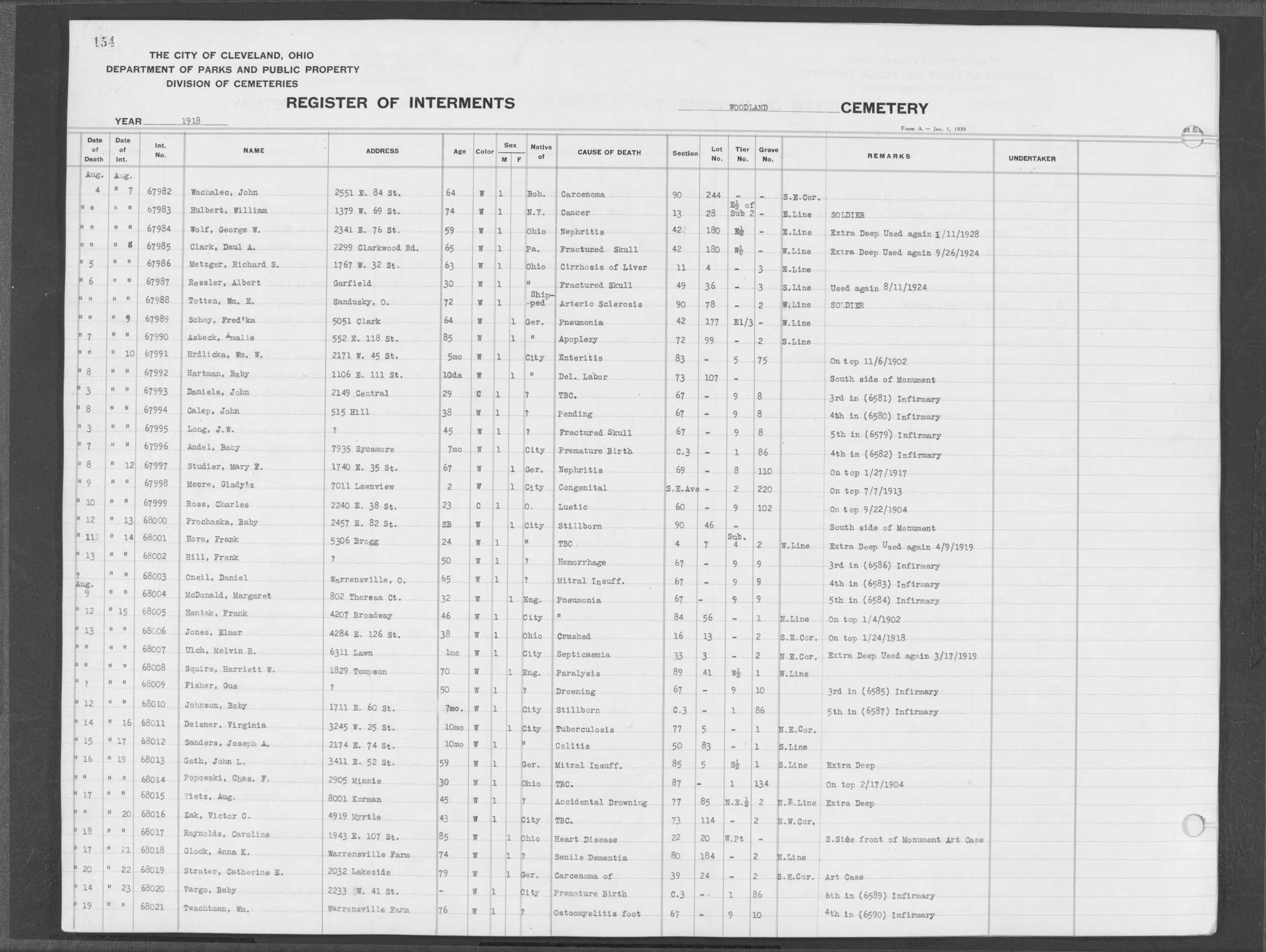 | West Park | 1 | 151 | Oct | 9 | 1917 | 4967 | Derrer, Minnie | 57y | W | F | ||||