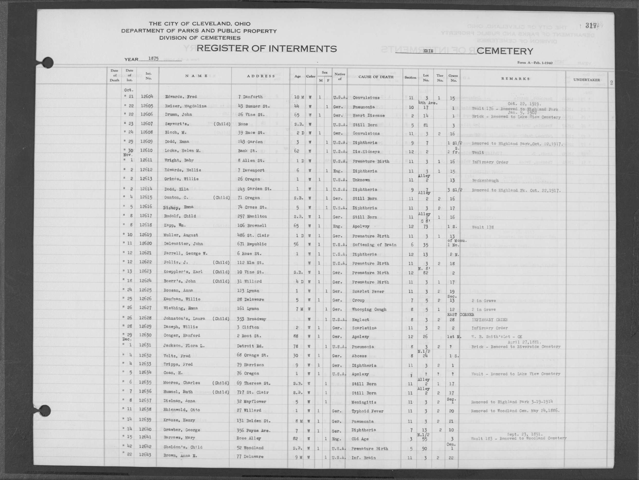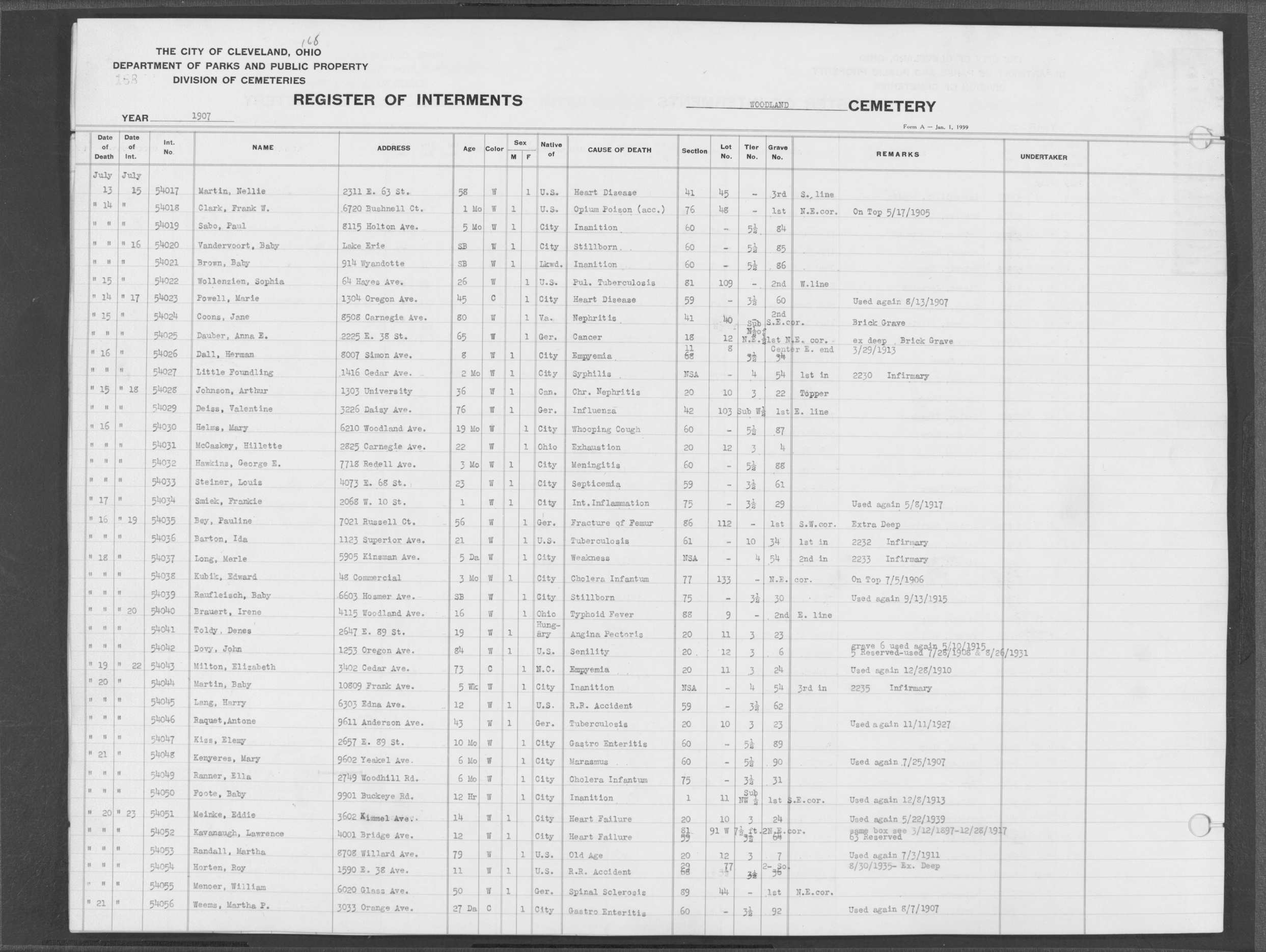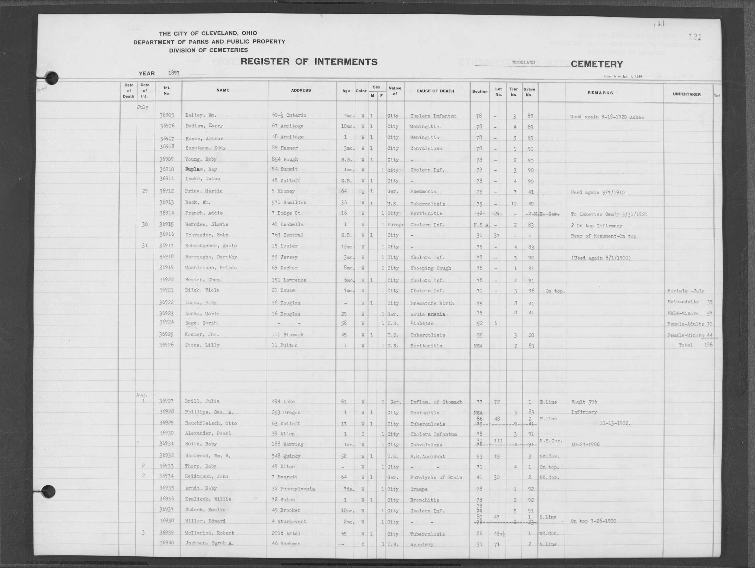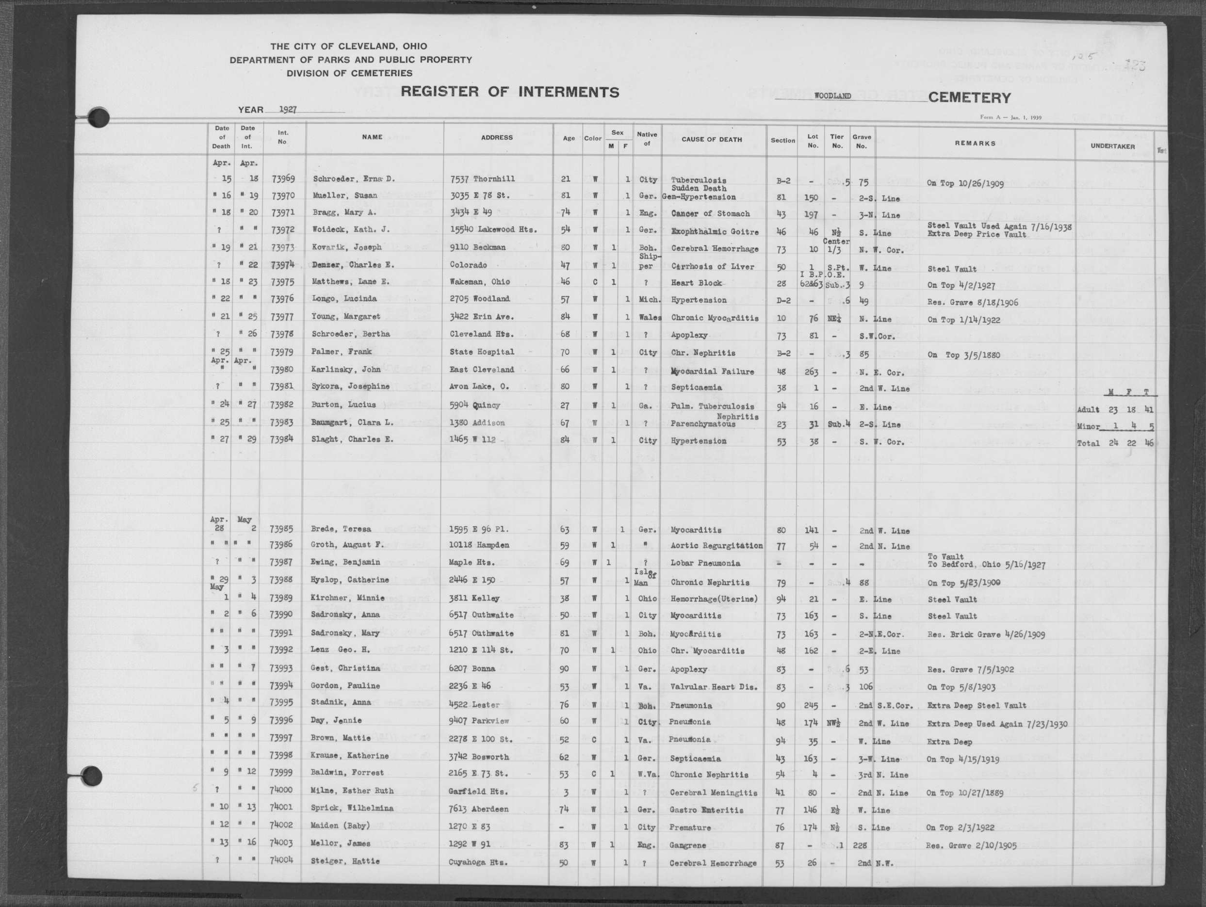 | West Park | 1 | 151 | Oct | 9 | 1917 | 4967 | Derrer, Minnie | 57y | W | F | ||||