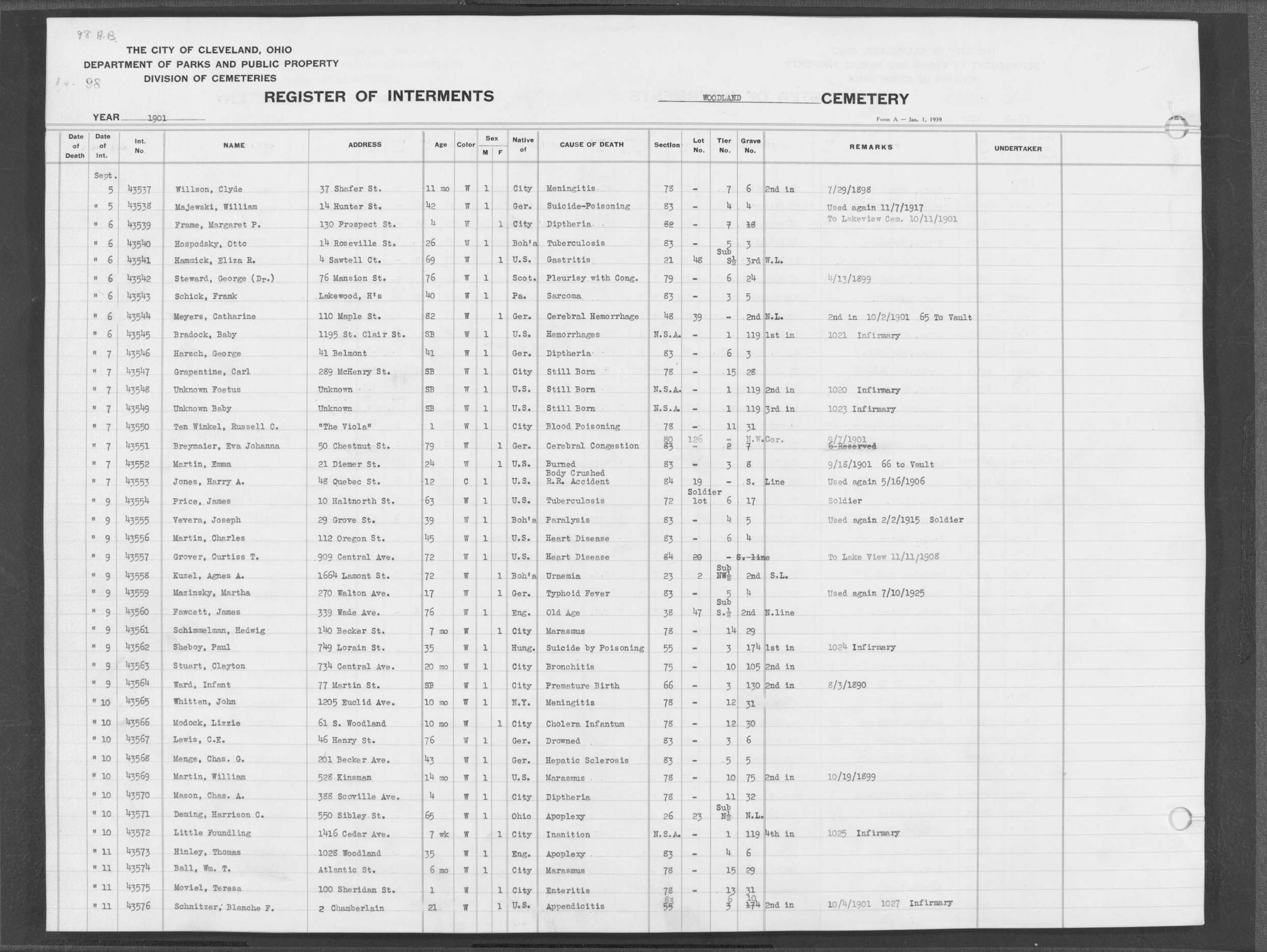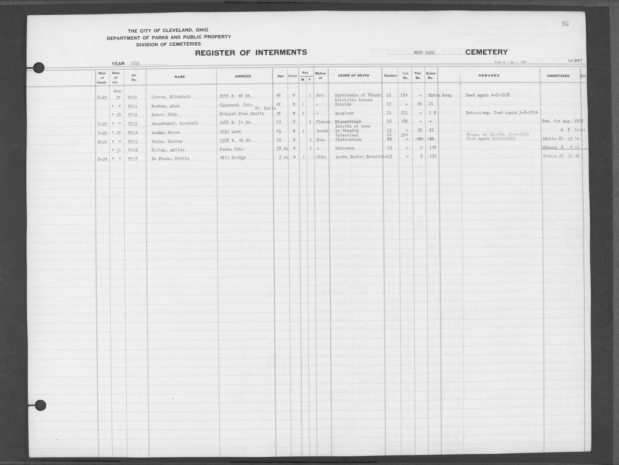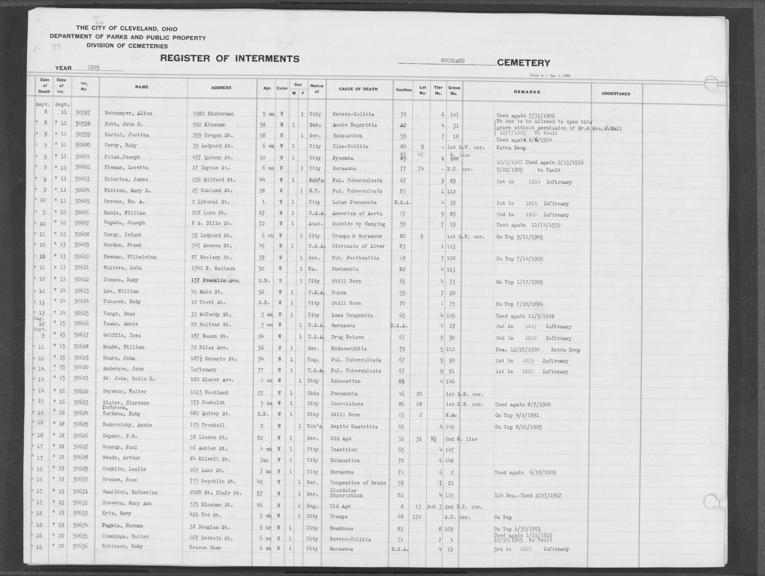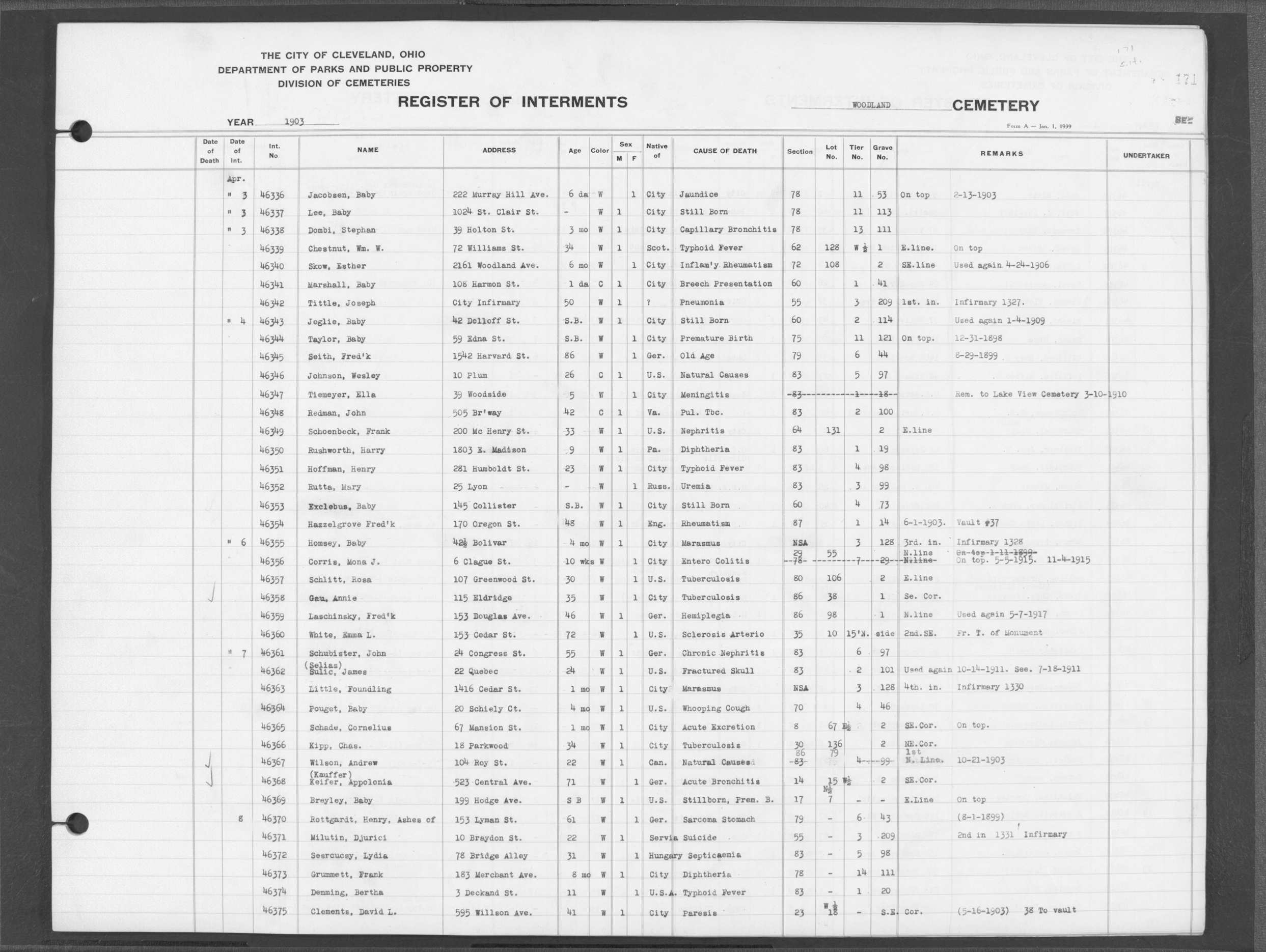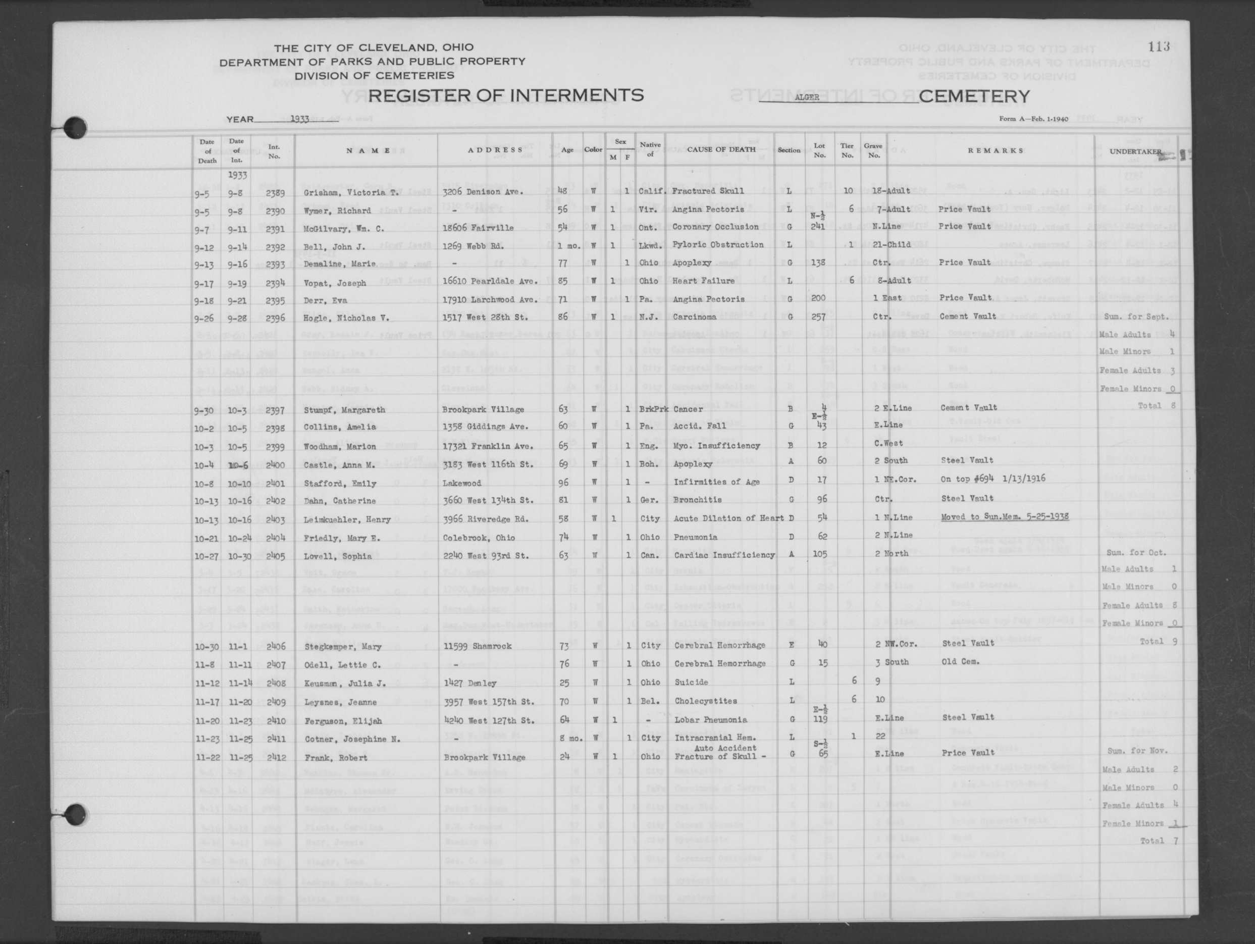 | West Park | 1 | 151 | Oct | 9 | 1917 | 4967 | Derrer, Minnie | 57y | W | F | ||||