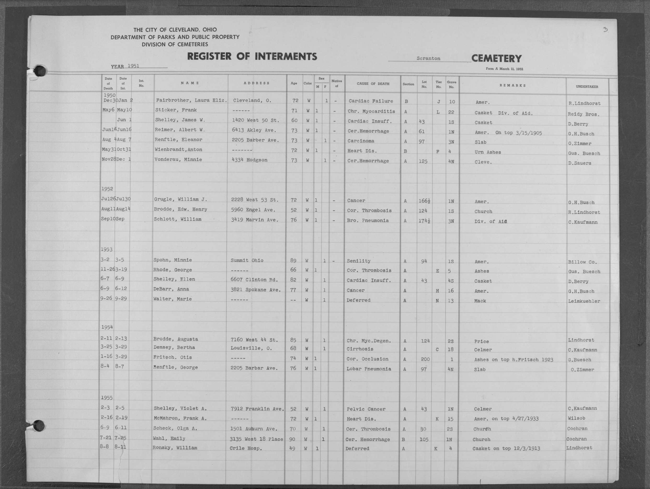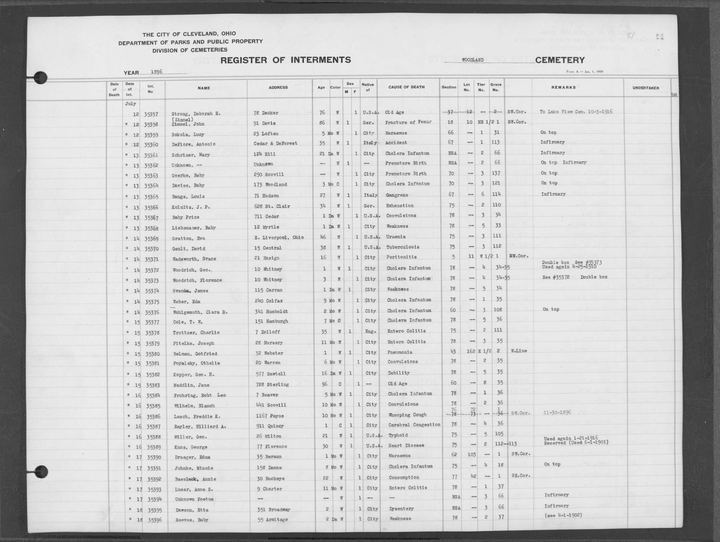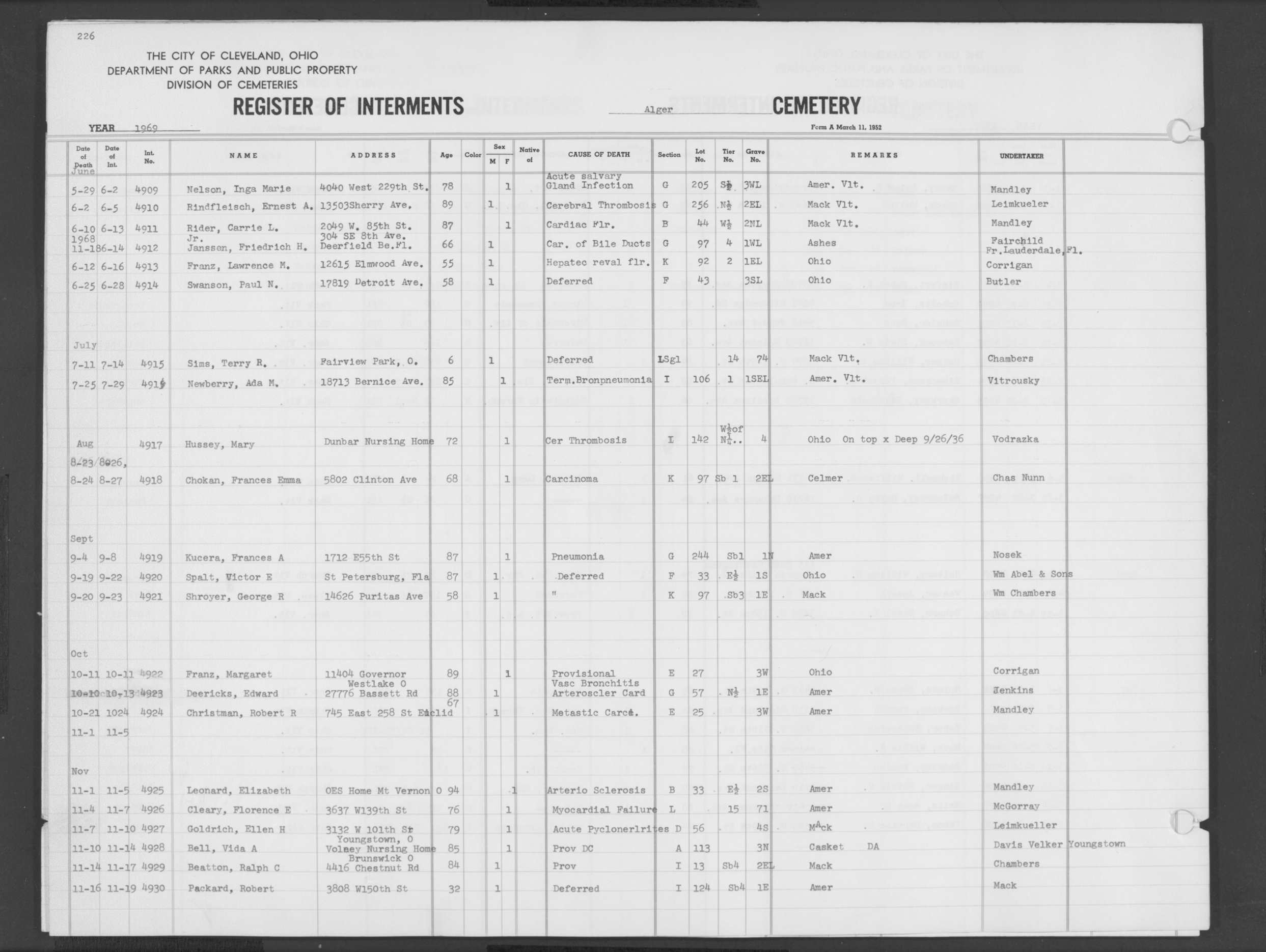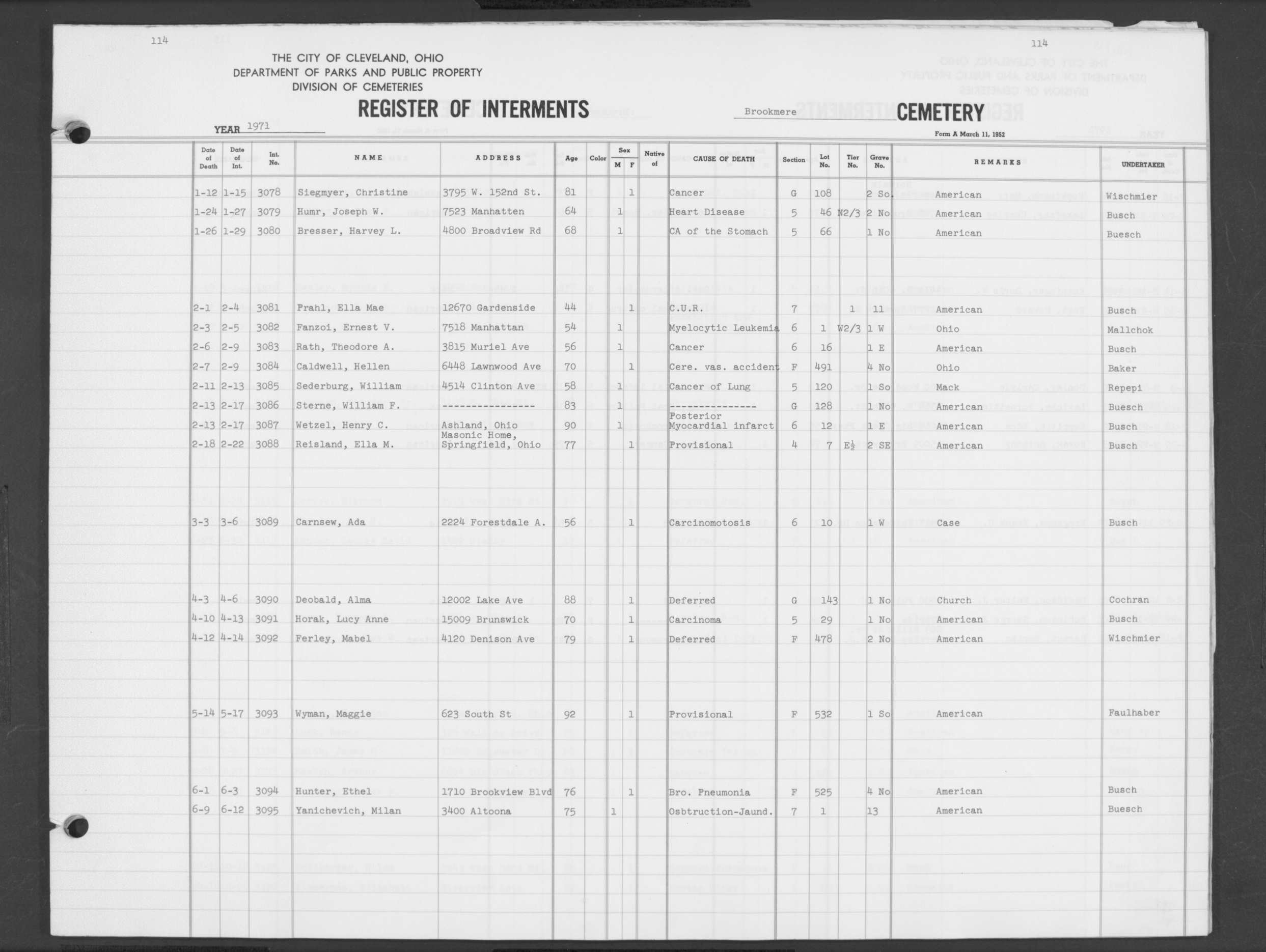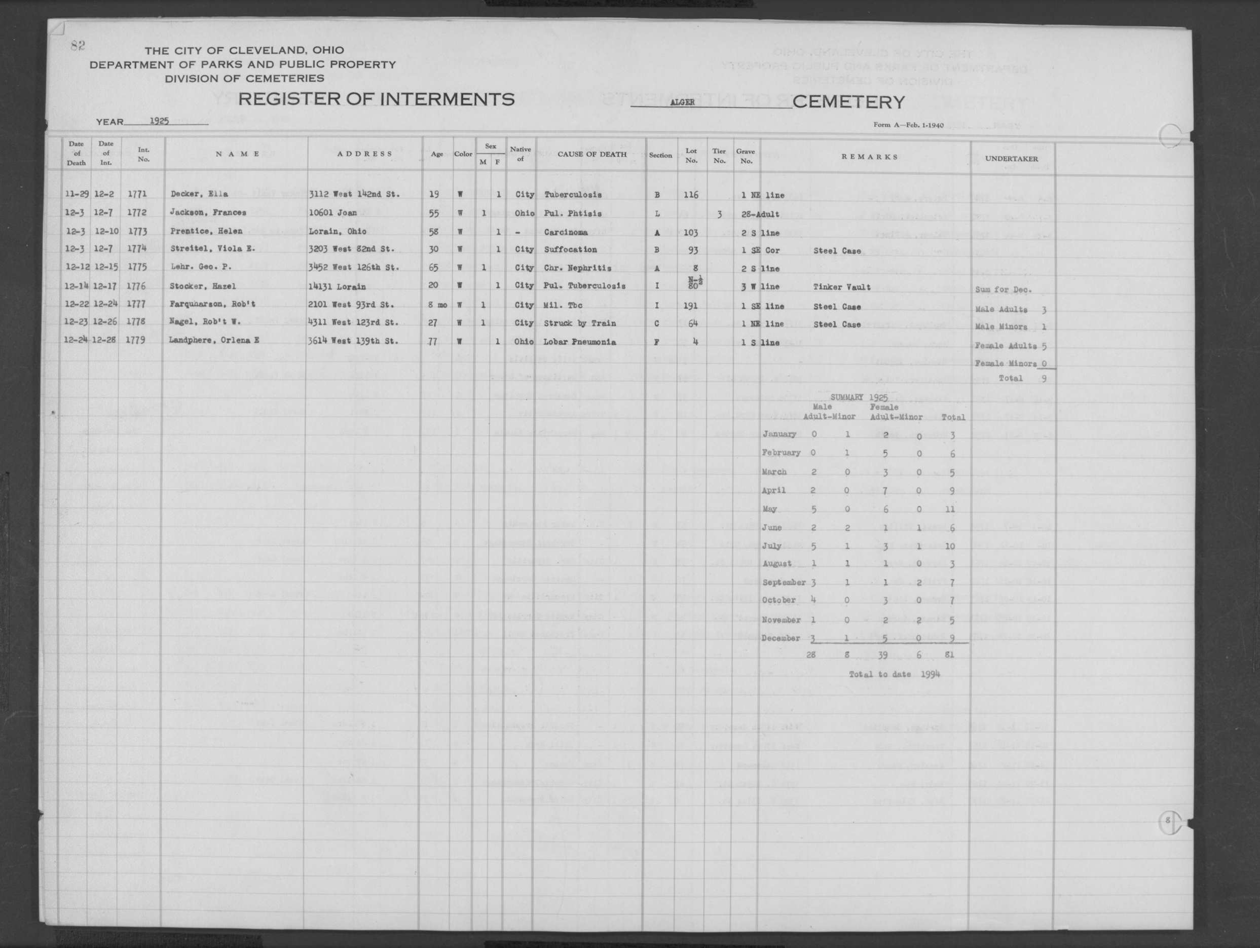 | West Park | 1 | 151 | Oct | 9 | 1917 | 4967 | Derrer, Minnie | 57y | W | F | ||||