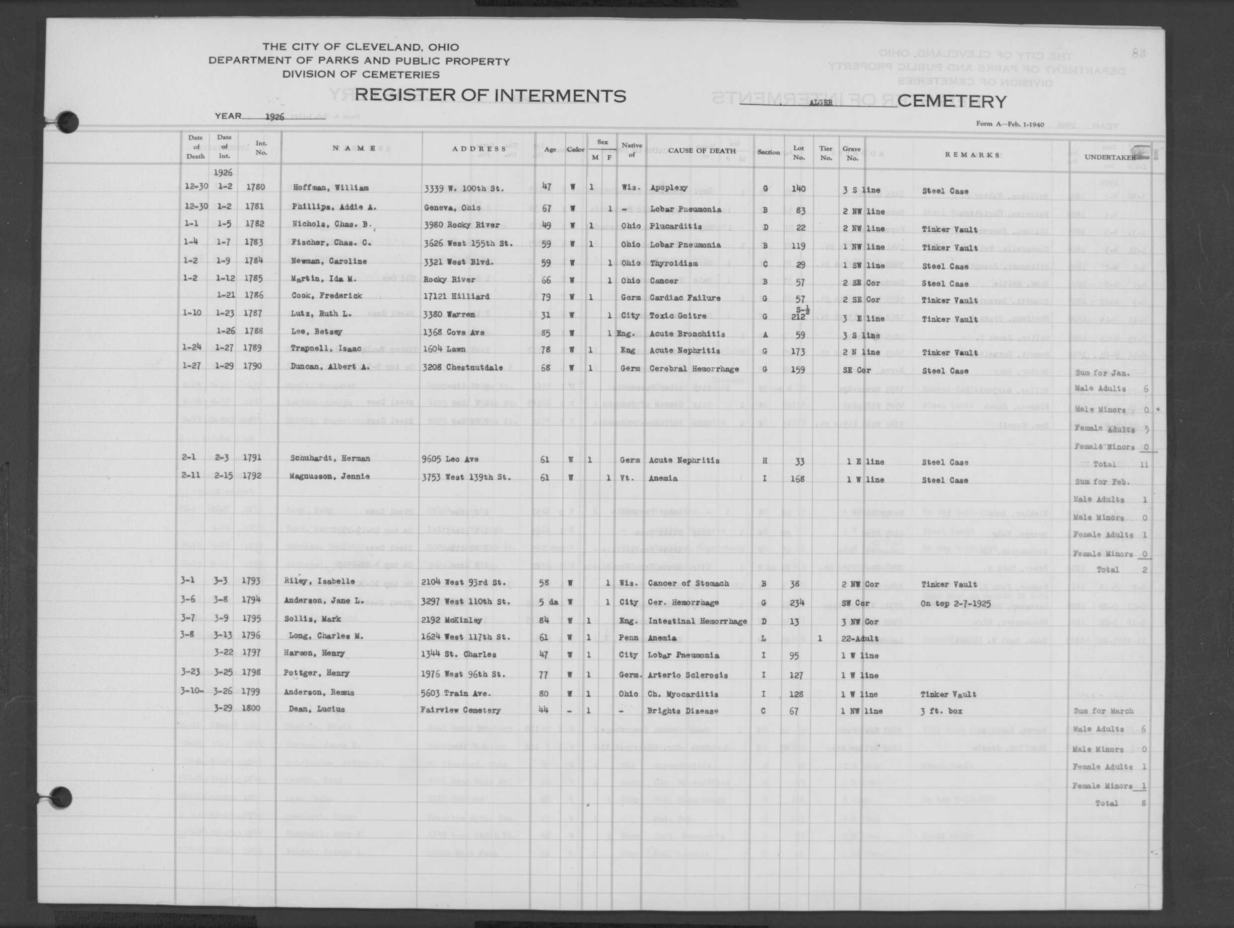 | Alger | 1 | 37 | Mar | 28 | 1916 | 722 | Deam, Anna Alvina | 73y | W | F | ||||