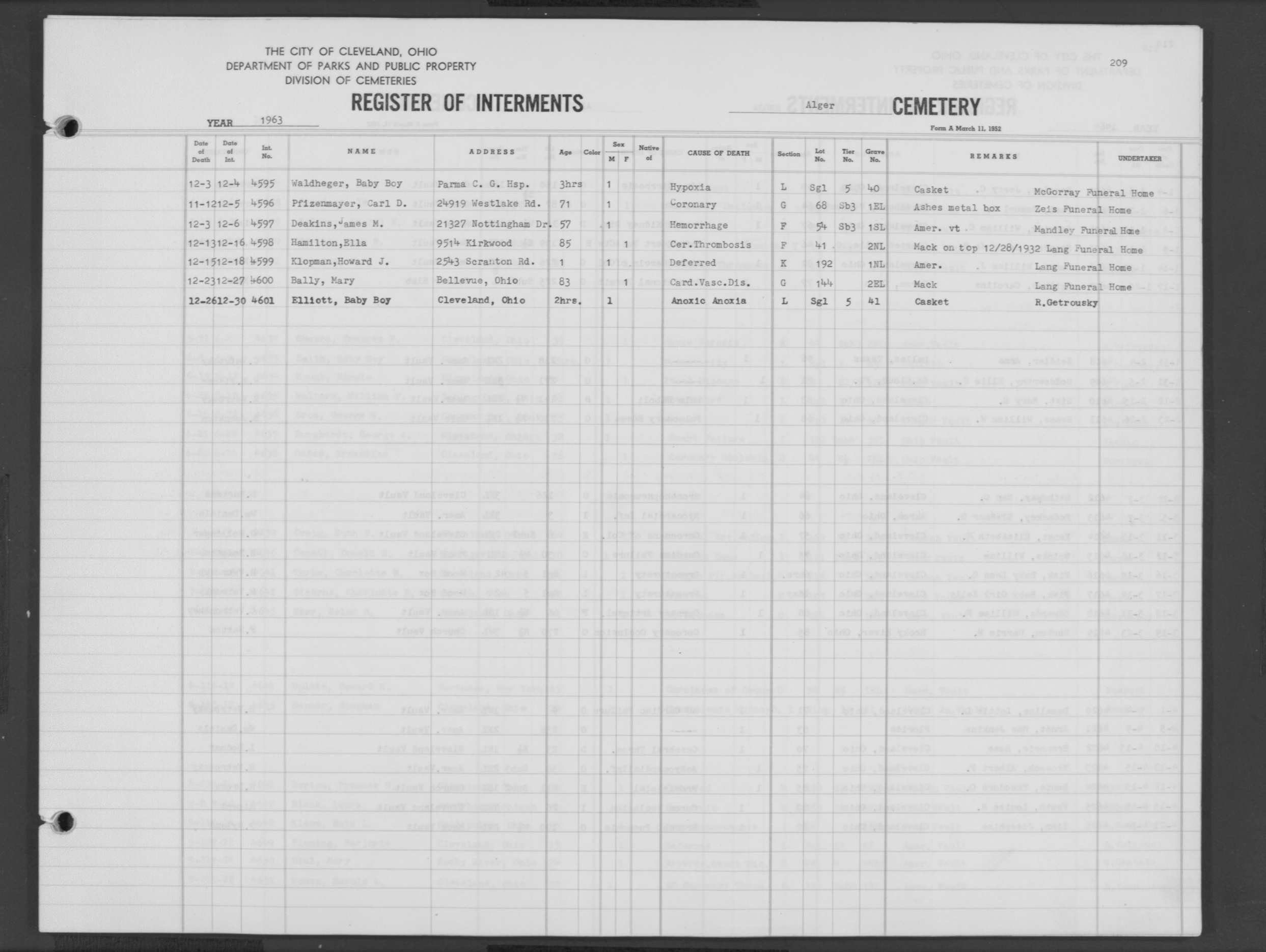 | Alger | 1 | 209 | Dec | 3 | 1963 | Dec | 6 | 1963 | 4597 | Deakins, James M | 57y | M | ||