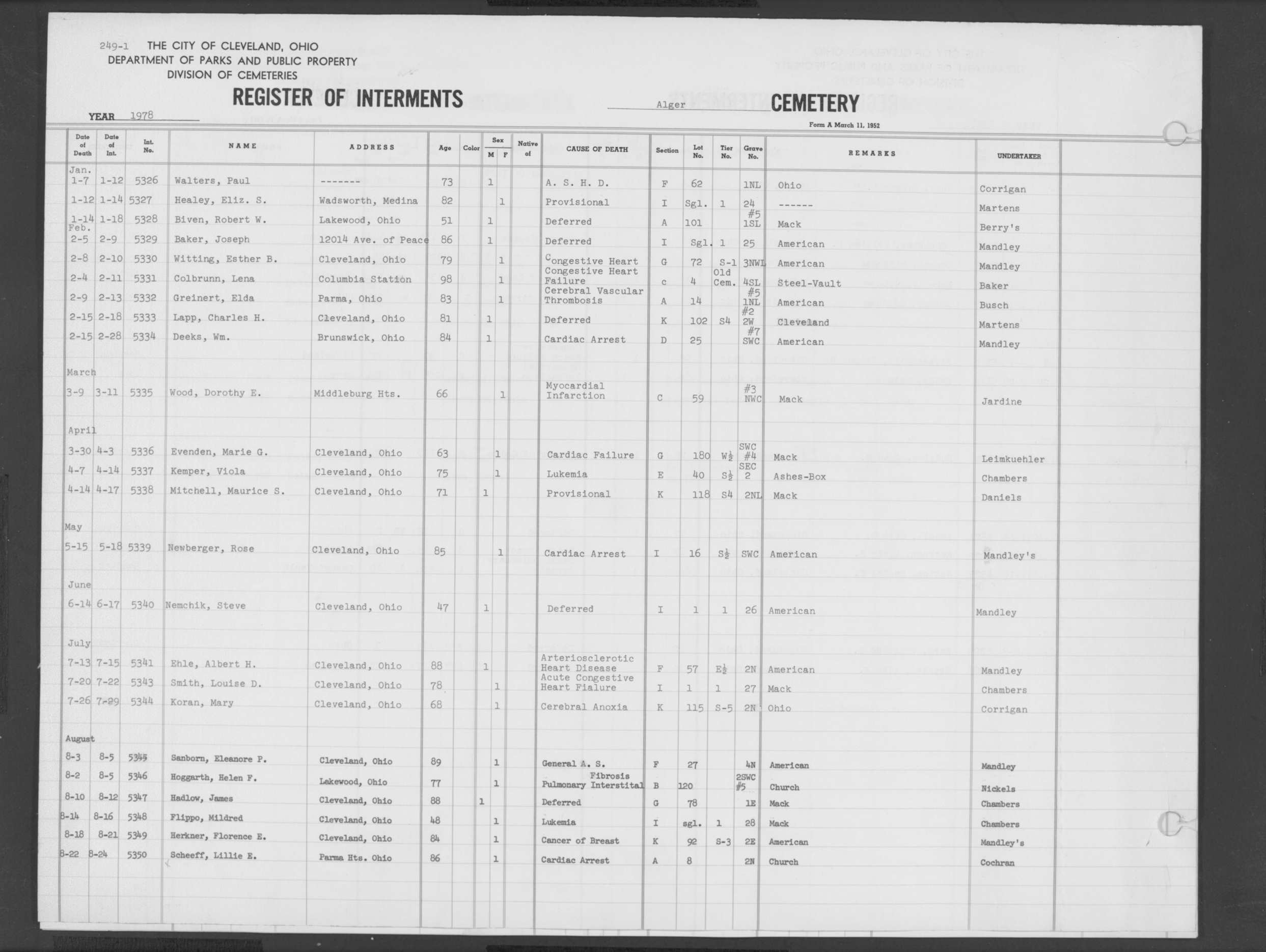 | Highland Park | 8 | 215 | Mar | 6 | 1976 | Mar | 9 | 1976 | 84335 | Deak, Mary | 86y | F | ||