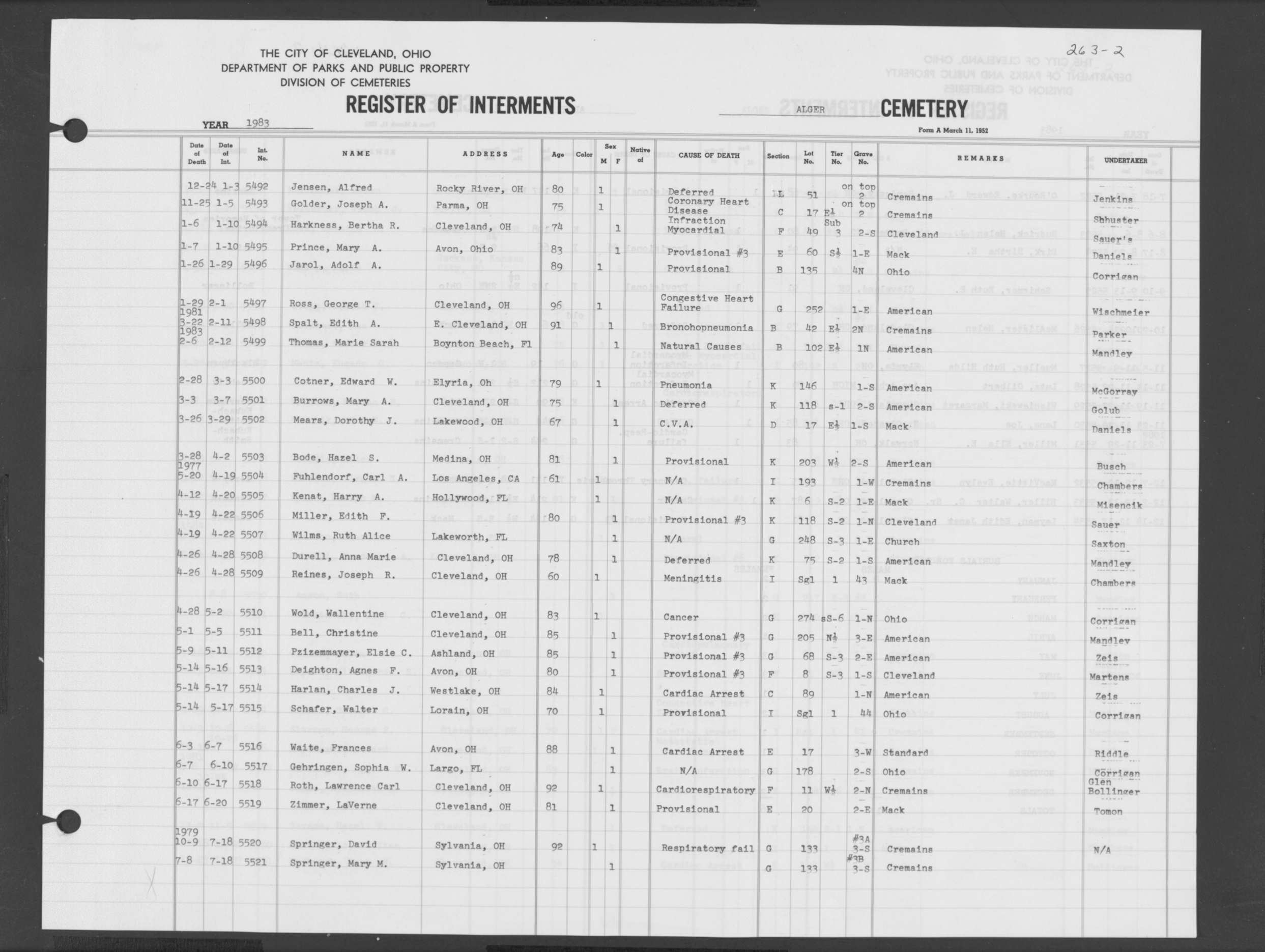 | Highland Park | 9 | 398 | Apr | 14 | 1985 | Apr | 17 | 1985 | 105105 | Deak, Mary | 82y | F | ||