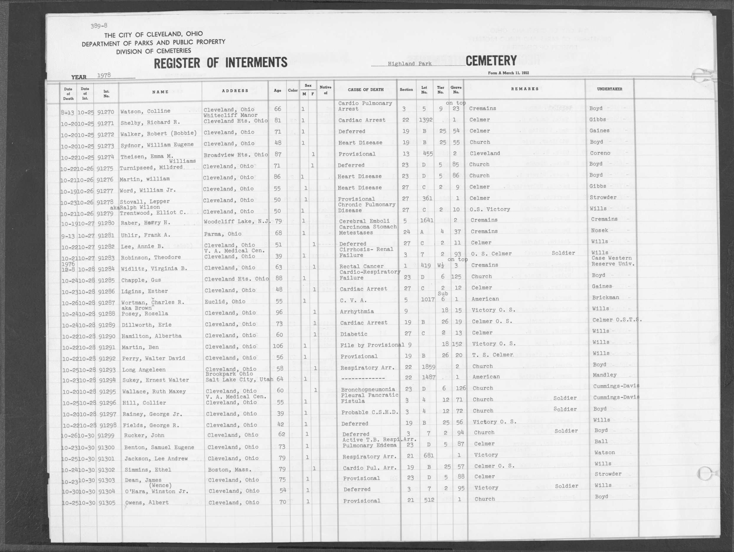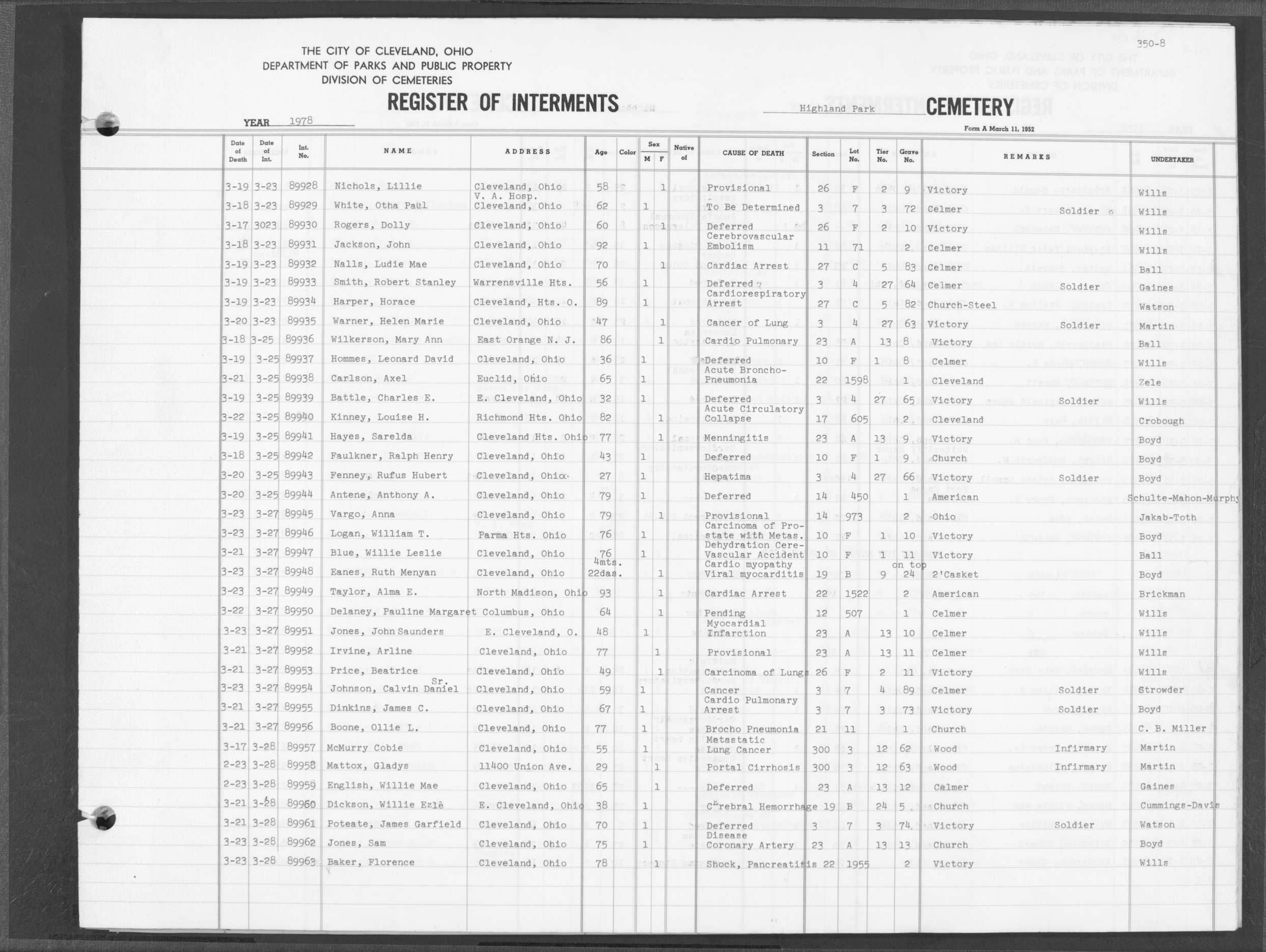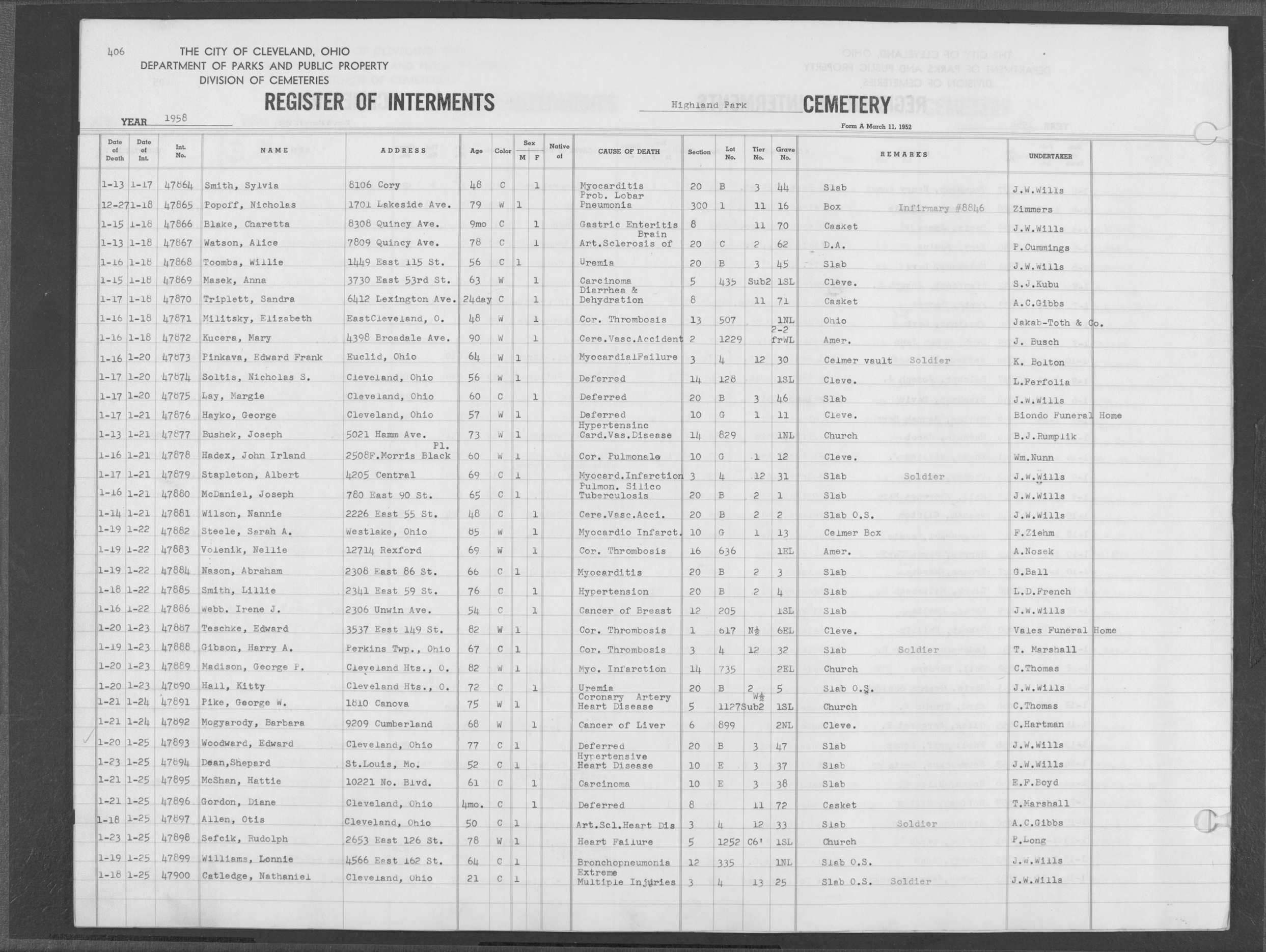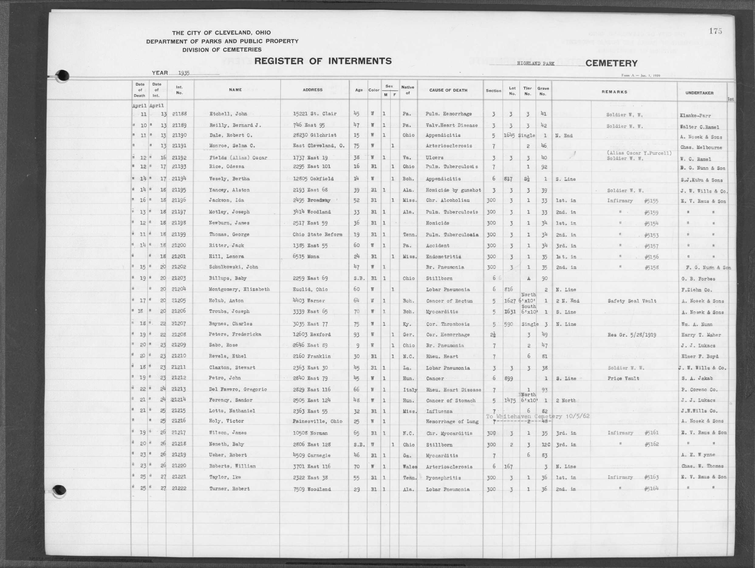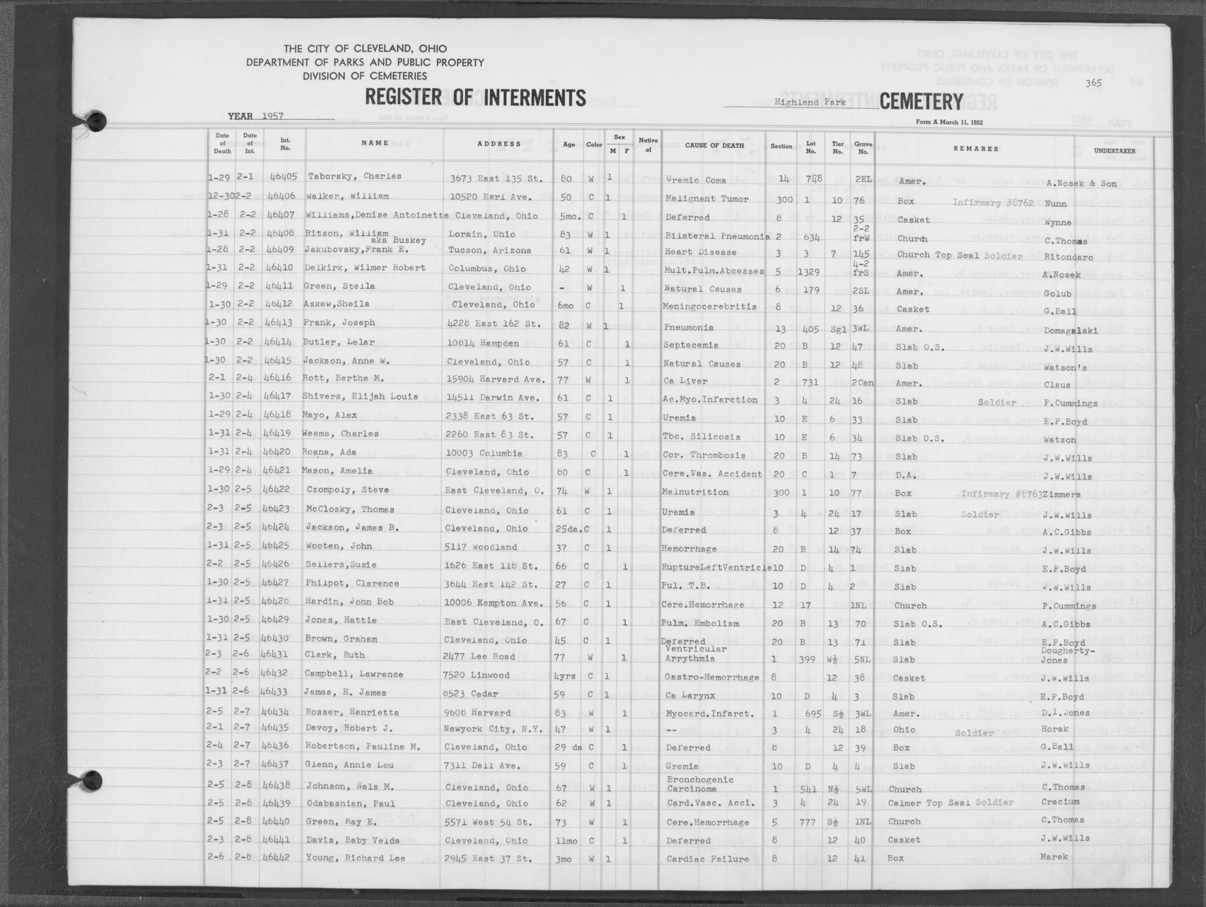 | Highland Park | 5 | 361 | Dec | 30 | 1956 | Jan | 5 | 1957 | 46277 | Deadwyler, Will H | 59y | C | M | |
