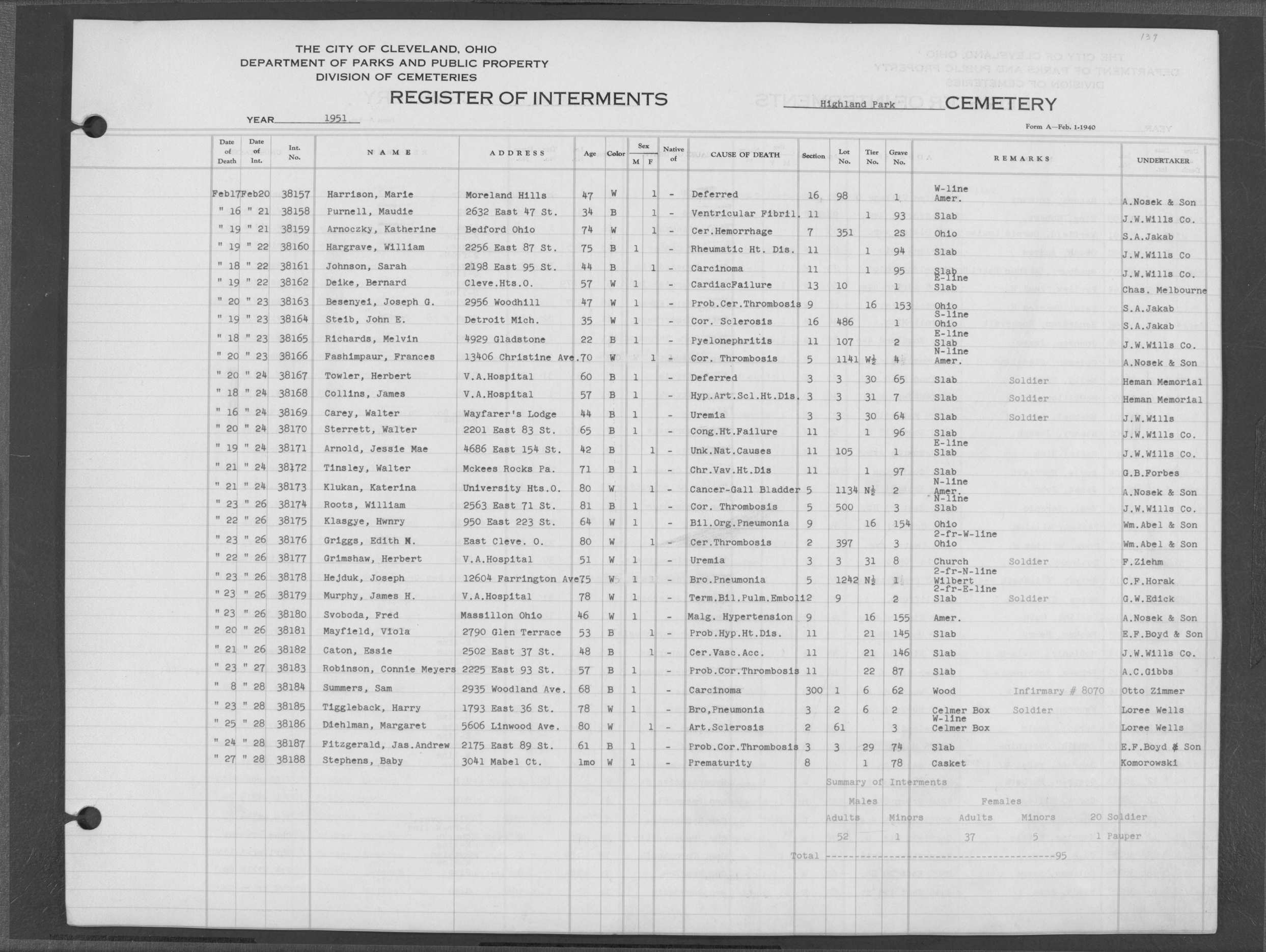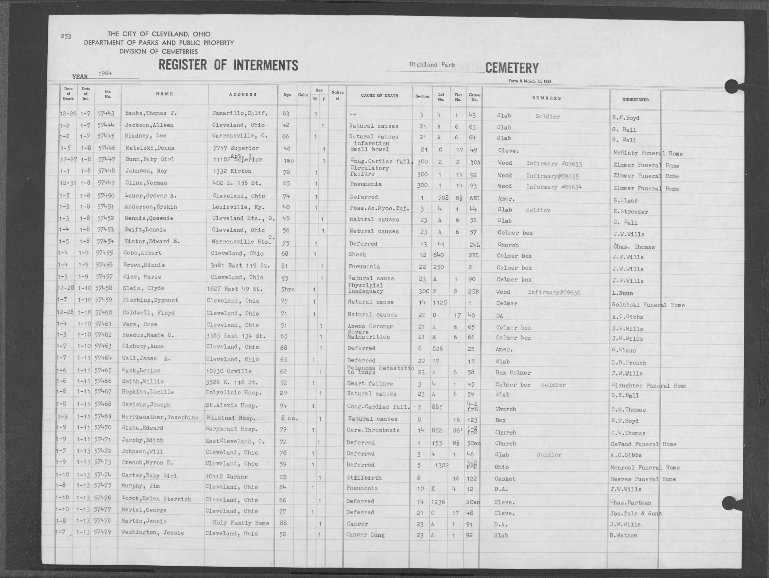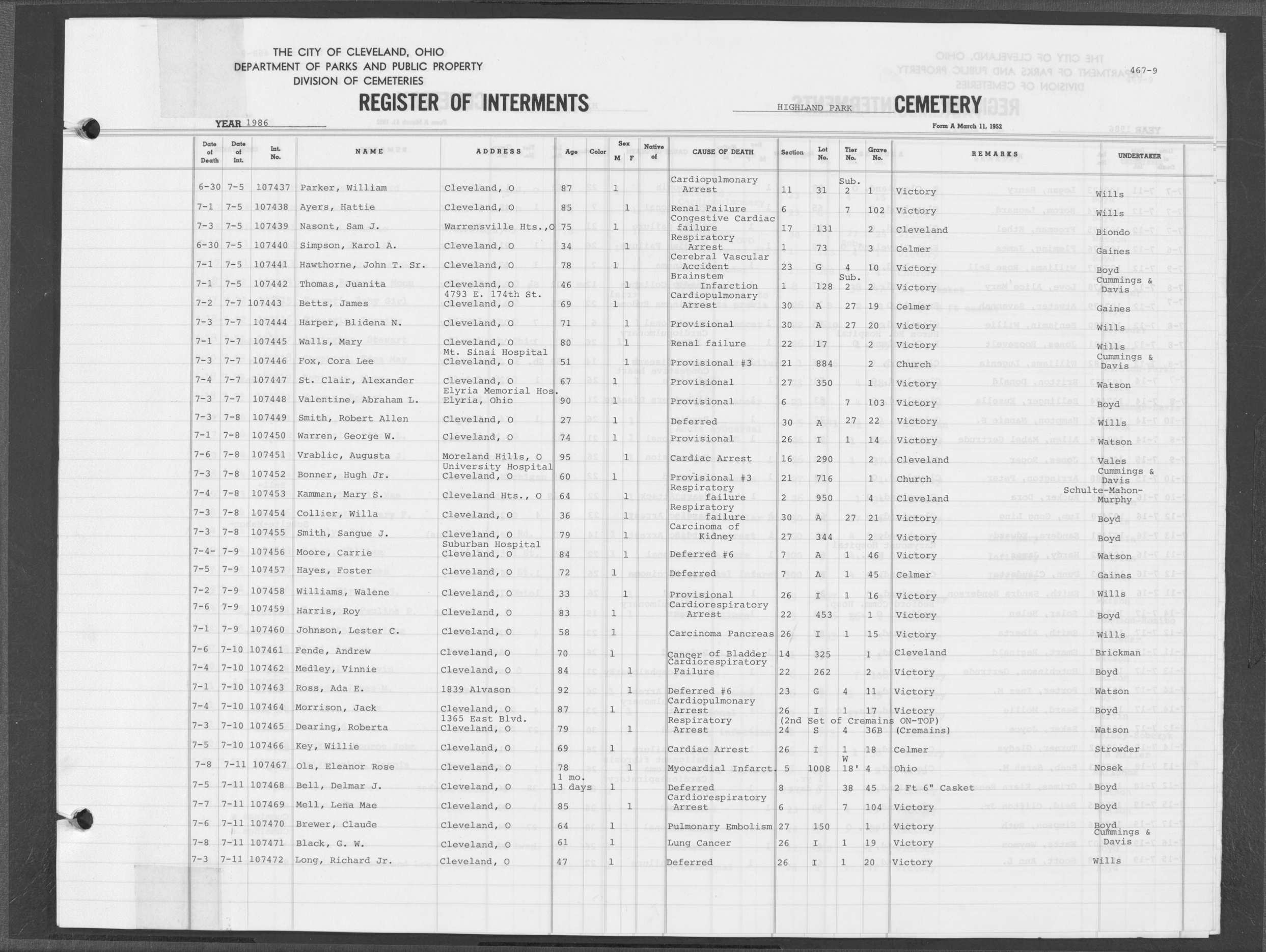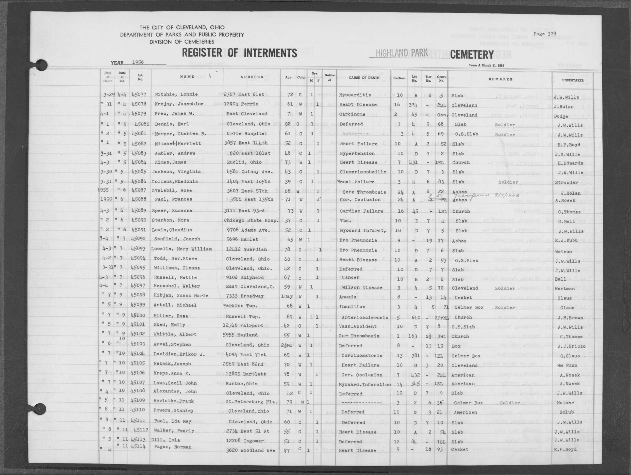 | Highland Park | 5 | 361 | Dec | 30 | 1956 | Jan | 5 | 1957 | 46277 | Deadwyler, Will H | 59y | C | M | |