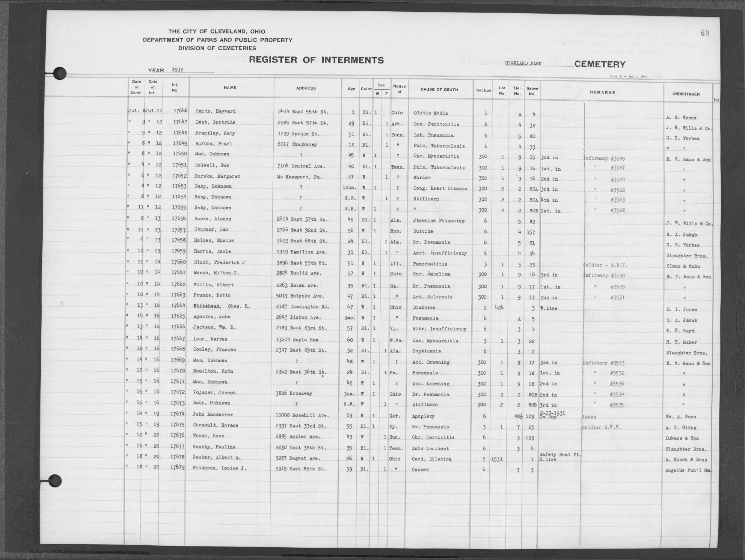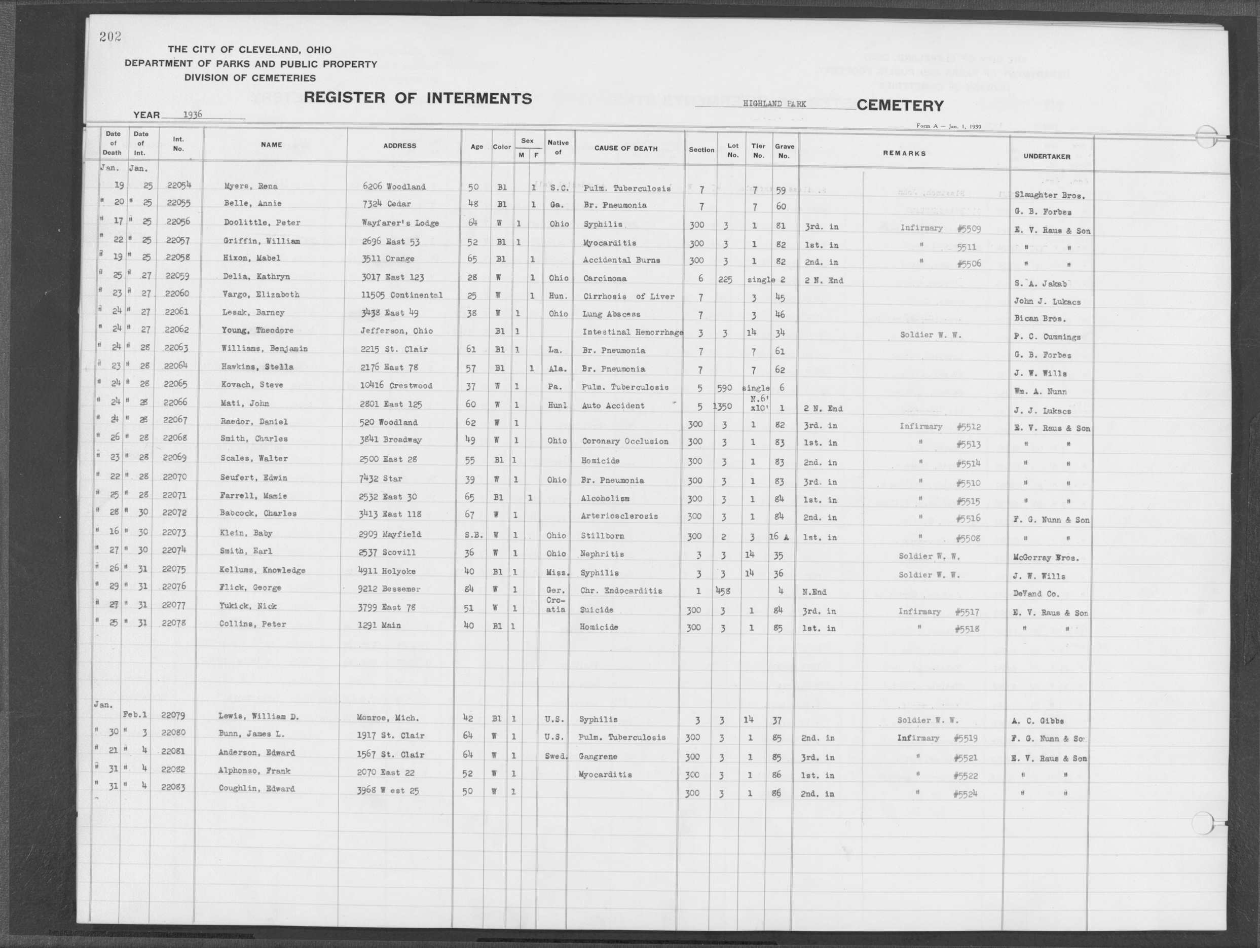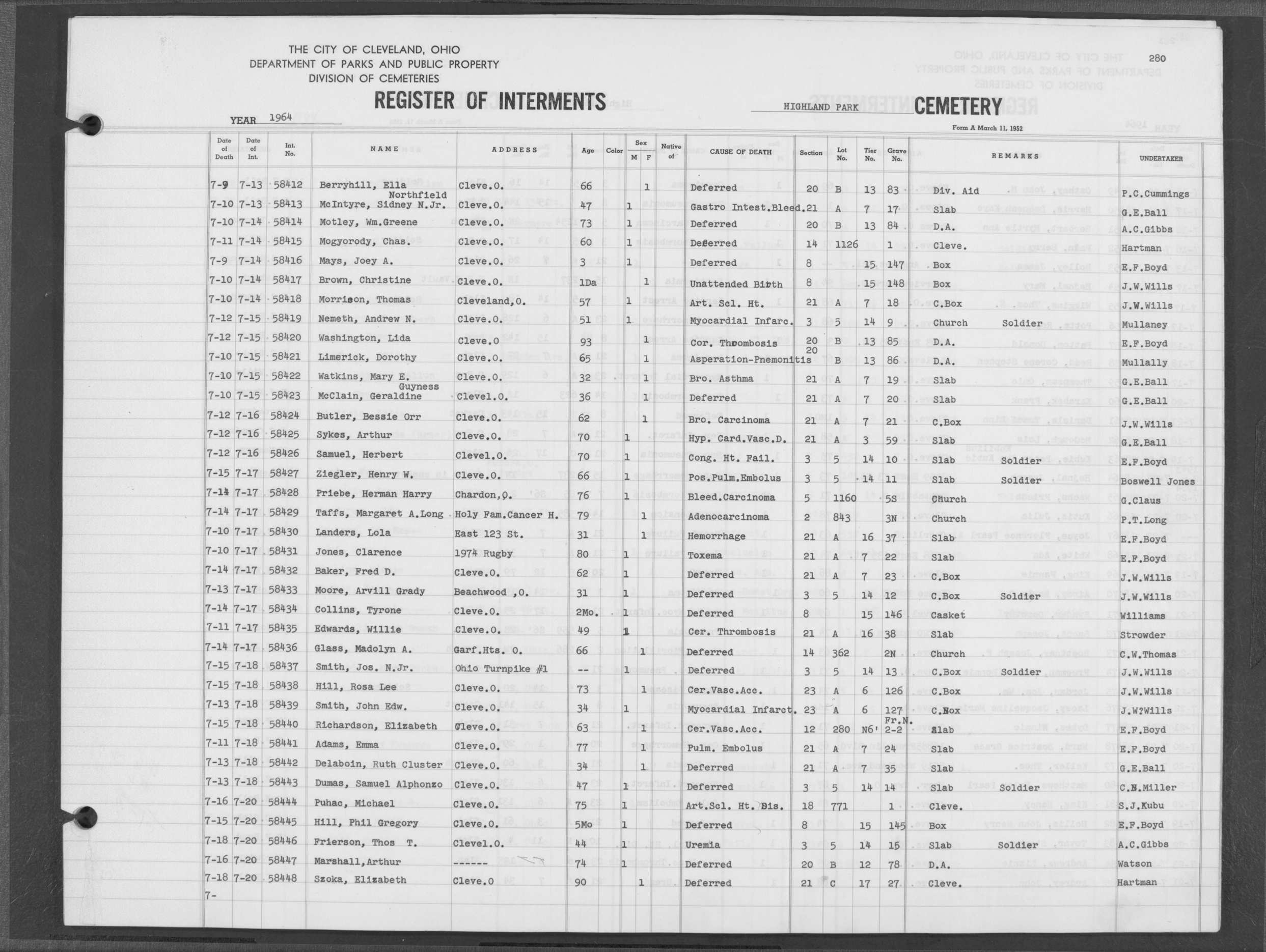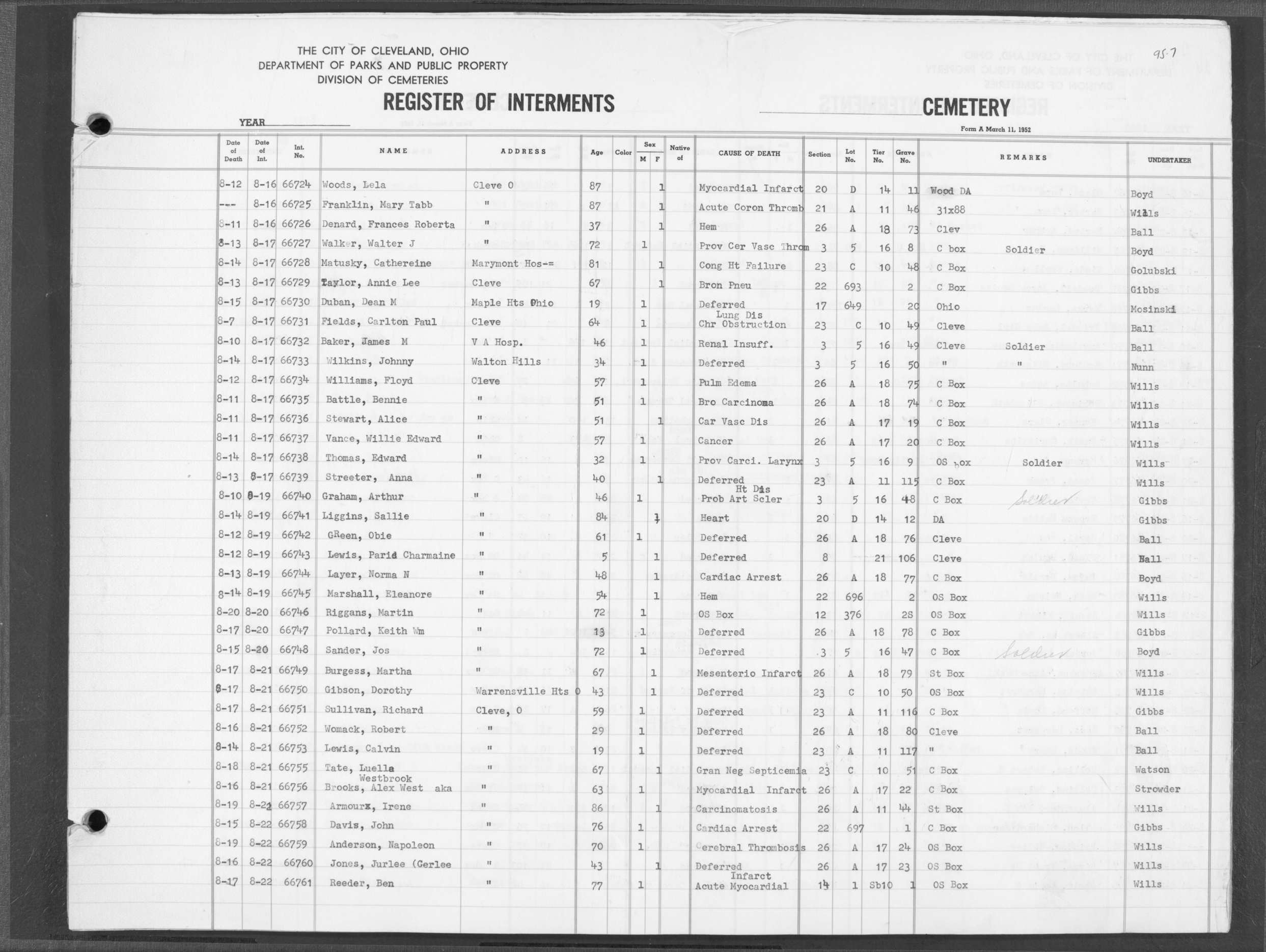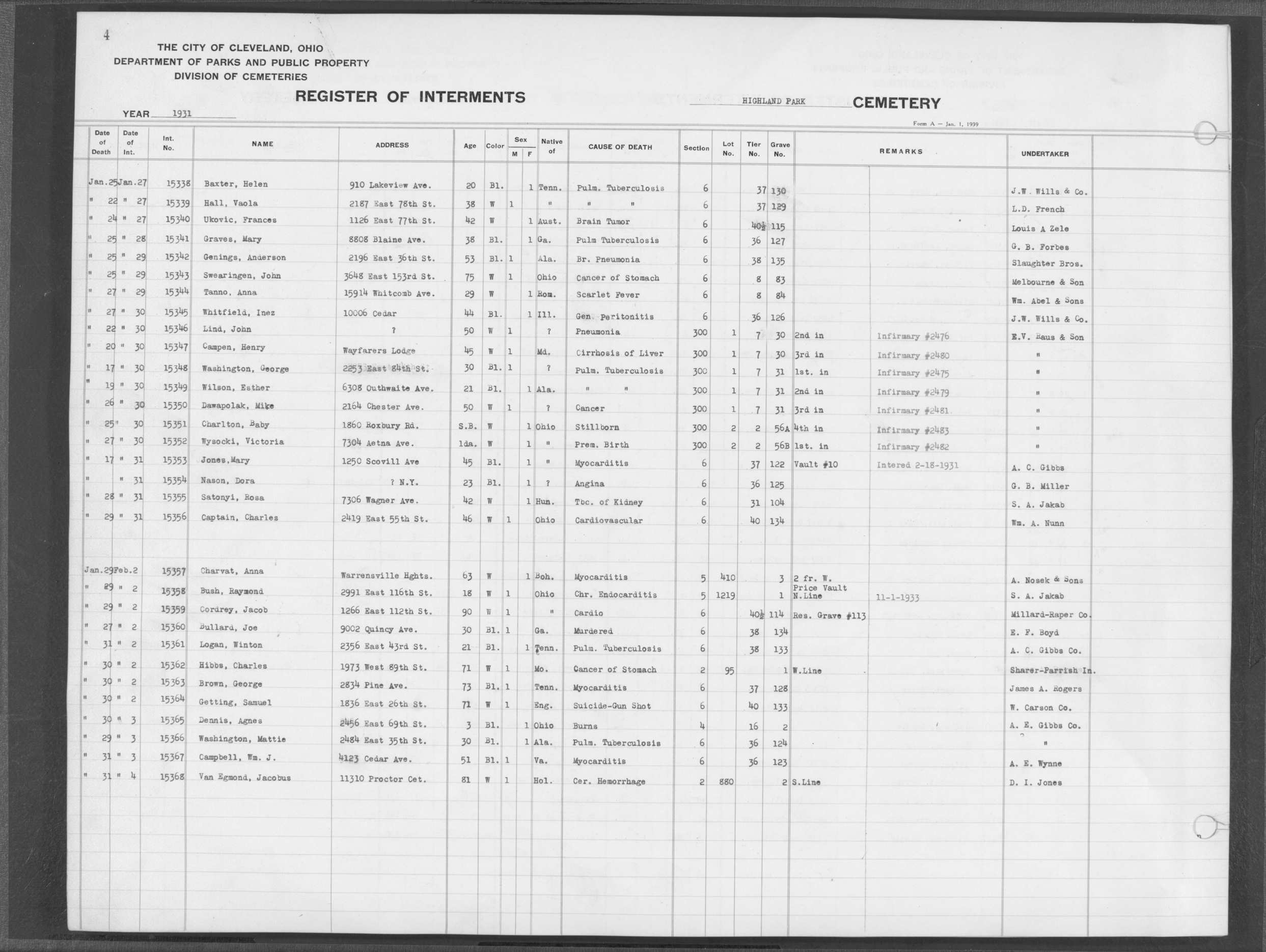 | Highland Park | 5 | 361 | Dec | 30 | 1956 | Jan | 5 | 1957 | 46277 | Deadwyler, Will H | 59y | C | M | |