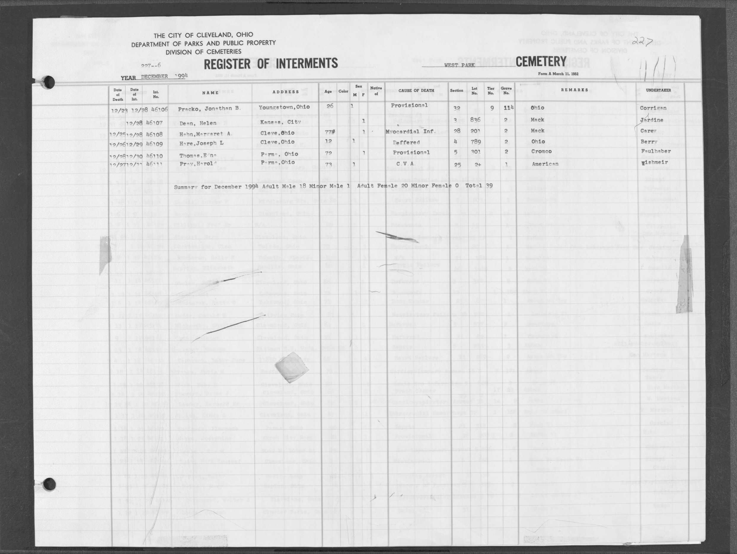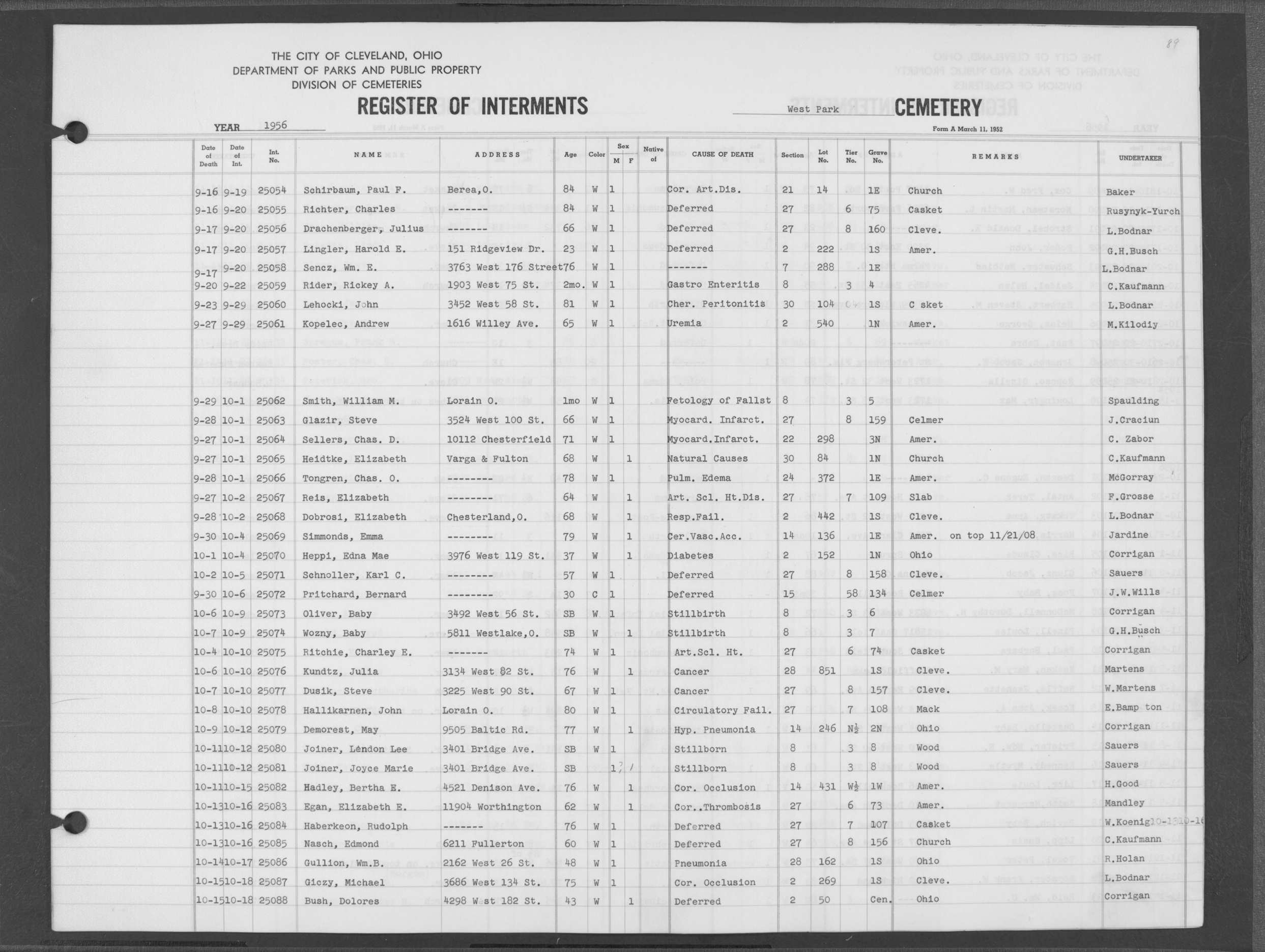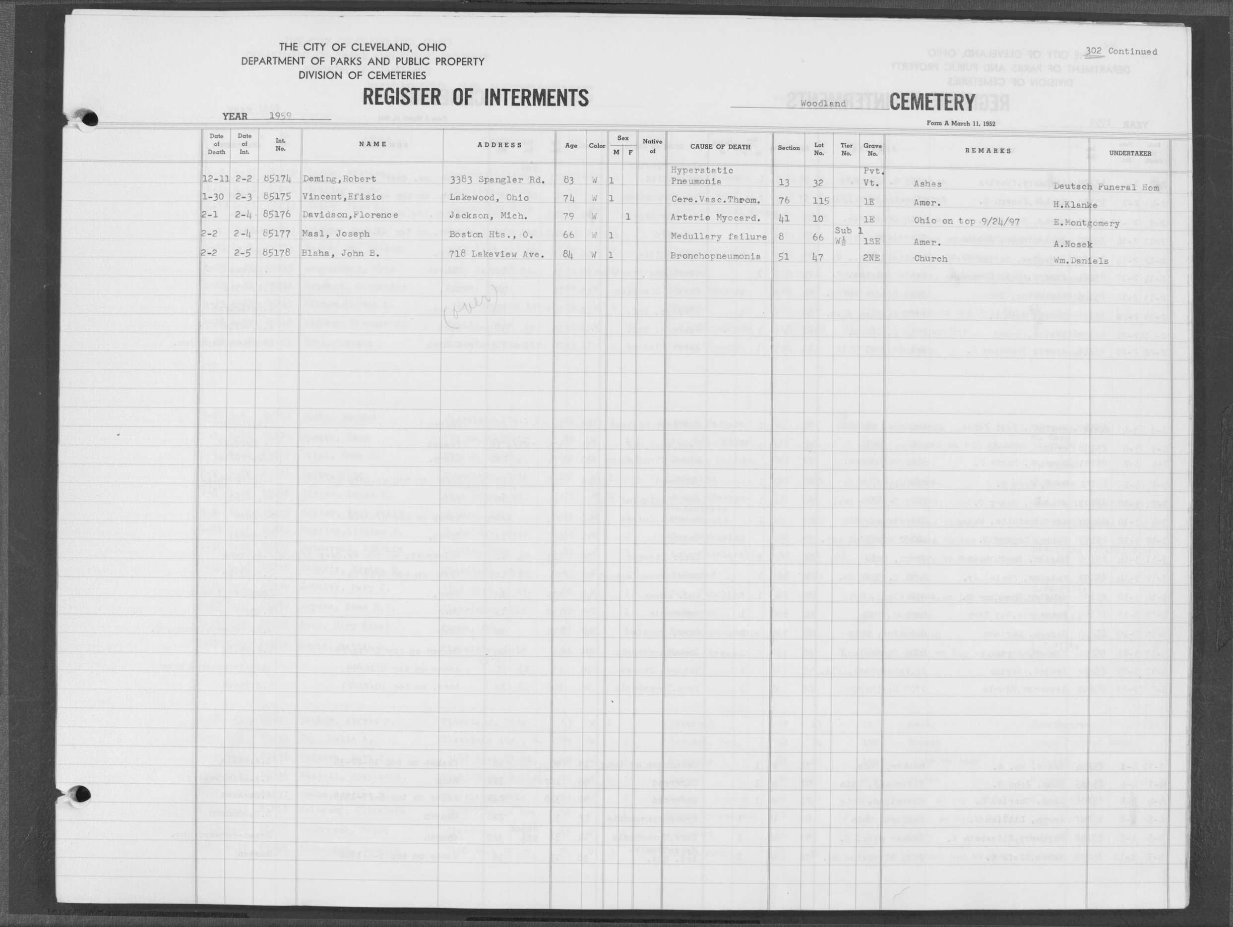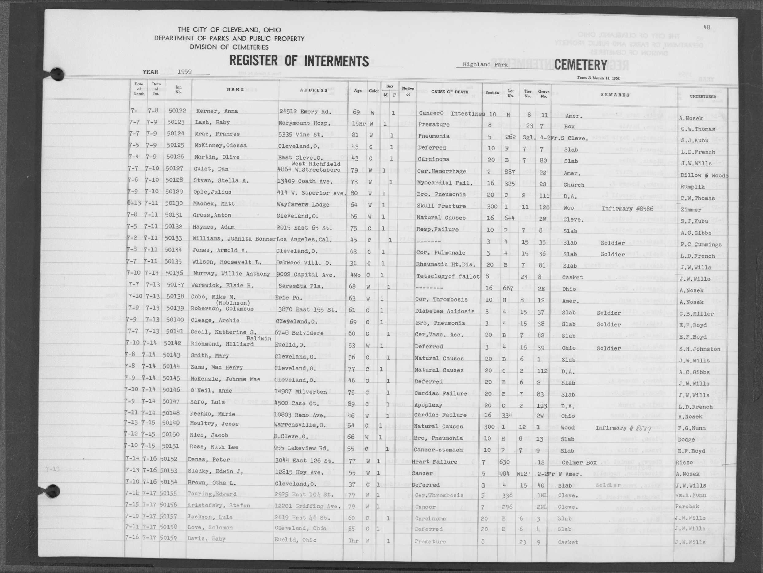 | Highland Park | 5 | 361 | Dec | 30 | 1956 | Jan | 5 | 1957 | 46277 | Deadwyler, Will H | 59y | C | M | |