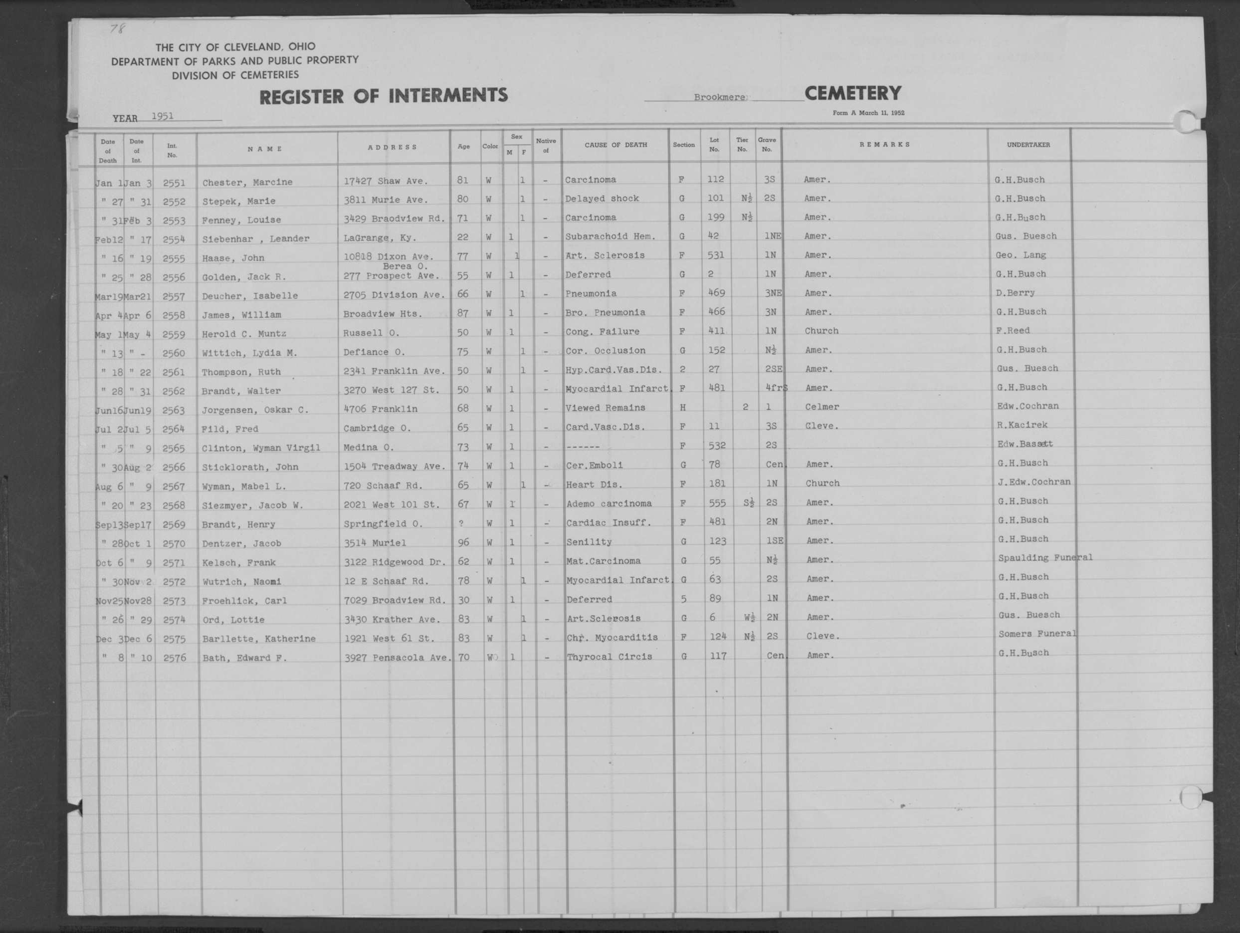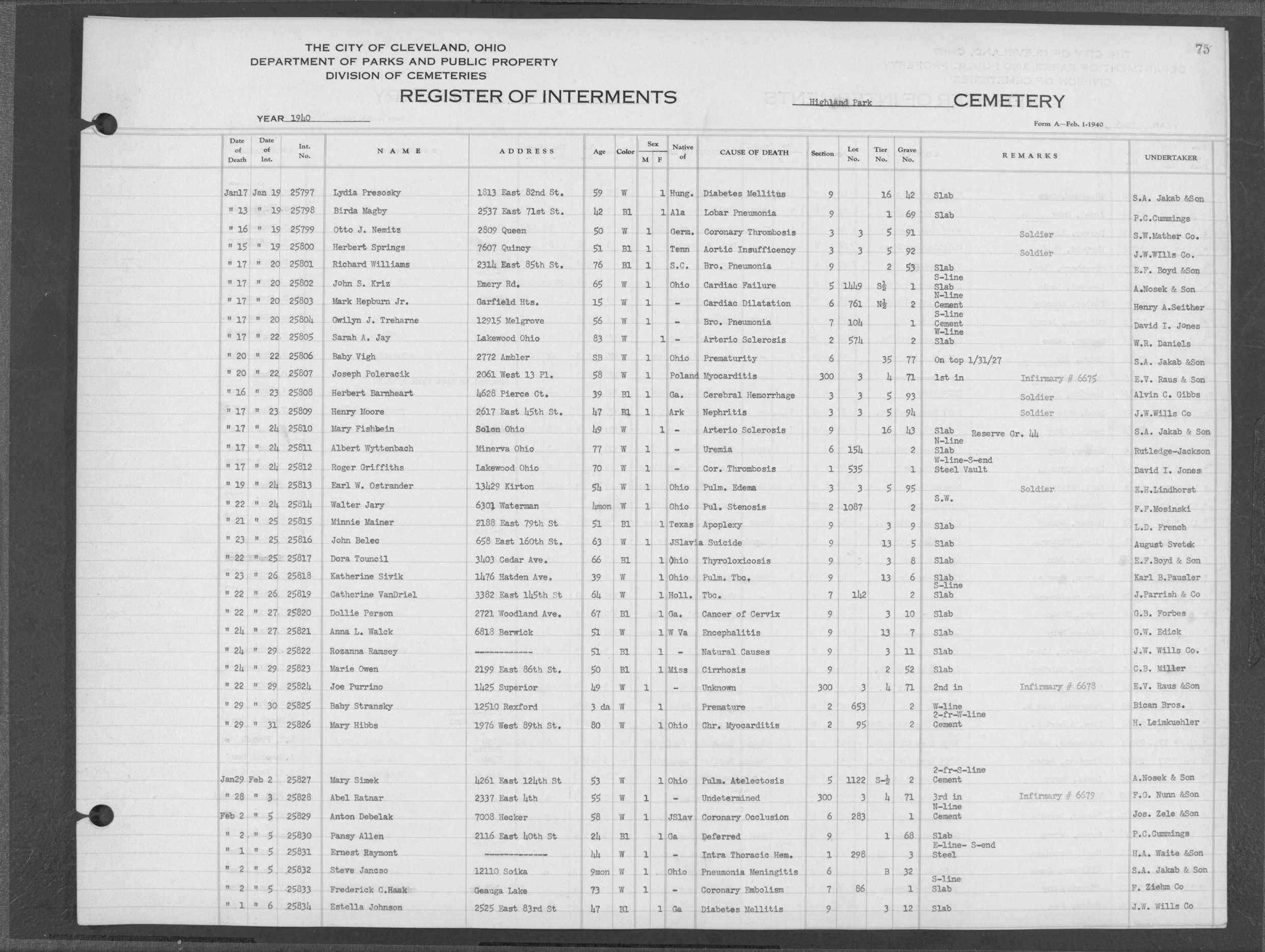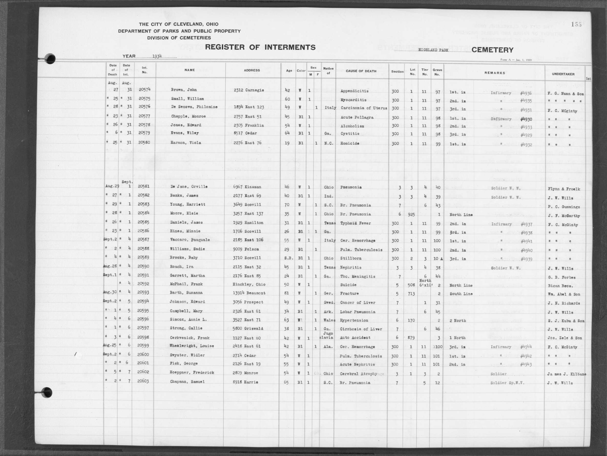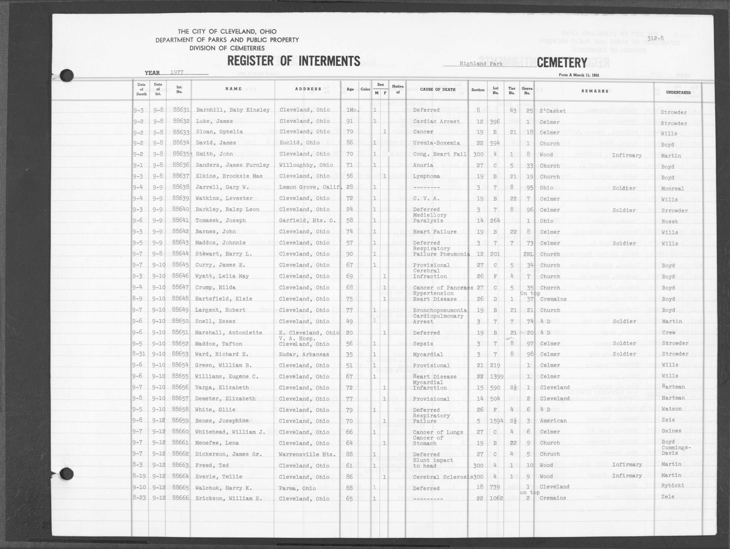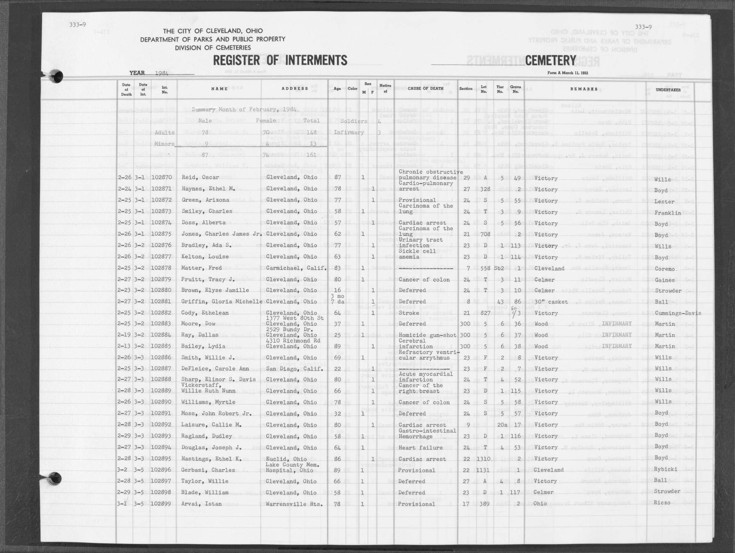 | Highland Park | 5 | 361 | Dec | 30 | 1956 | Jan | 5 | 1957 | 46277 | Deadwyler, Will H | 59y | C | M | |