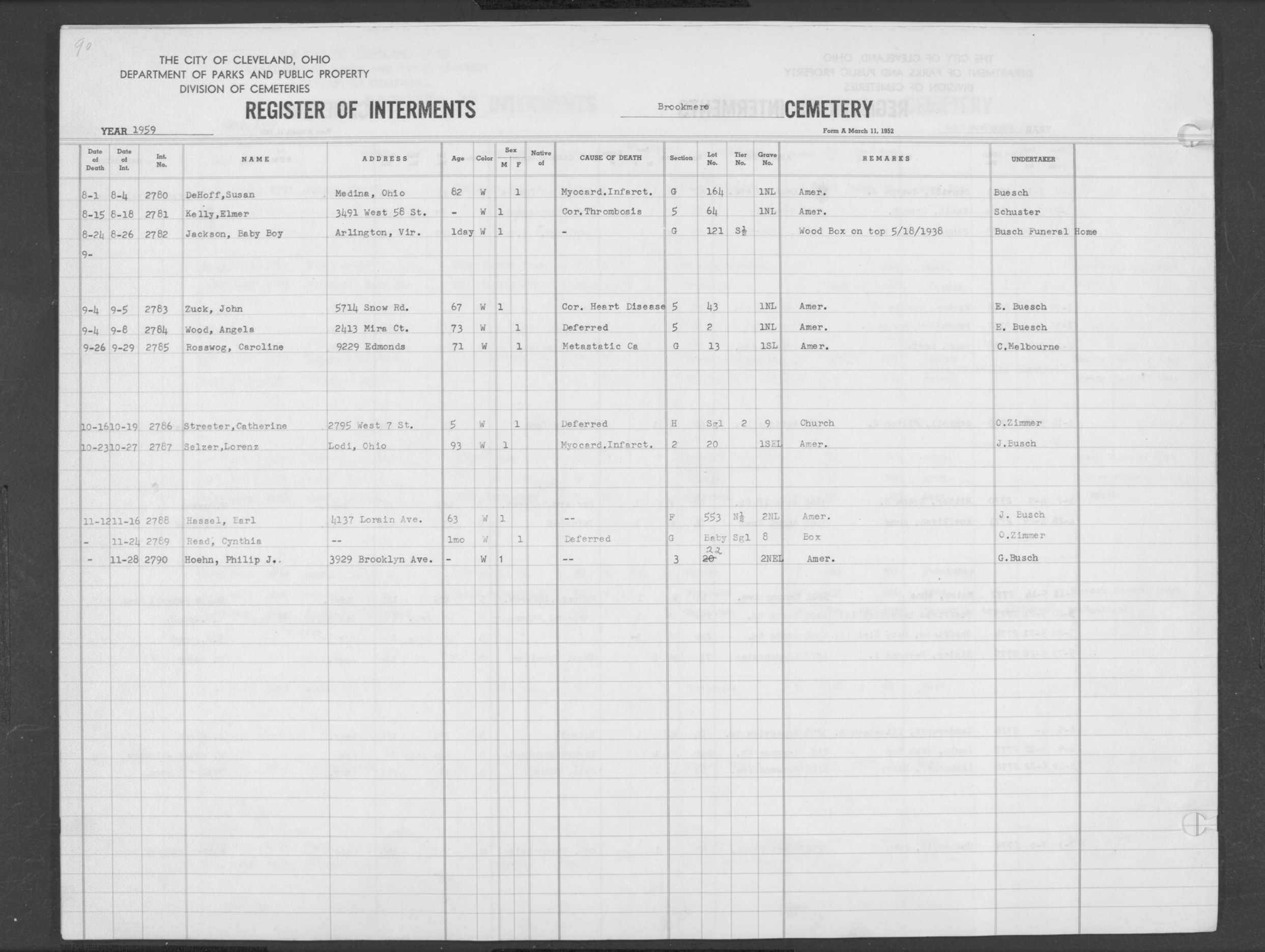 | Highland Park | 6 | 34 | Mar | 19 | 1959 | Mar | 25 | 1959 | 49628 | Deal, Edgar | 56y | C | M | |