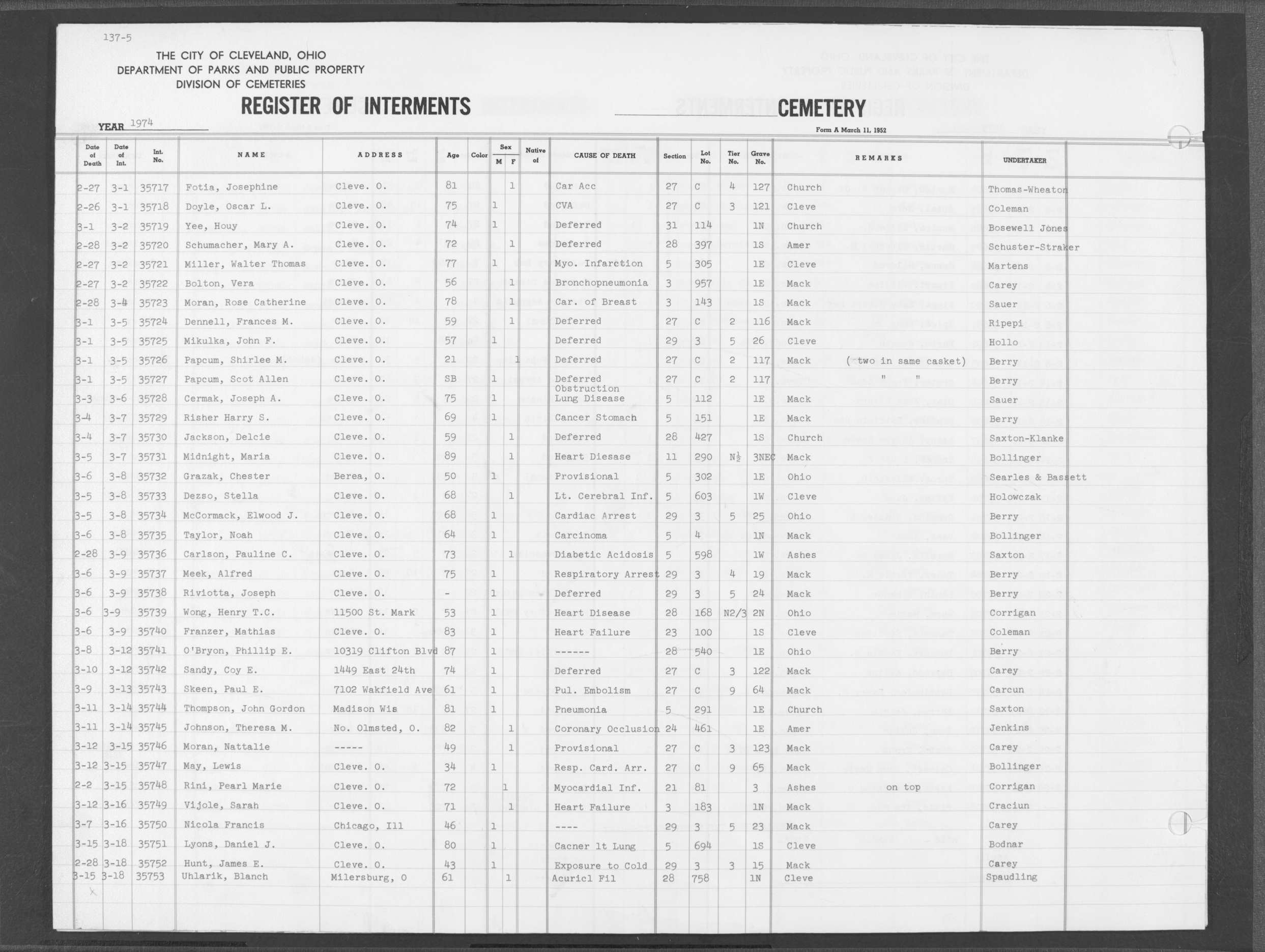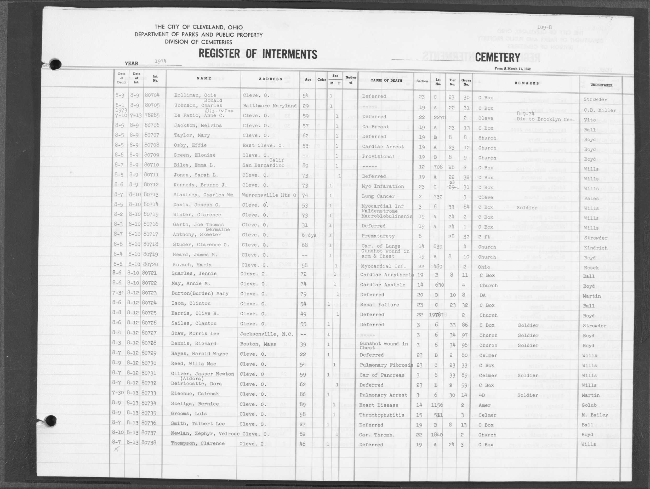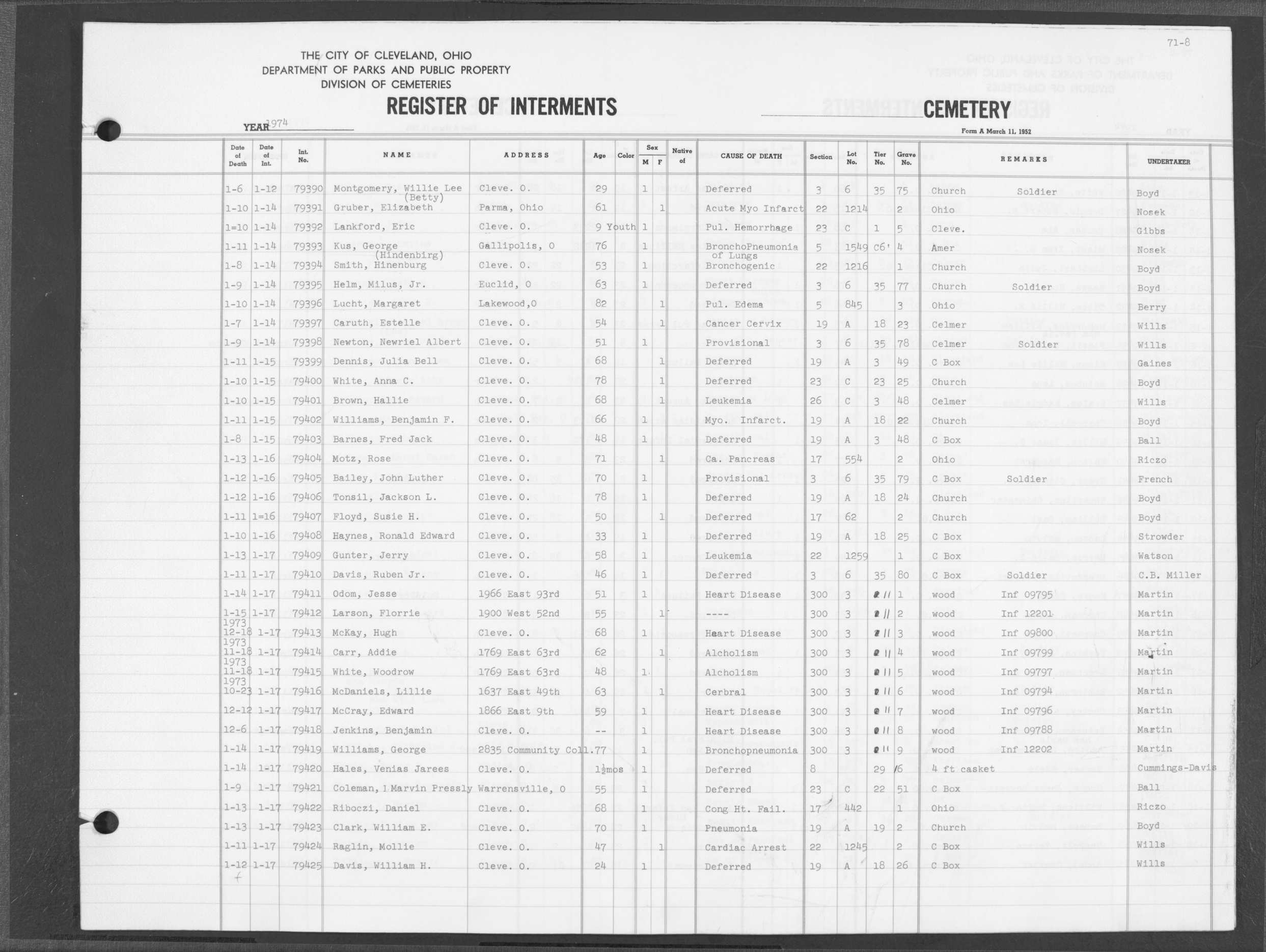 | West Park | 5 | 140 | Apr | 27 | 1974 | Apr | 30 | 1974 | 35826 | Deal, Walter | 74y | M | ||