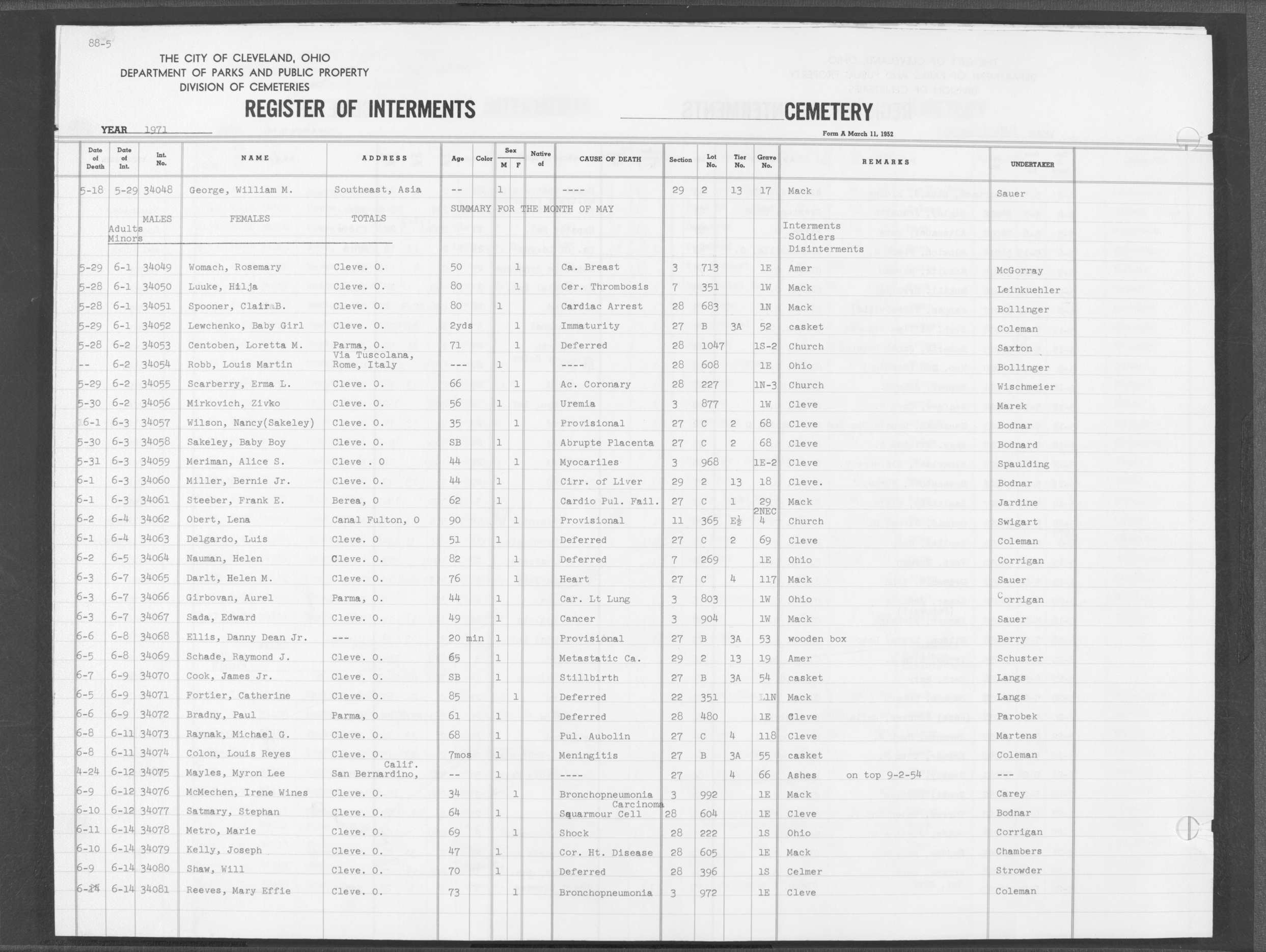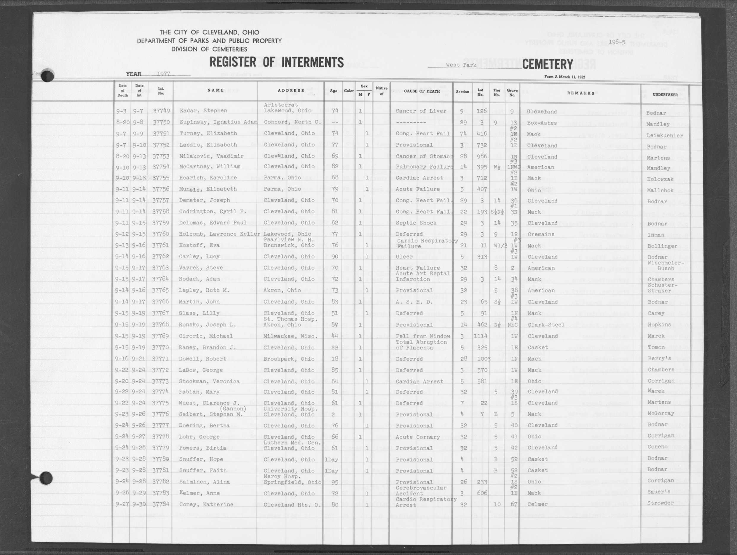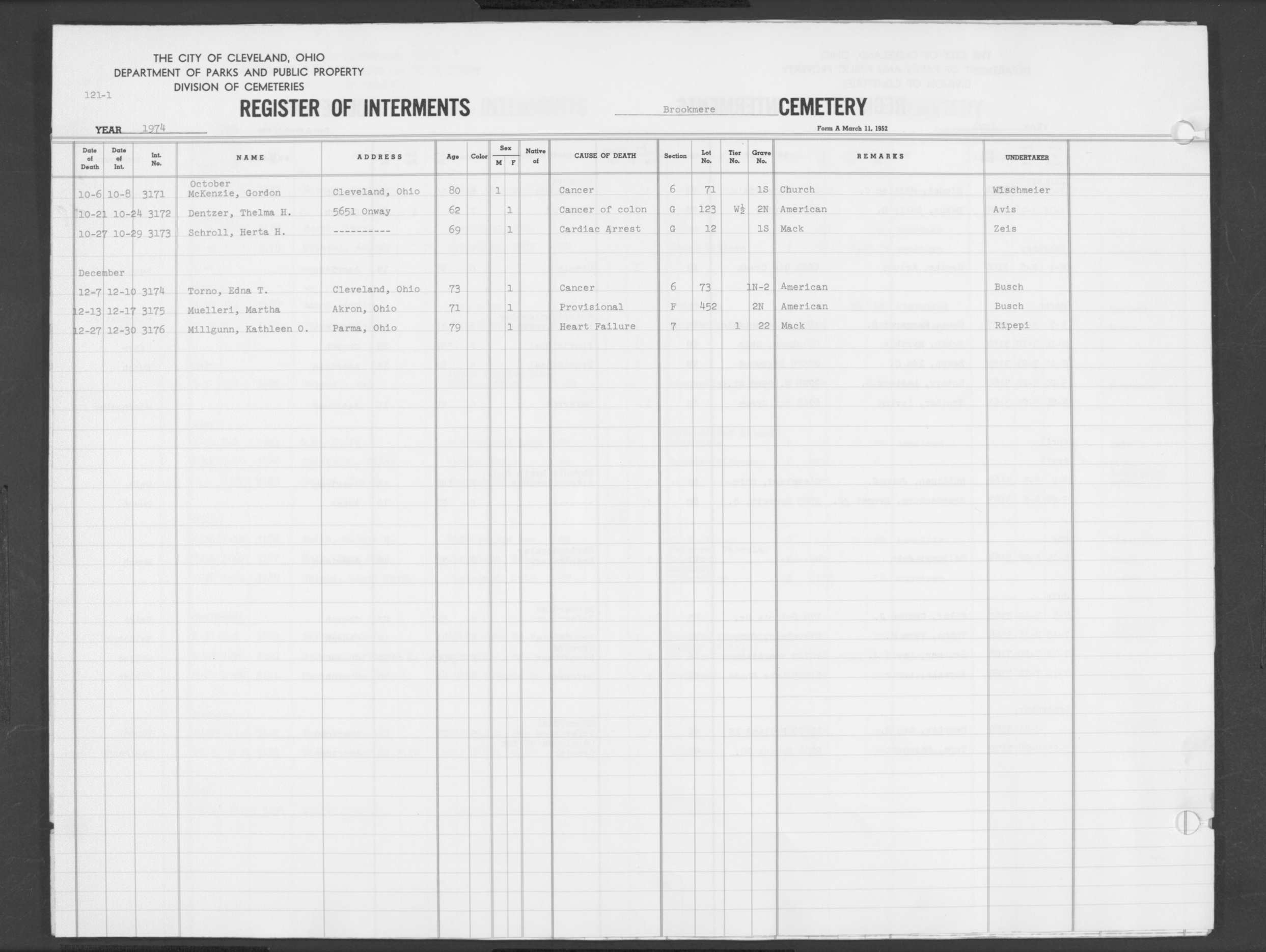 | West Park | 5 | 140 | Apr | 27 | 1974 | Apr | 30 | 1974 | 35826 | Deal, Walter | 74y | M | ||