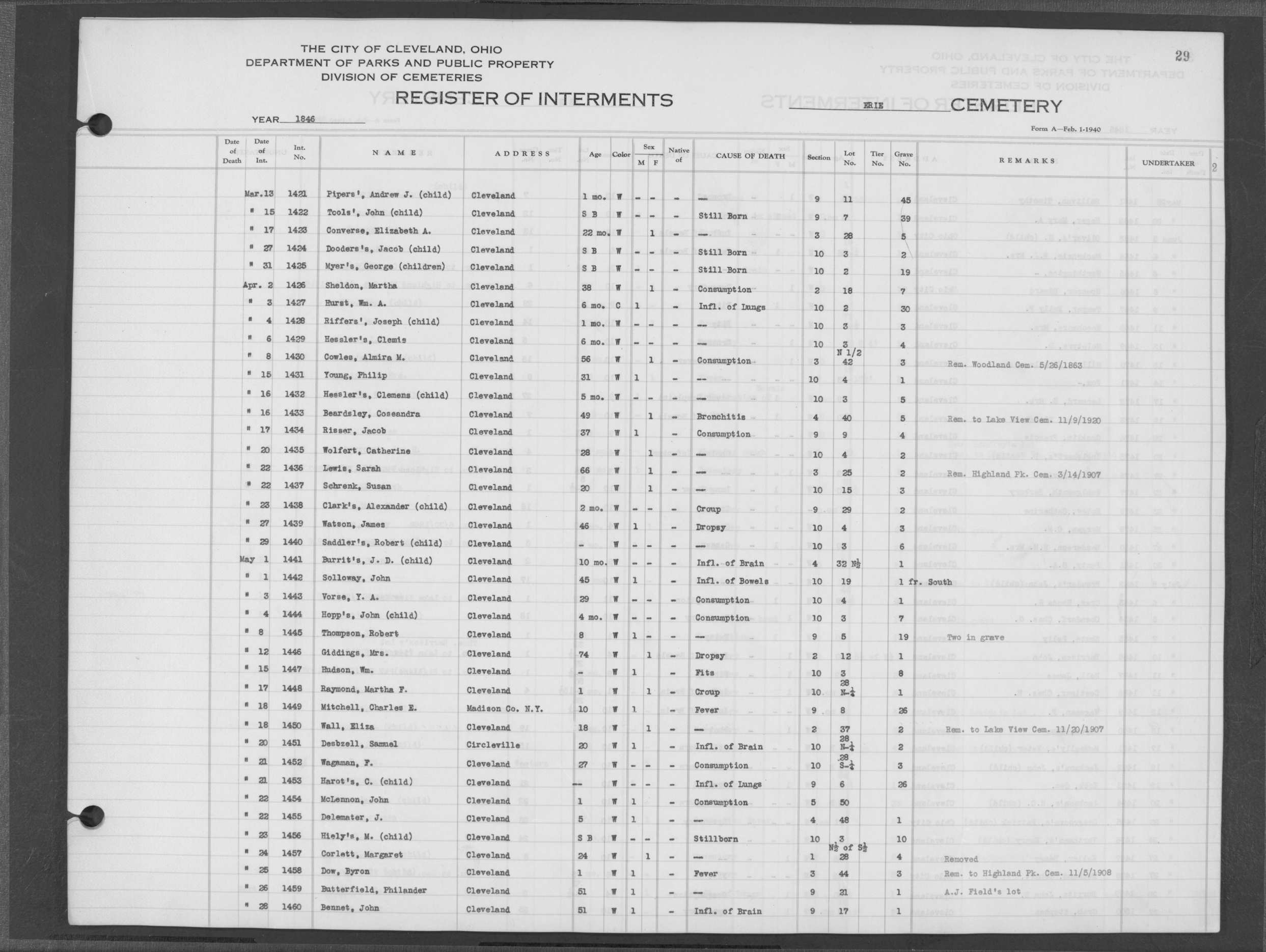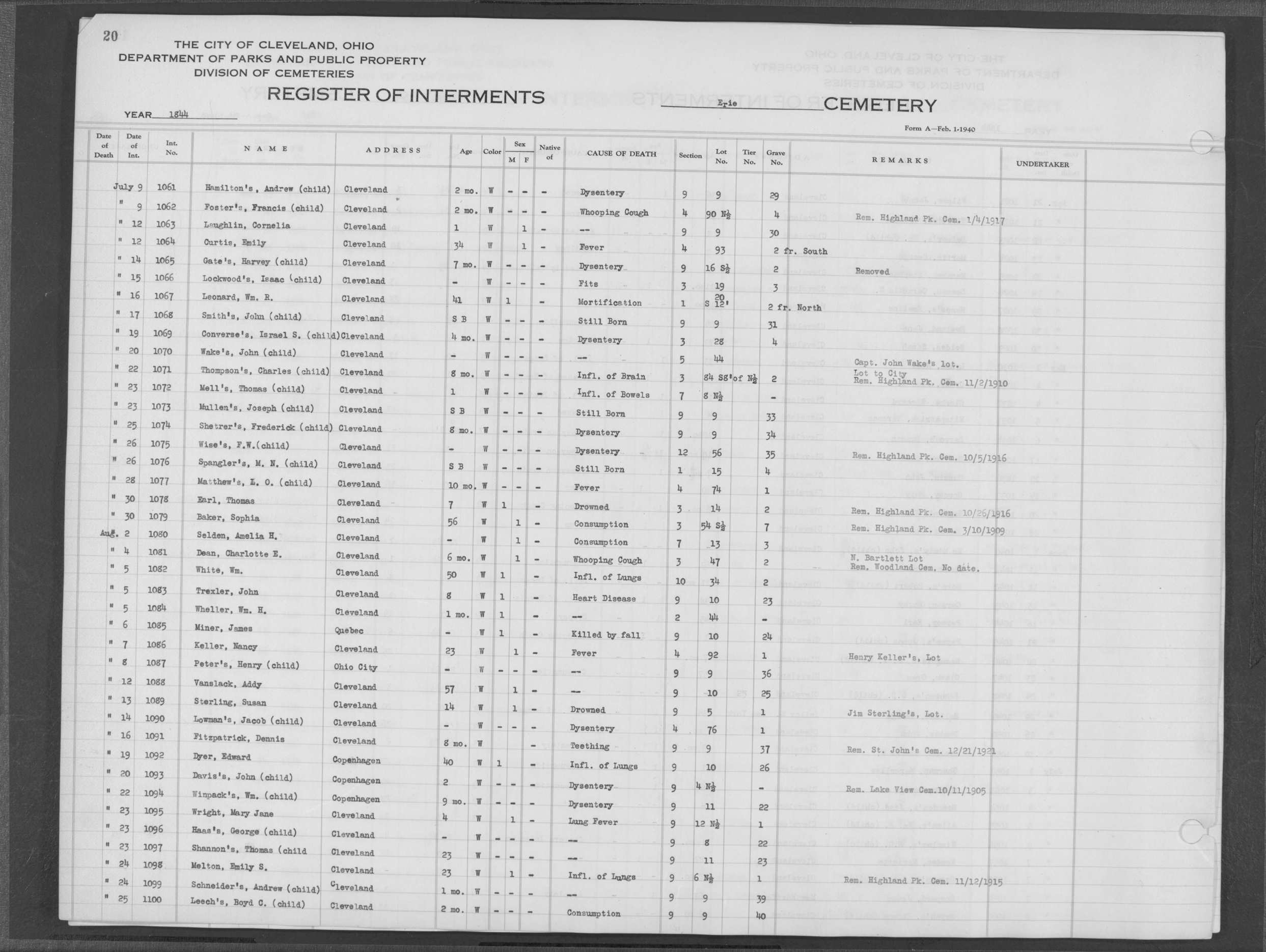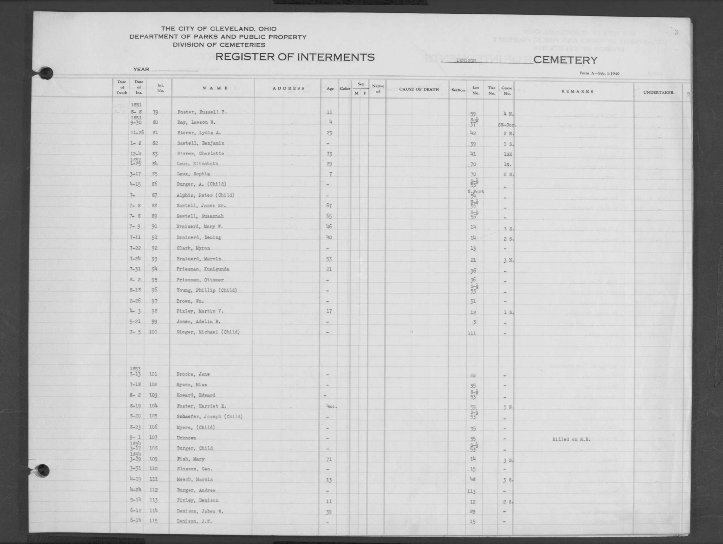 | Erie Street | 1 | 107 | Jul | 16 | 1852 | 4530 | Dean, | Child of Mr | 18m | W | F | |||
